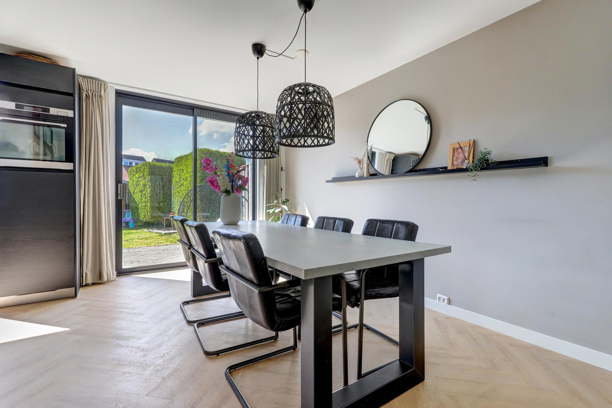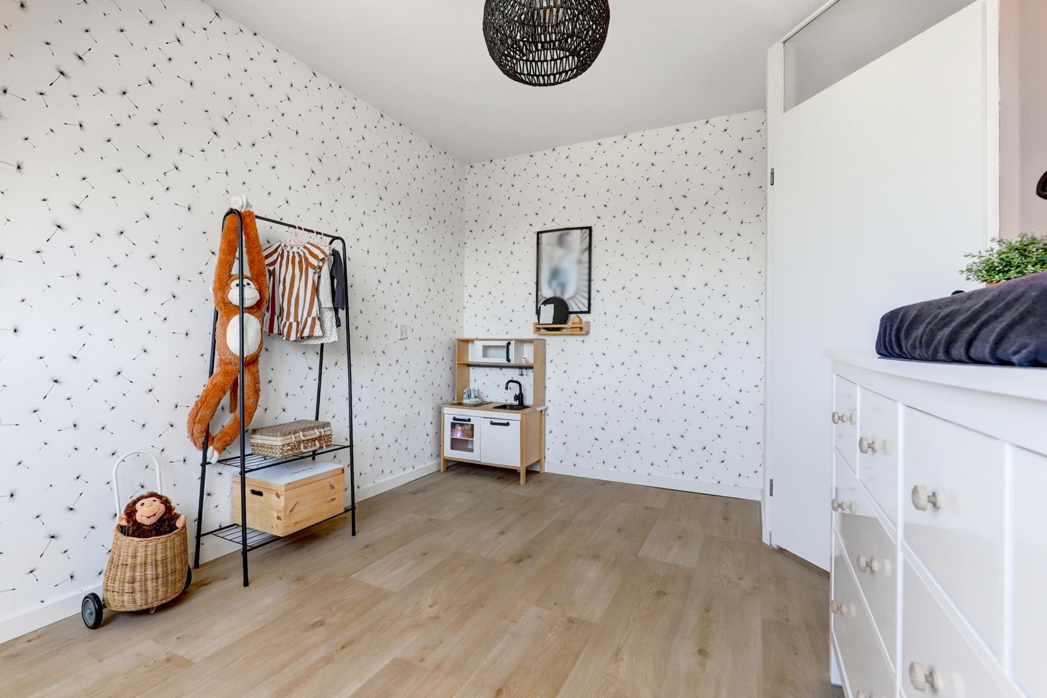 In de woonkamer en keuken is een visgraat pvc vloer gelegd (2022).