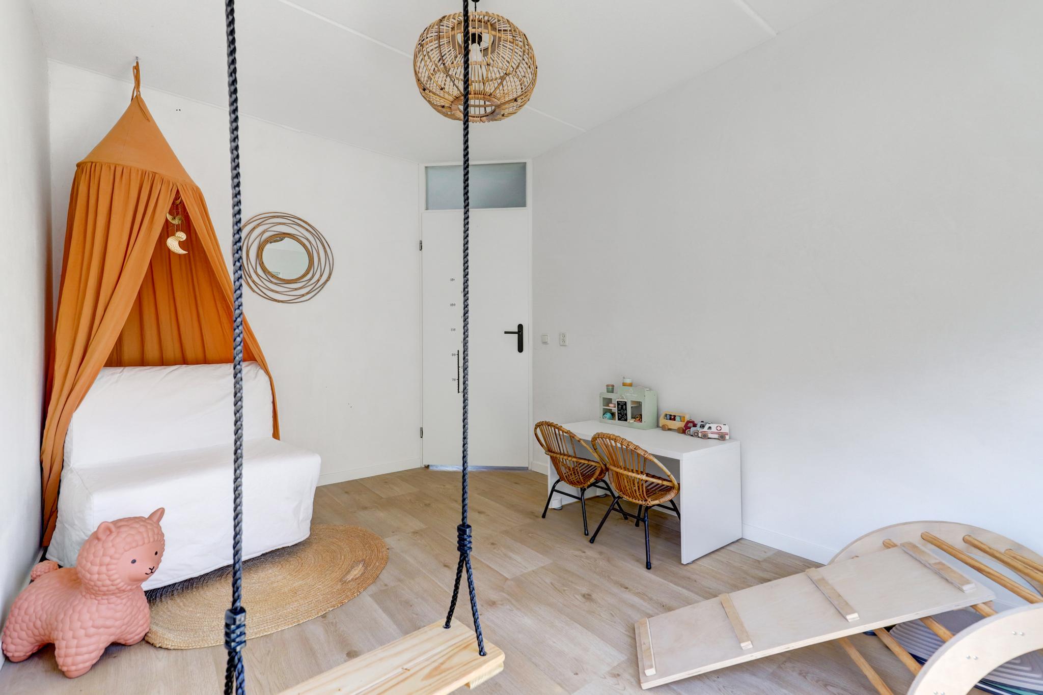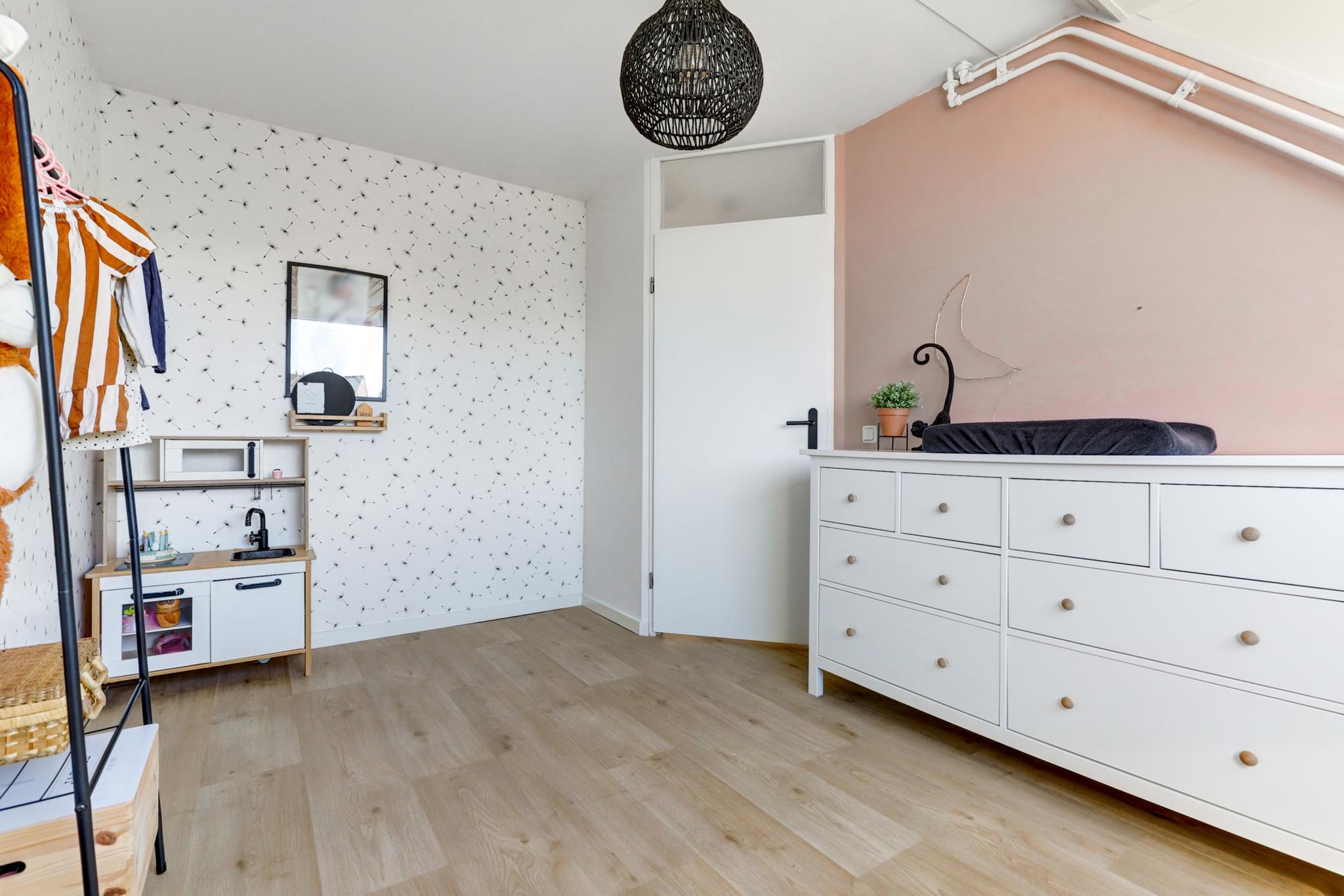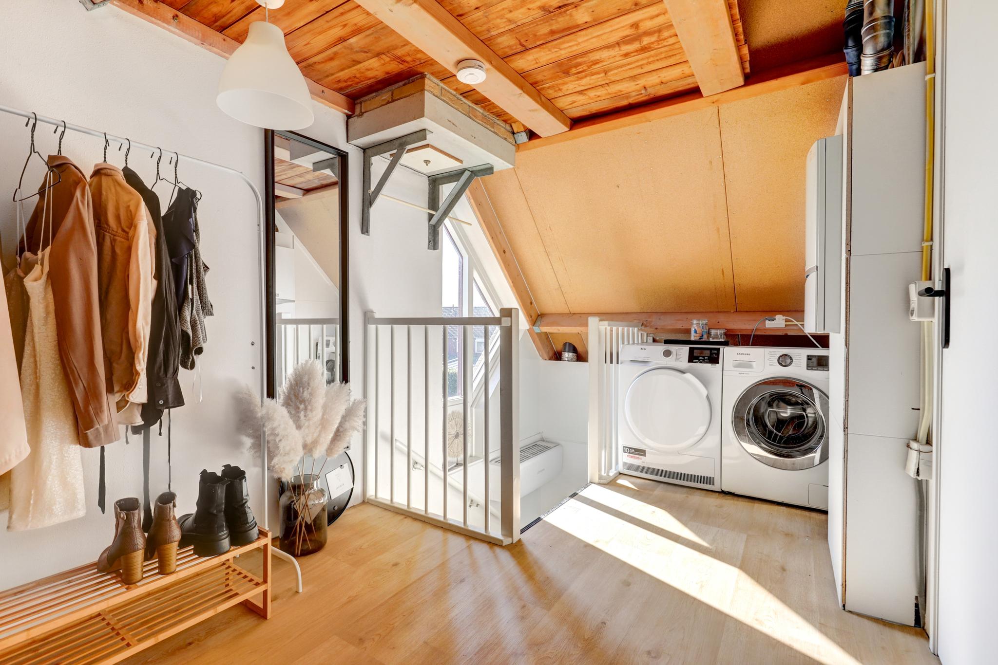 2e verdieping: middels vaste trap te bereiken royale voorzolder met de witgoedaansluitingen en de cv-opstelling. 4e slaapkamer voorzien van een Velux-dakraam en een ruime dakkapel met elektrisch bedienbare rolluiken, wastafel met meubel en praktische schuifkastenwand.