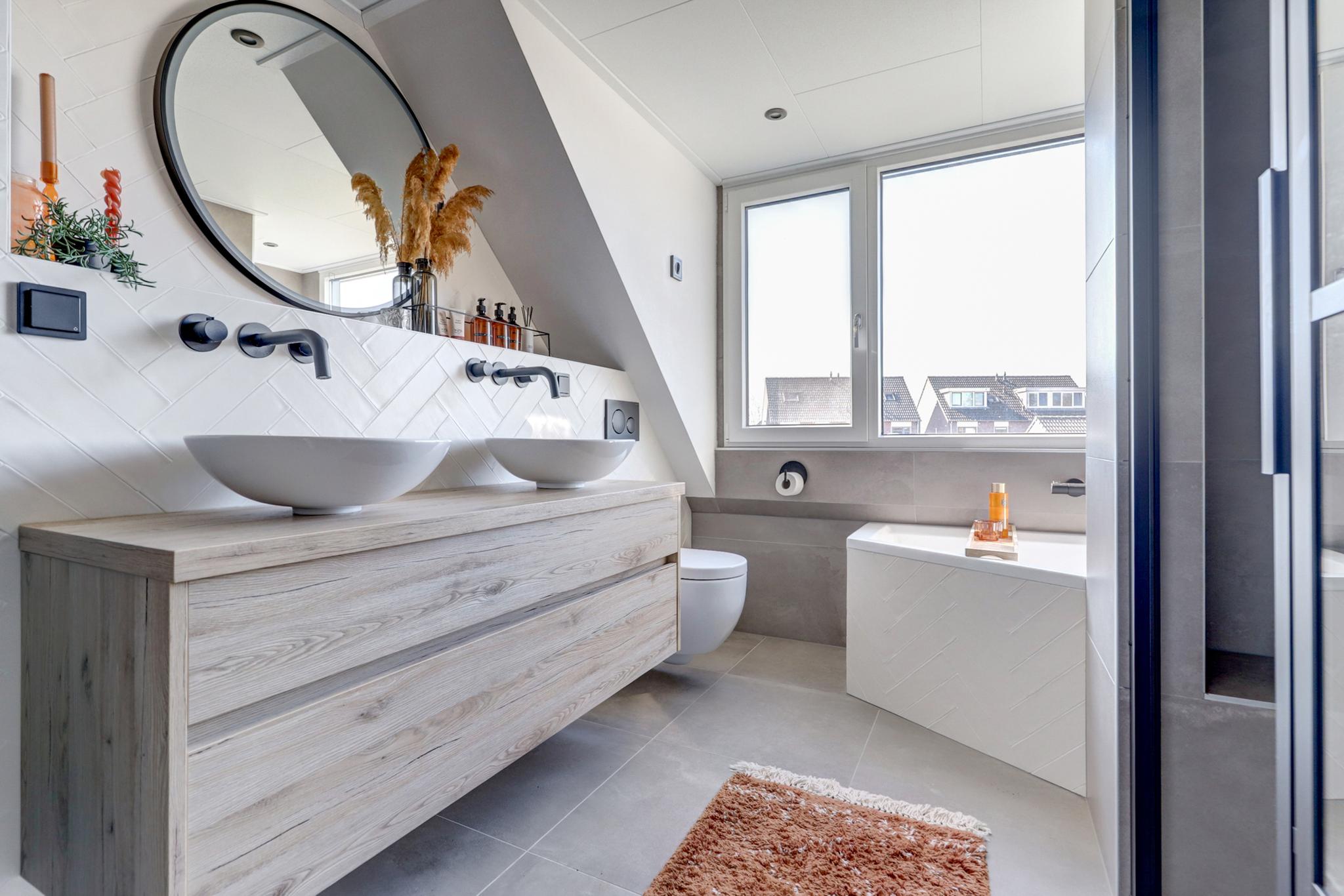 1e verdieping: overloop, 3 ruime slaapkamers, waarvan de slaapkamer en badkamer aan de achterzijde zijn voorzien van een dakkapel met elektrisch bedienbare rolluiken. Luxe en sfeervolle badkamer voorzien van een ligbad, inloopdouche, wandcloset, dubbele wastafel met meubel en designradiator.