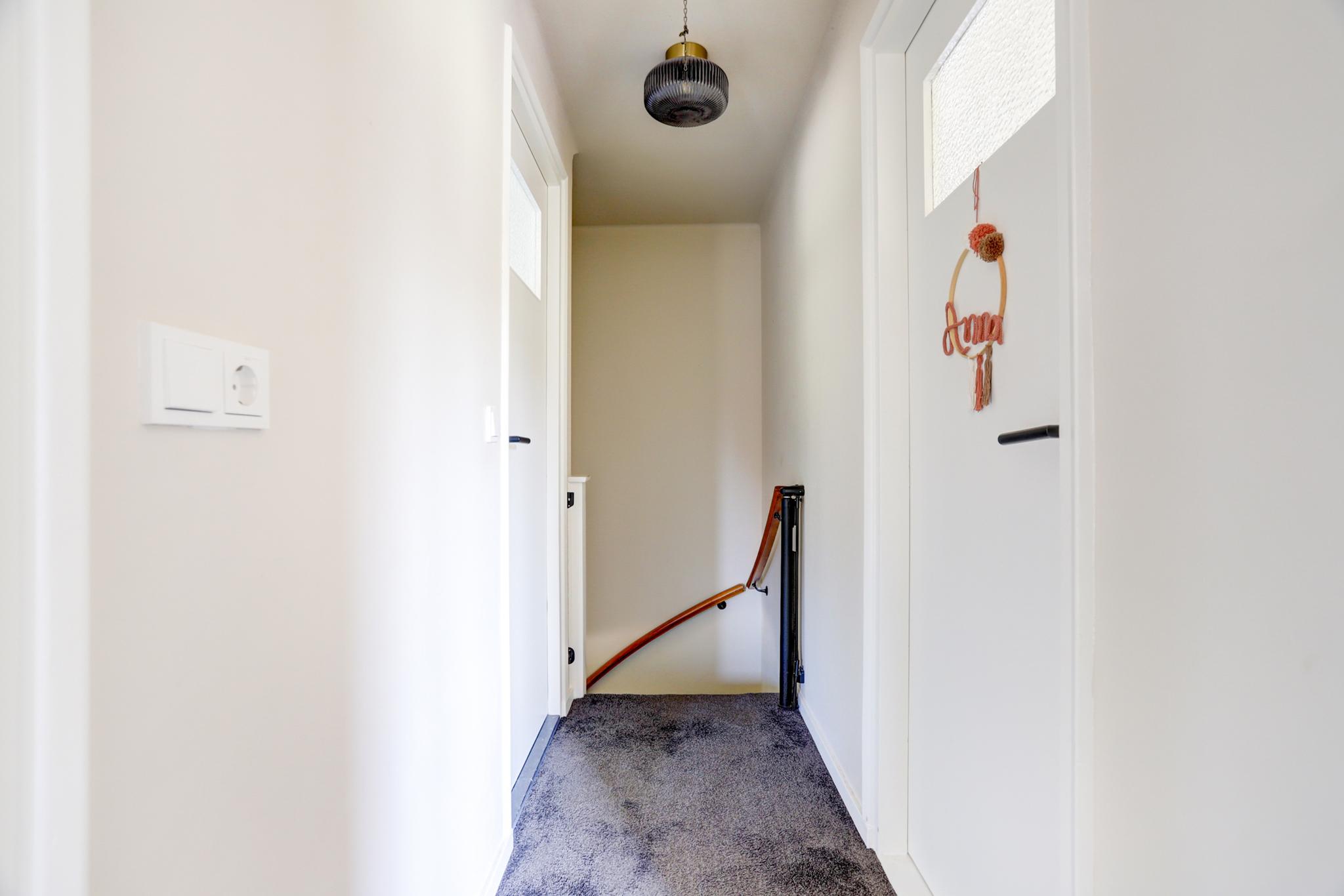 Begane grond: hal met meterkast en toegang tot de provisiekelder. Een speels ingedeelde woonkamer met erker aan…