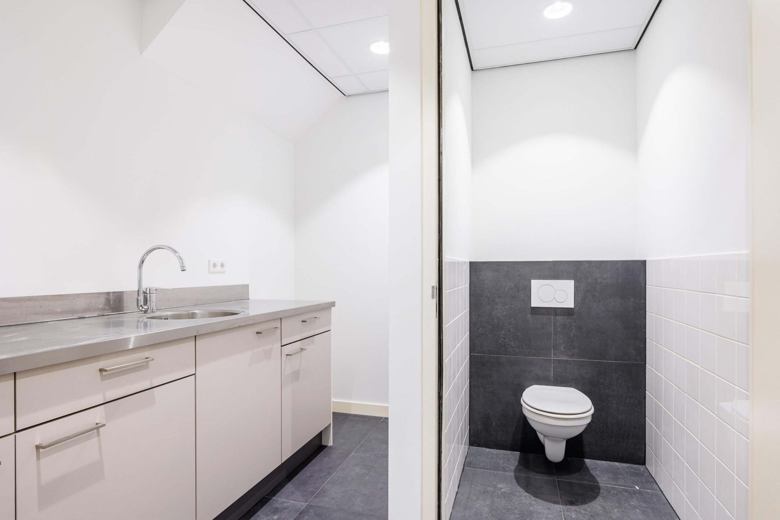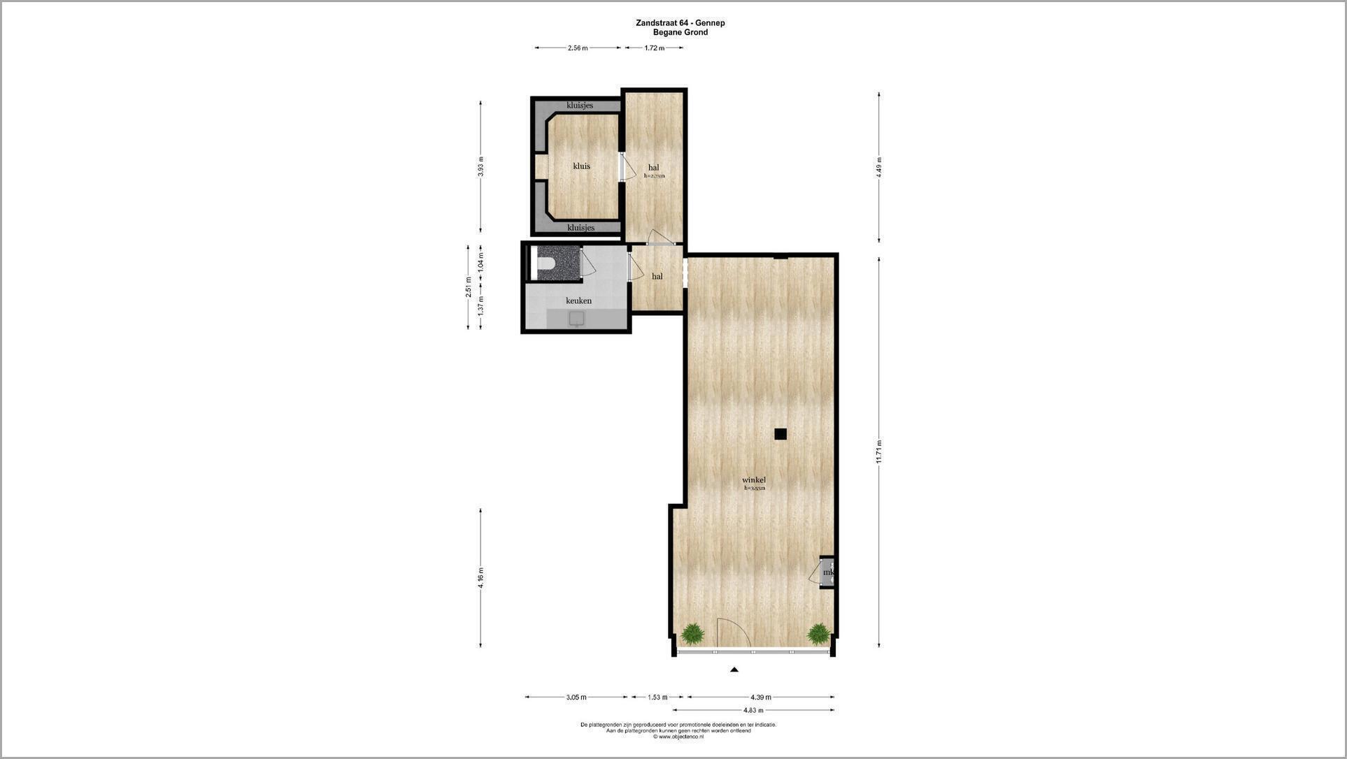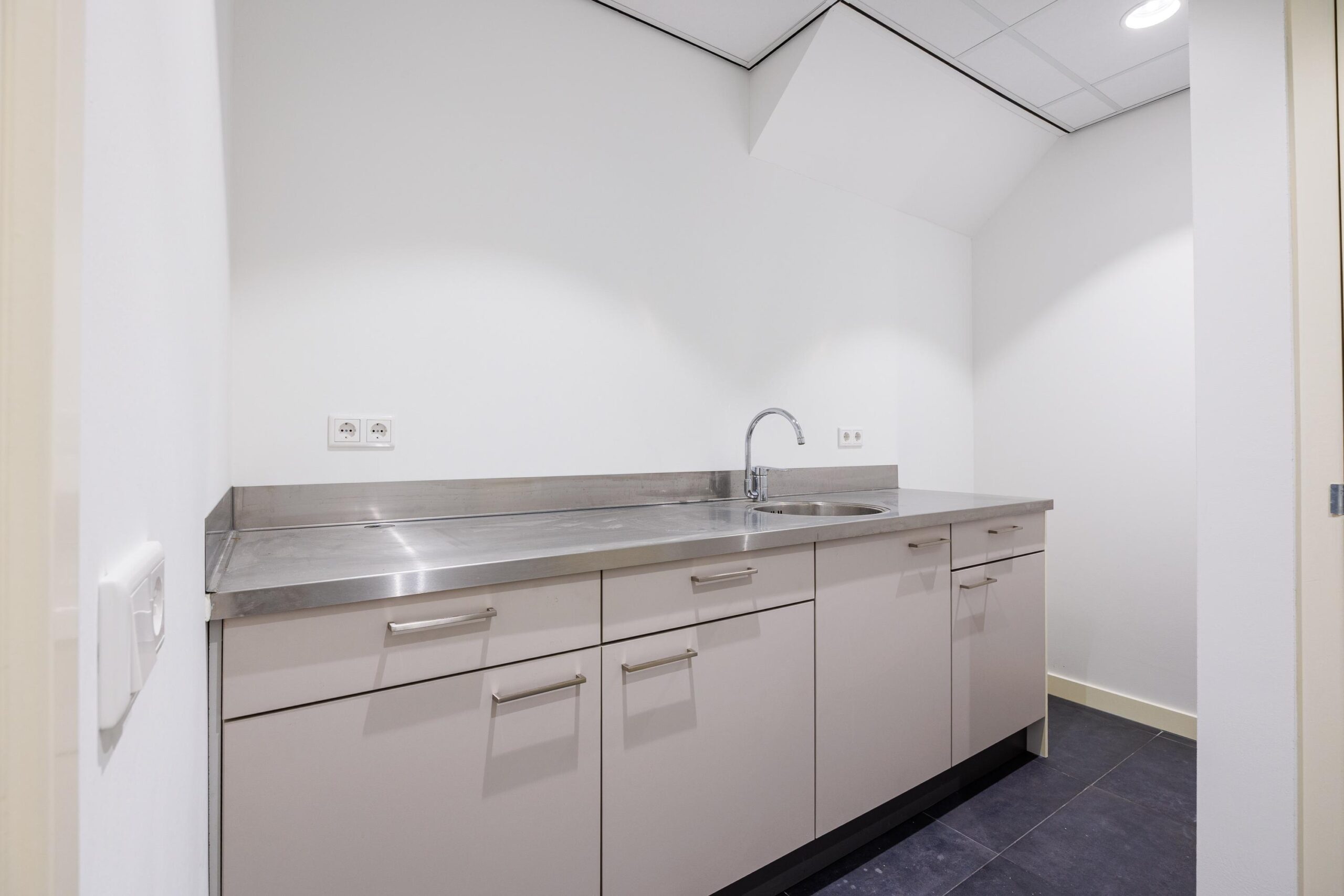 Kantoor-/ winkelruimte, portaal, pantry met een keukenblokopstelling voorzien van een close-in boiler, toiletruimte, portaal en kluisruimte.