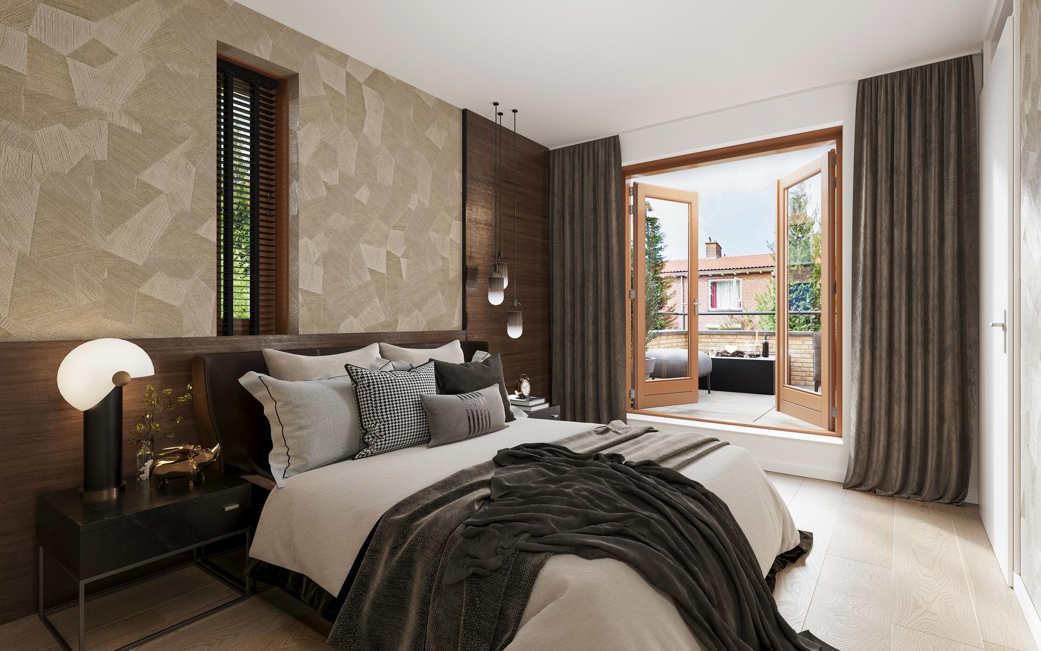 • Slaapkamer op de begane grond met zicht op de patio en badkamer en suite met inloopdouche, toilet en wastafel.