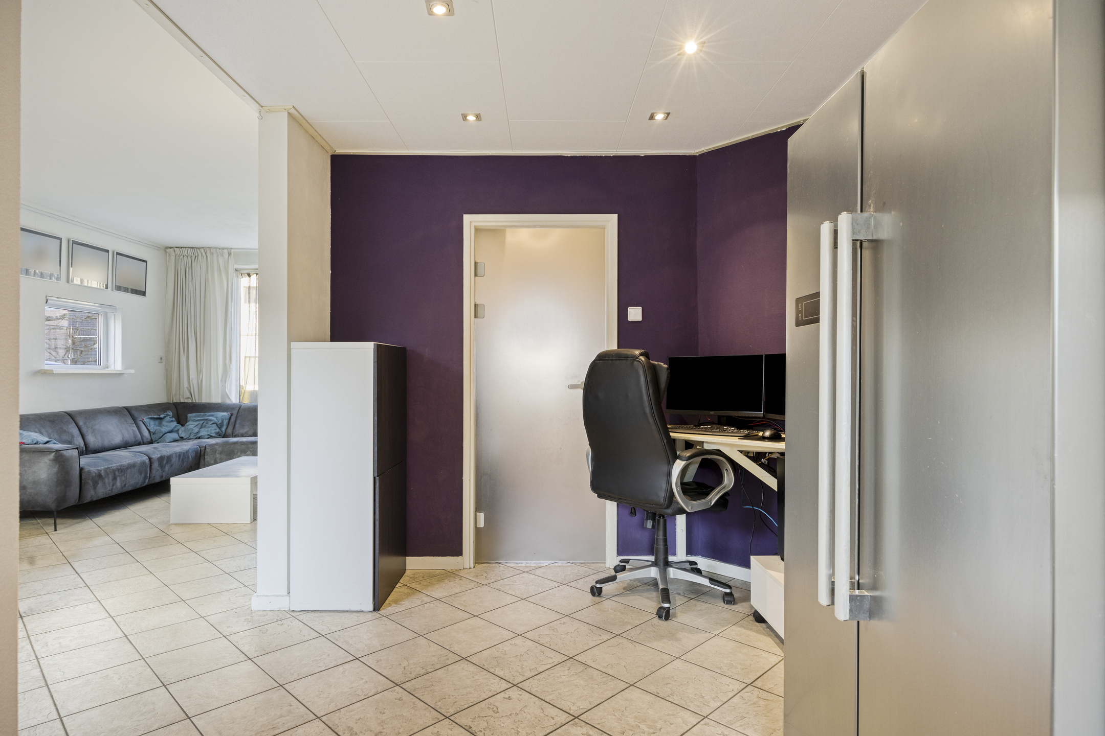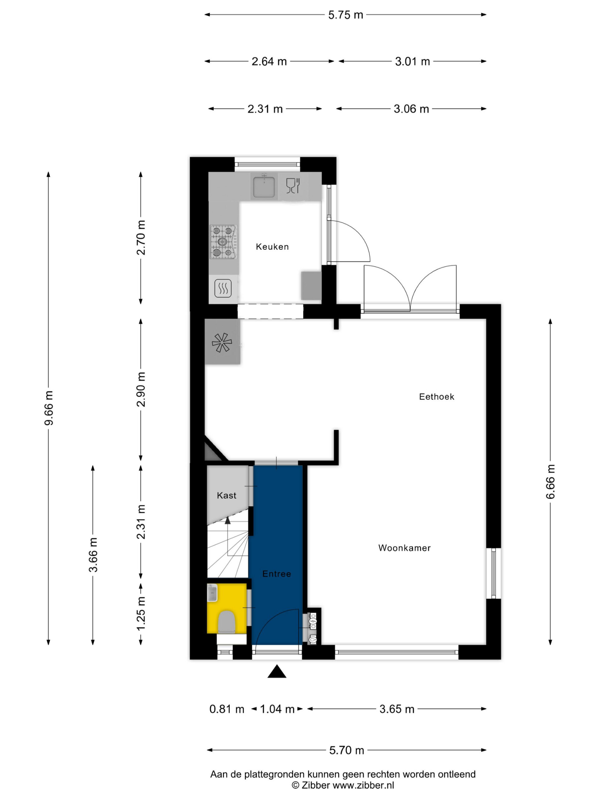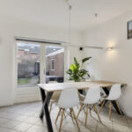 Begane grond: hal met meterkast, trapkast en toilet. Ruime en lichte woonkamer met openslaande tuindeuren, halfopen keuken met inbouwapparatuur.