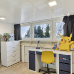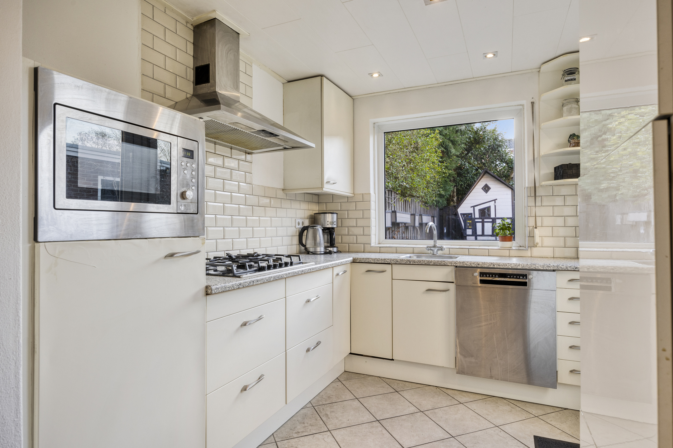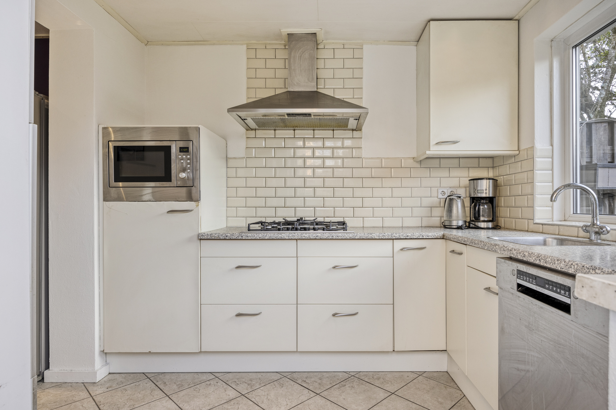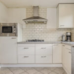 De keukenopstelling is voorzien van een gaskookplaat met afzuigkap, combioven, vaatwasser een een koel-/ vriescombinatie.