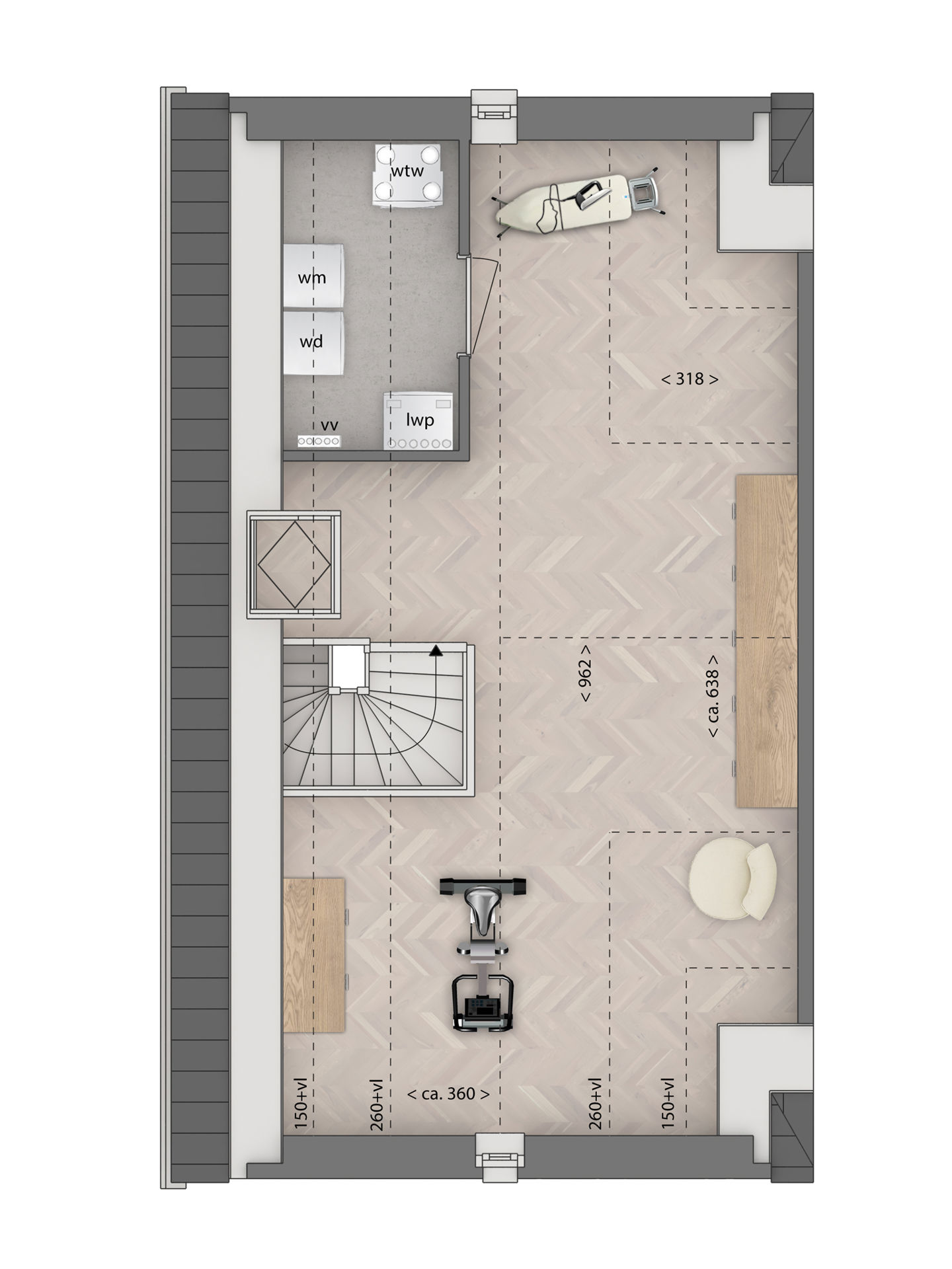 Je komt via de zijentree binnen in de hal met toilet en trapopgang en loopt vervolgens door naar de royale U-vormige woonkamer. Voorin is plek voor een lekkere loungehoek en achterin vind je de volledig uitgeruste keuken met openslaande deuren richting de tuin. Alles staat in verbinding, en toch voelt elke hoek als een eigen plek. Op de 1e verdieping zijn er 3 slaapkamers, waarvan één woning breed. De badkamer in het midden beschikt over een ligbad, douche, toilet en wastafel. Daarnaast biedt de zolderverdieping, inclusief afgesloten technische ruimte met plek voor de wasmachine en droger, verrassend veel mogelijkheden en zorgt de dwarskap voor nog meer ruimte.