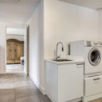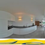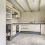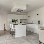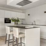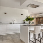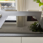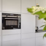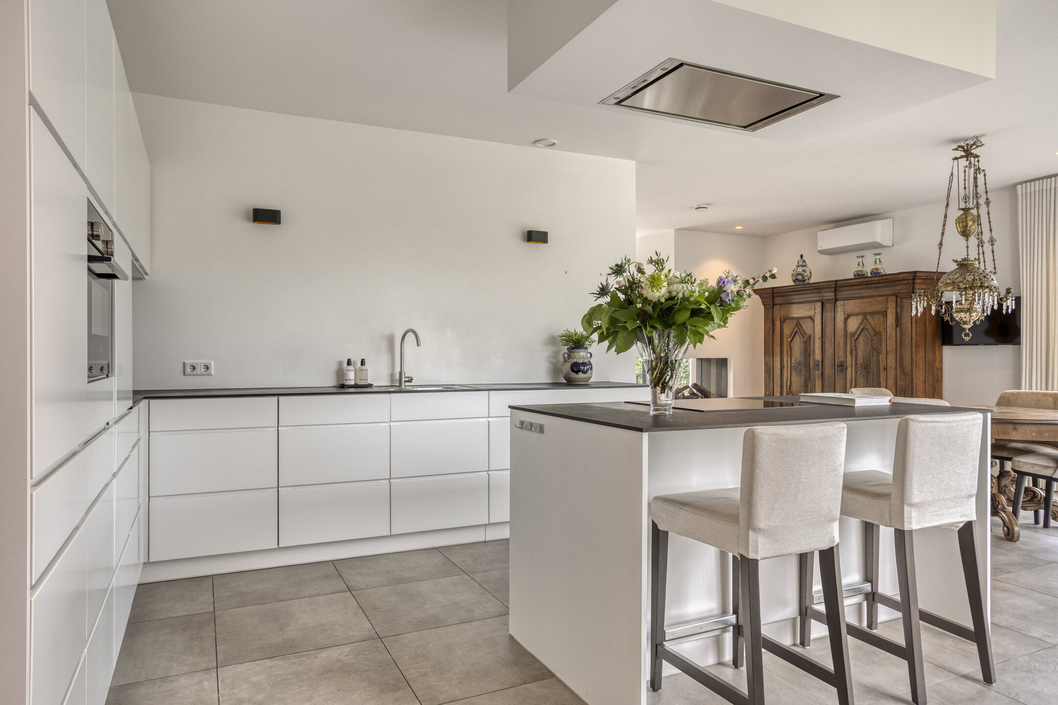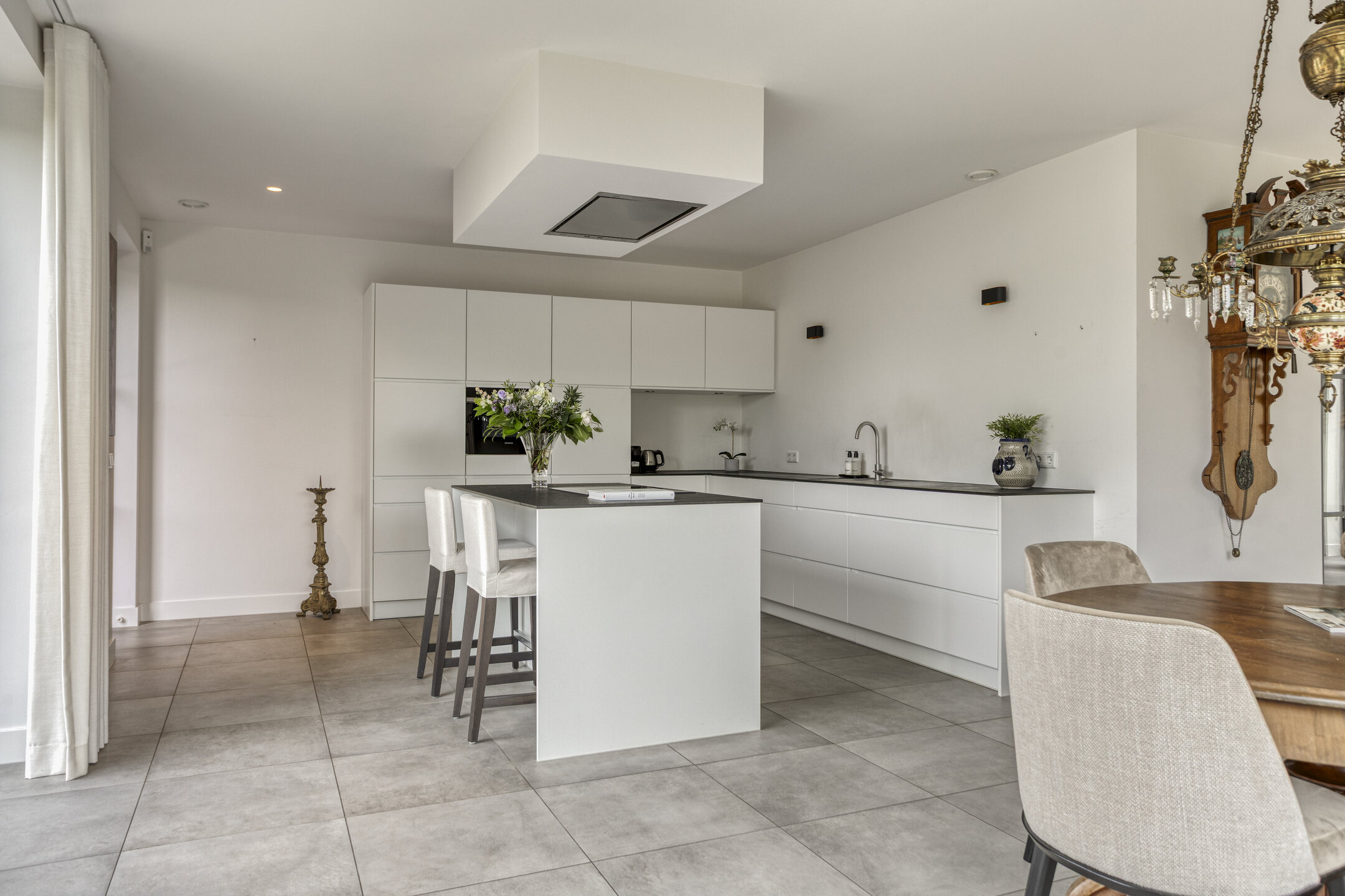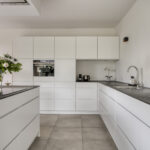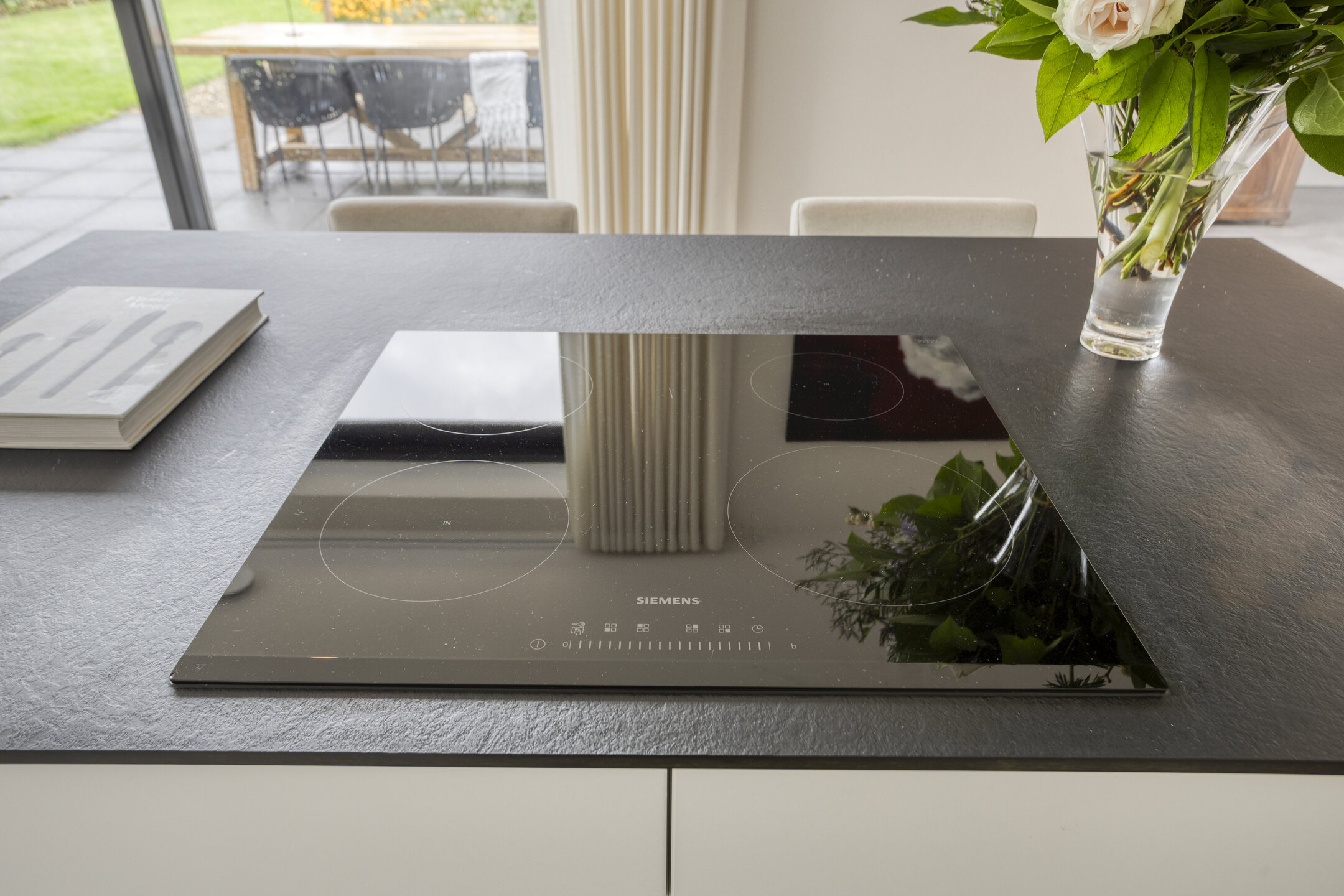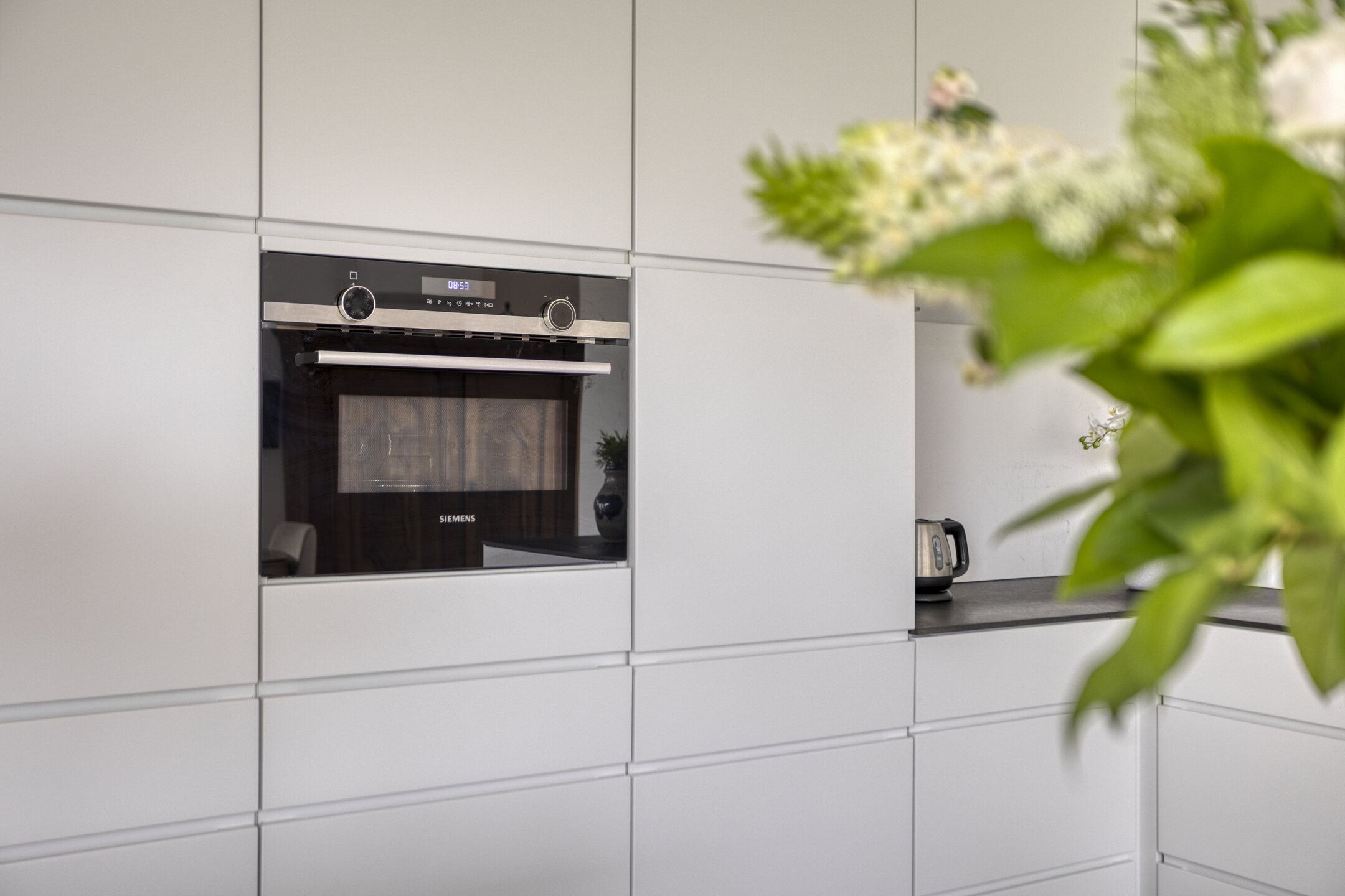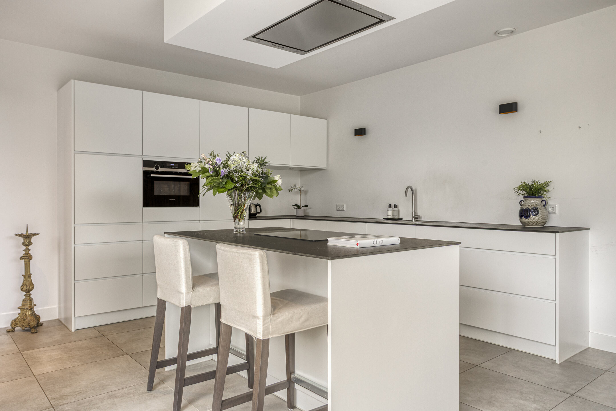 De keukenopstelling is voorzien van een inductiekookplaat, afzuigkap, 1½ spoelbak, combioven, vaatwasser en koelkast.
