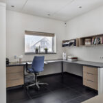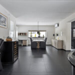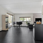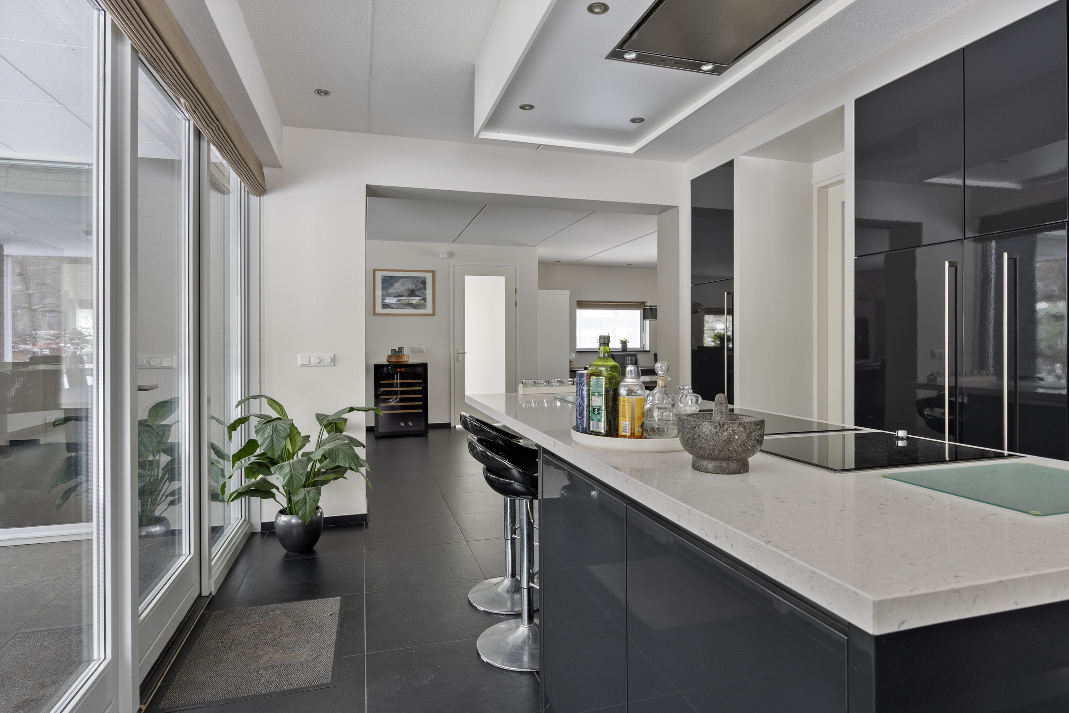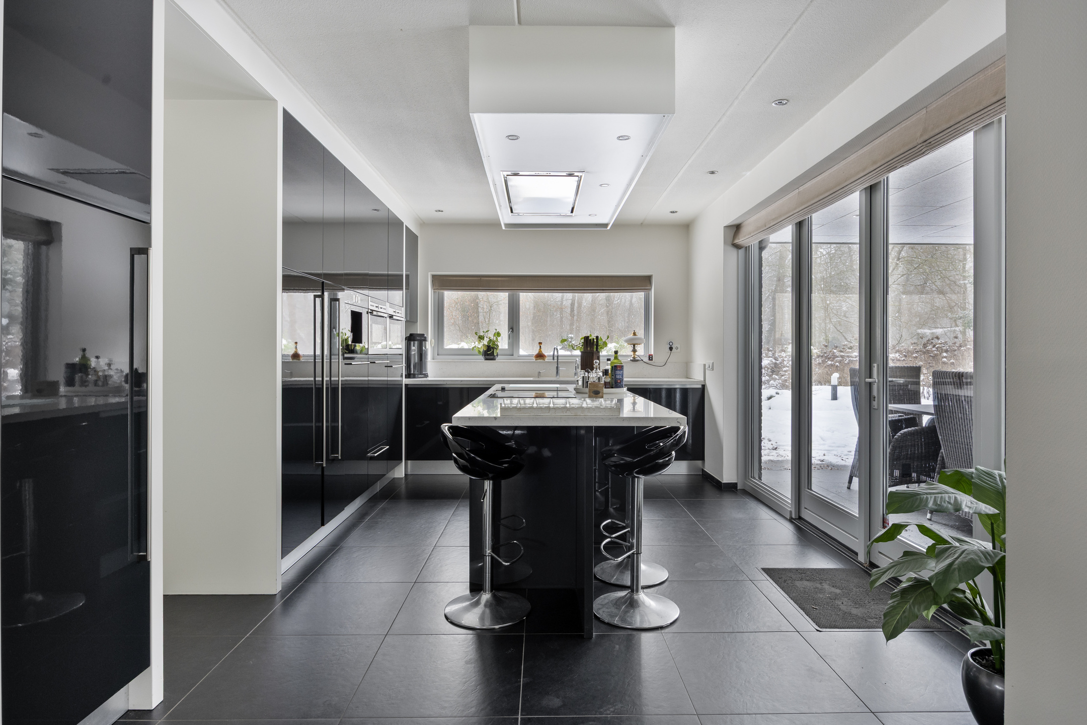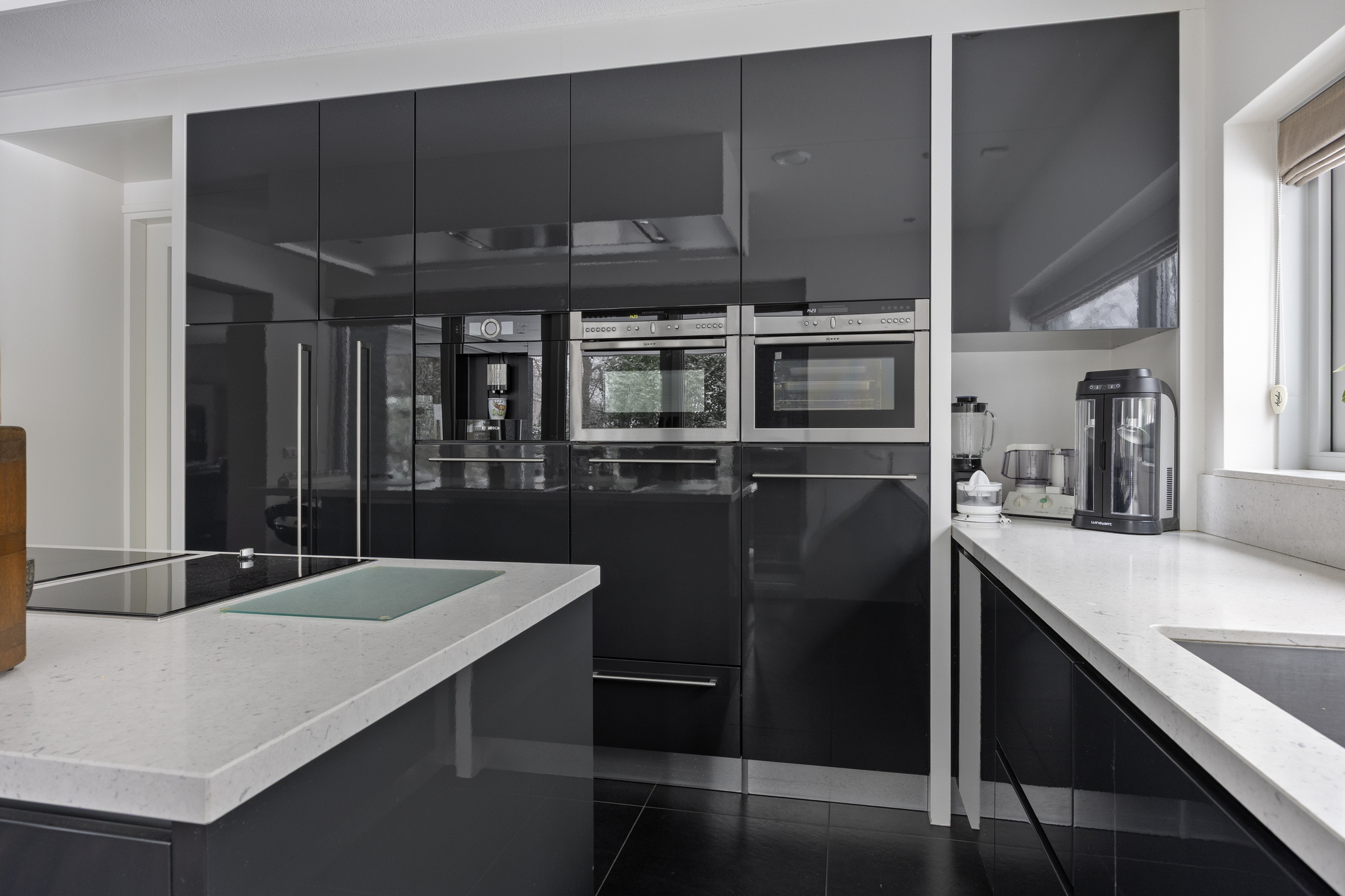 De keuken is voorzien van de volgende apparatuur; inductiekookplaat met wok-unit, koelkast, koffie-apparaat, combioven, stoomoven, vaatwasser en Quooker. Daarnaast is er een zitgedeelte aan het kookeiland.