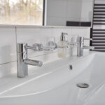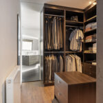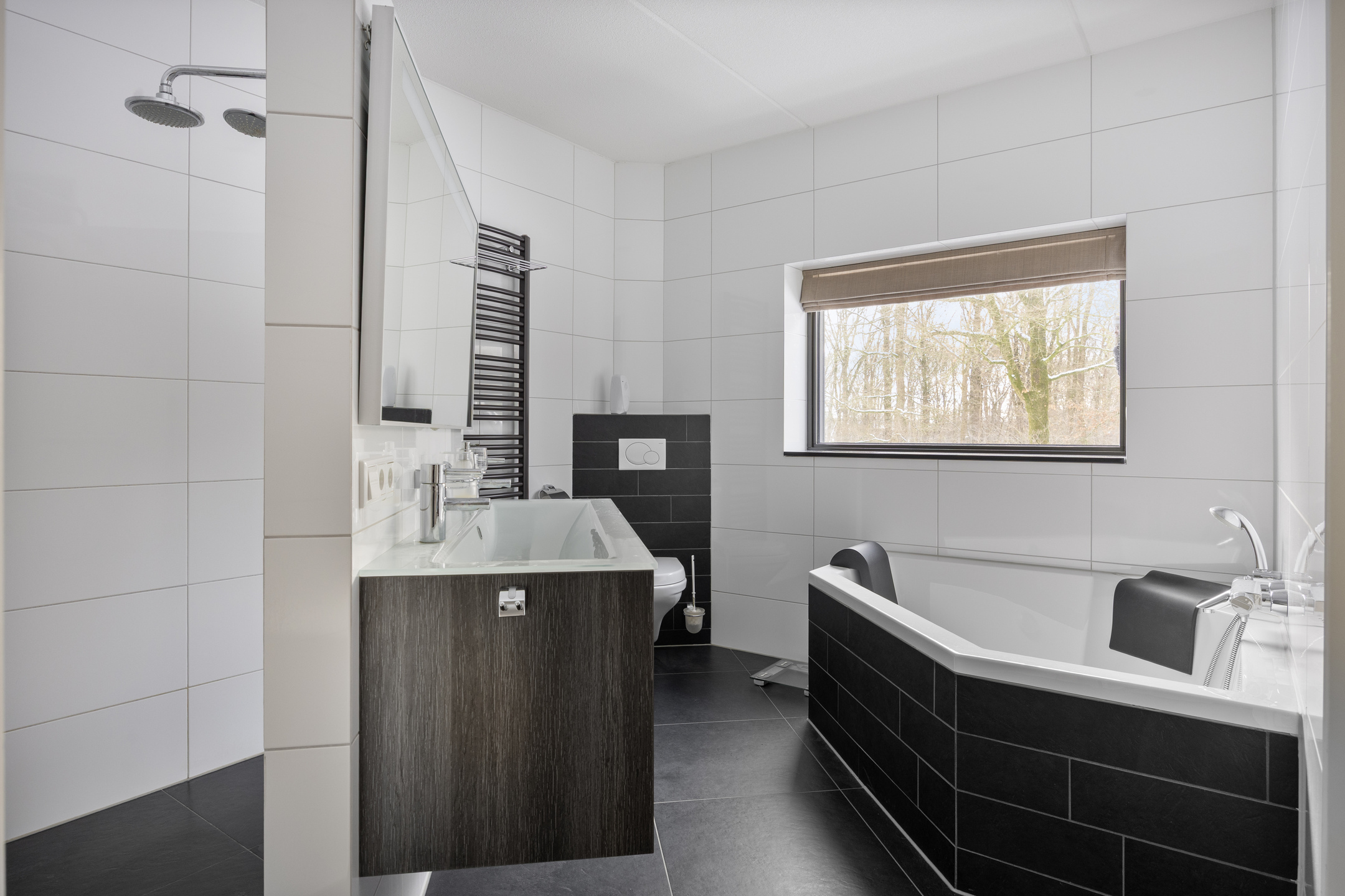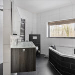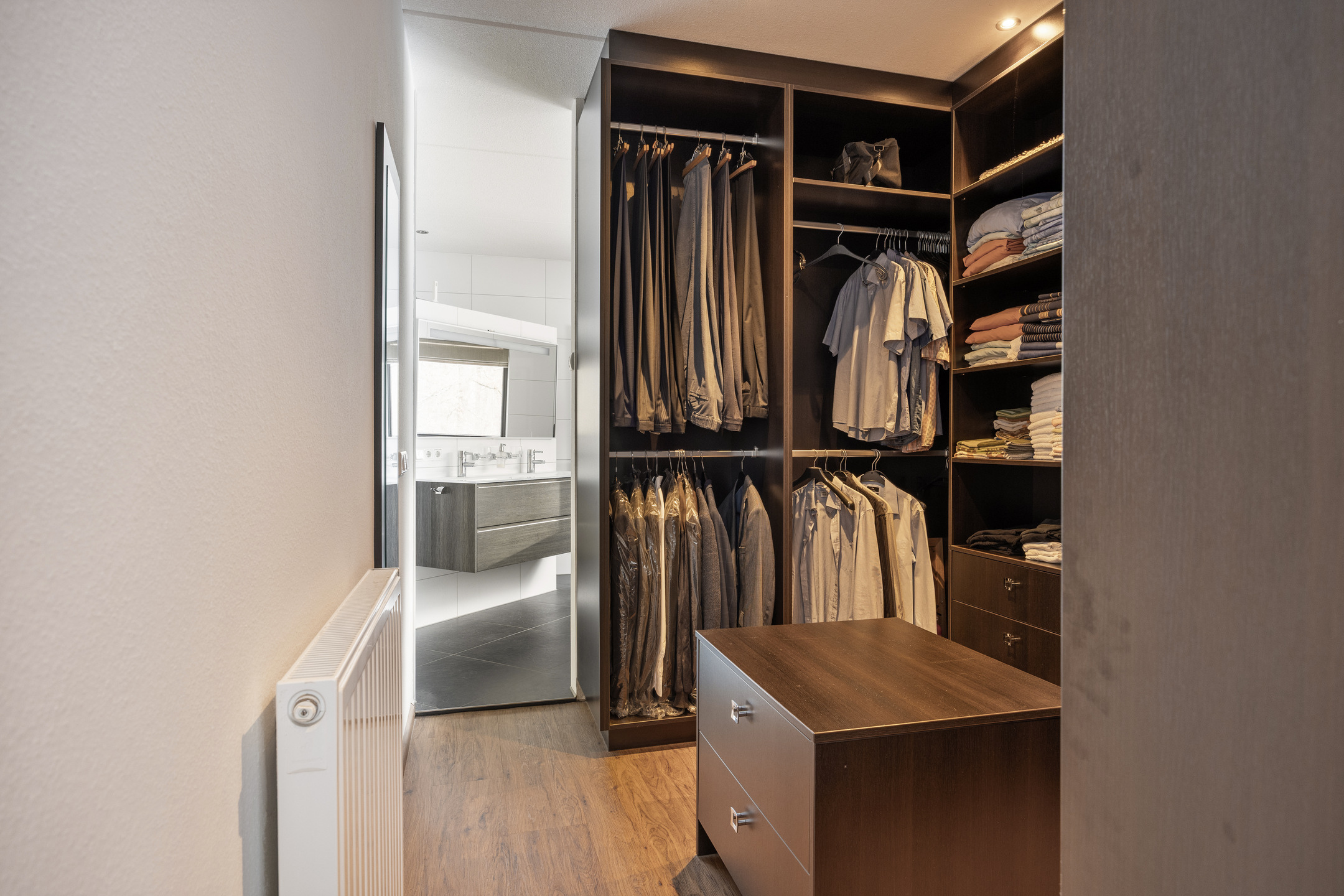 1e verdieping: overloop, 3 royale slaapkamers waarvan 1 met een fraaie inloopkast, airco en badkamer en-suite. Badkamer voorzien van een hoekbad, inloopdouche, dubbele wastafel met meubel, toilet en vloerverwarming,