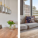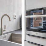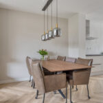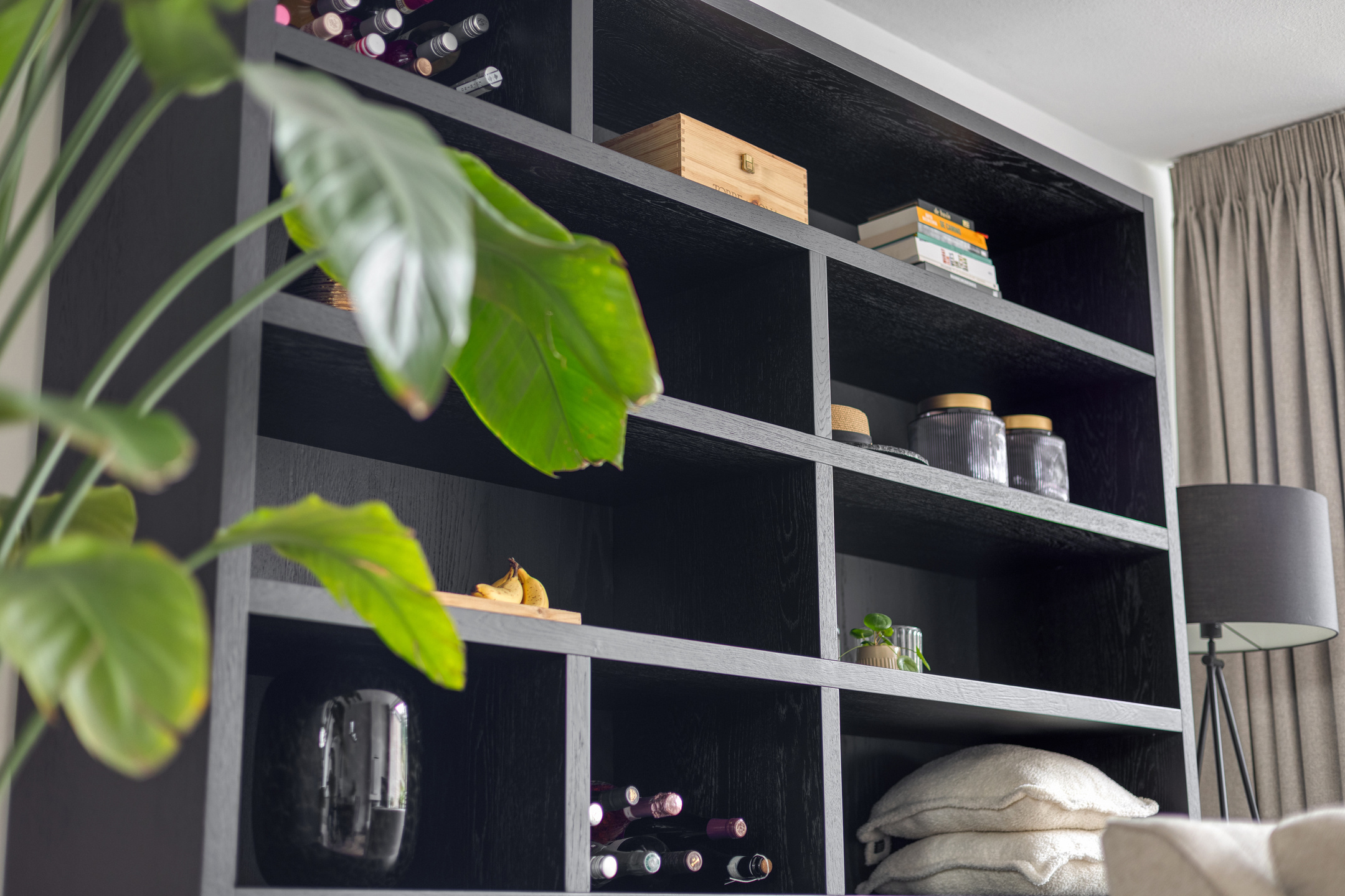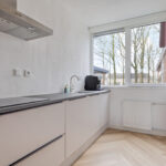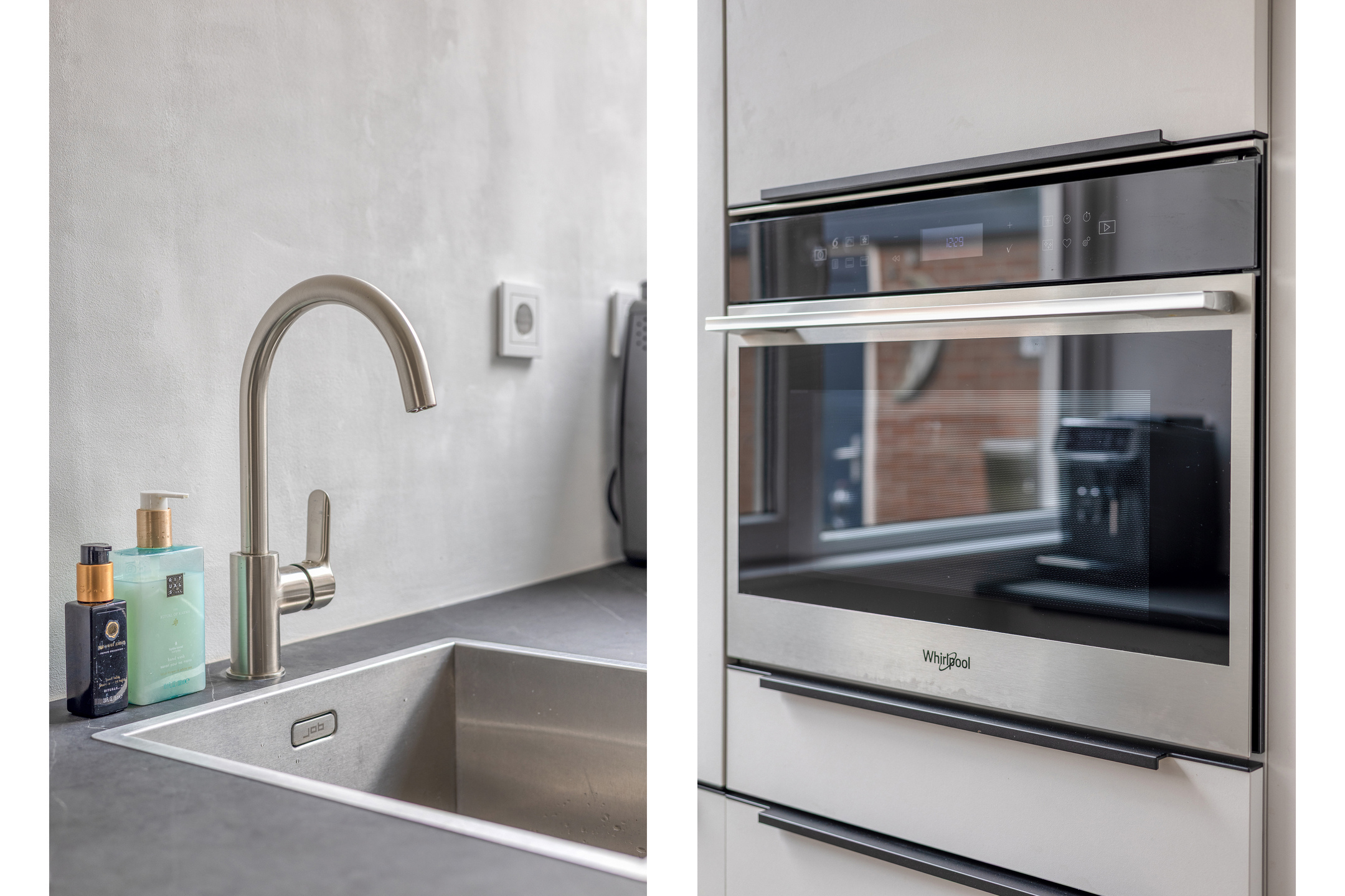 De keukenopstelling is voorzien van een vaatwasser, koelkast, vriezer, combioven en inductiekookplaat met afzuigkap.