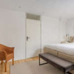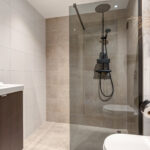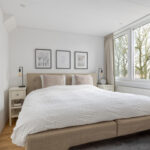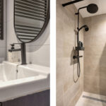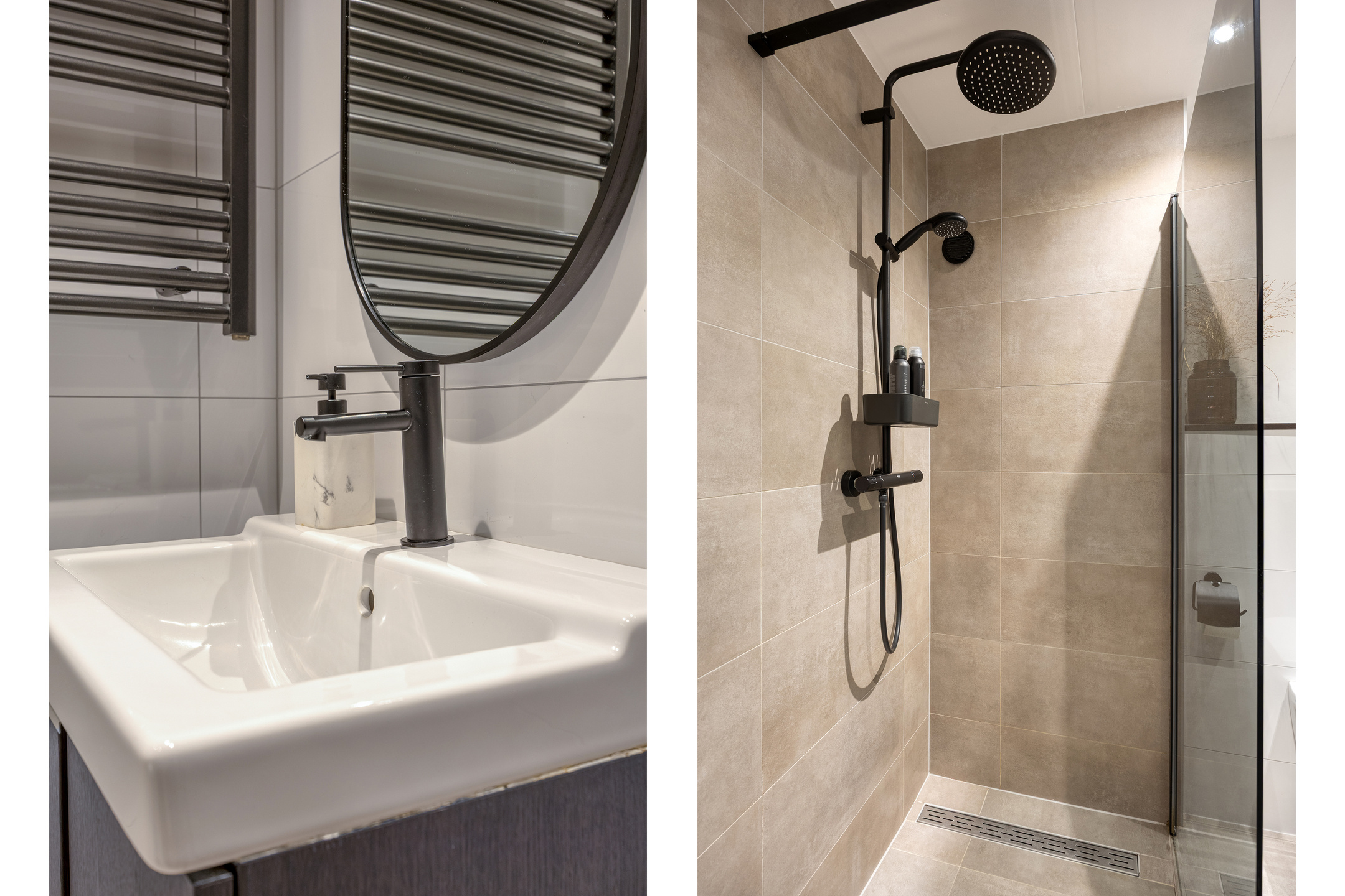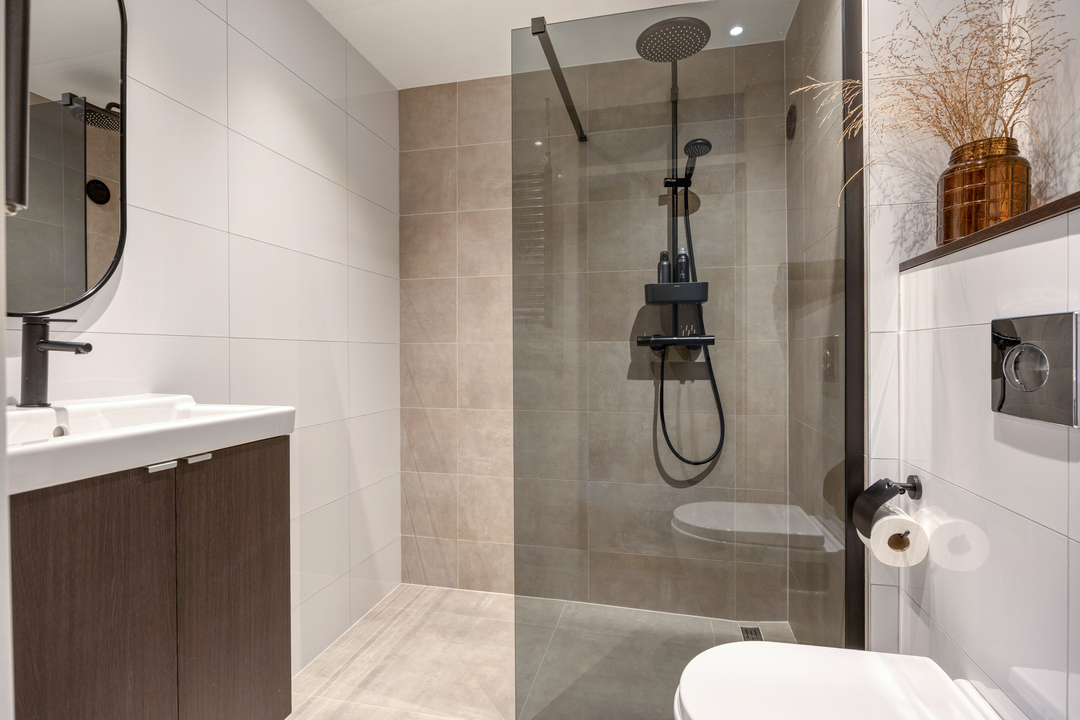 1e verdieping: overloop, 3 slaapkamers, een lichte luxe badkamer (2023) voorzien van een inloopdouche, vaste wastafel en zwevend toilet.