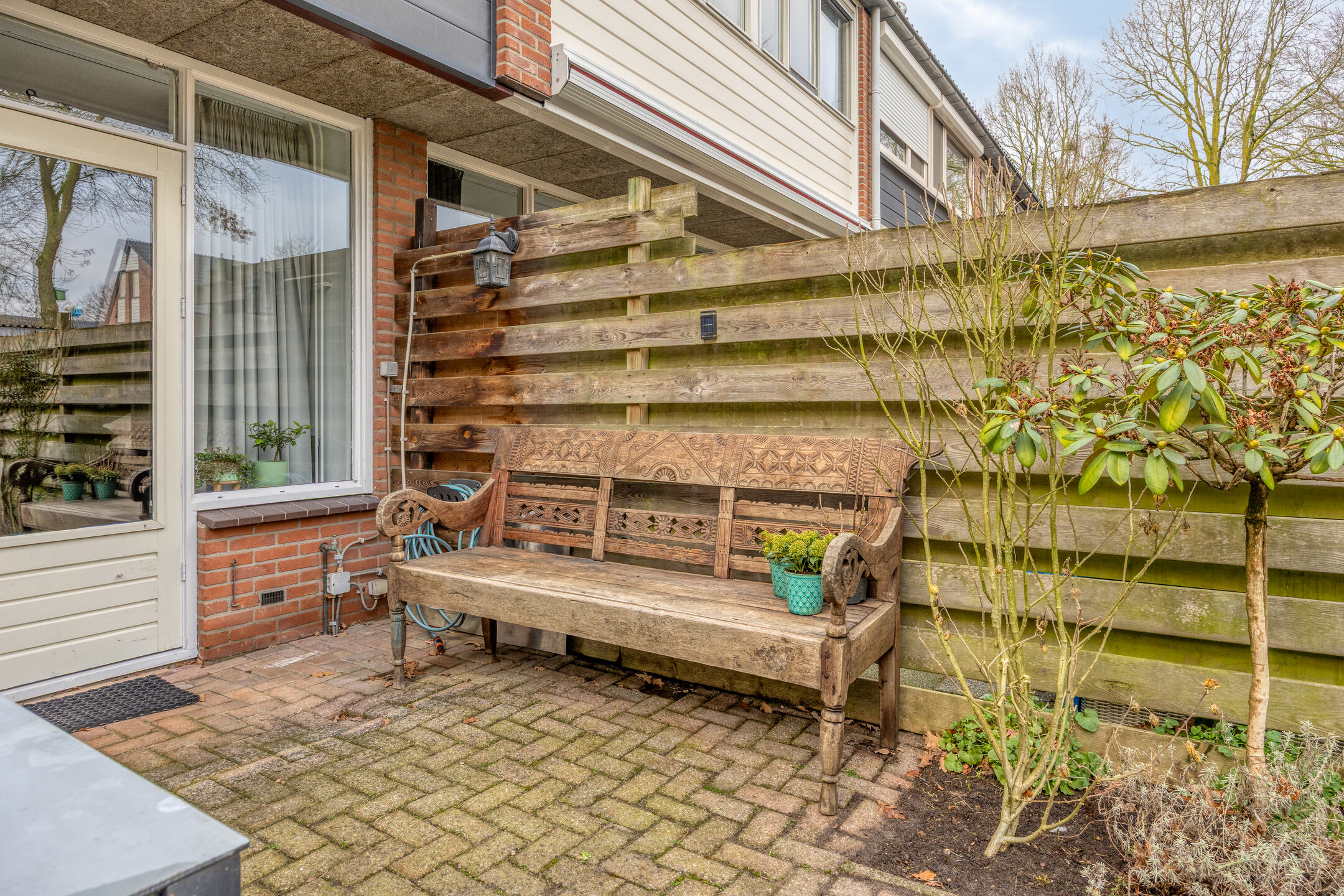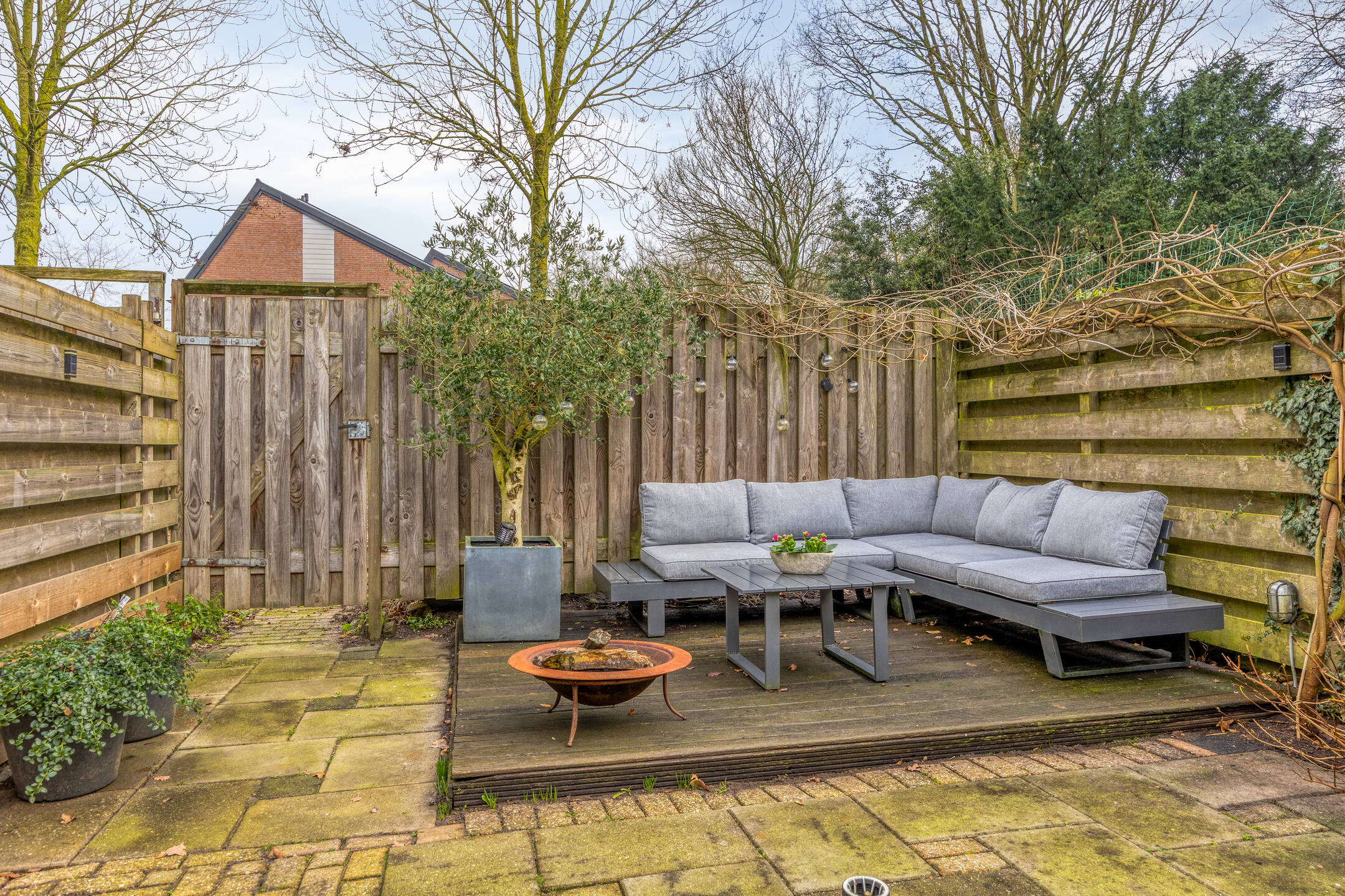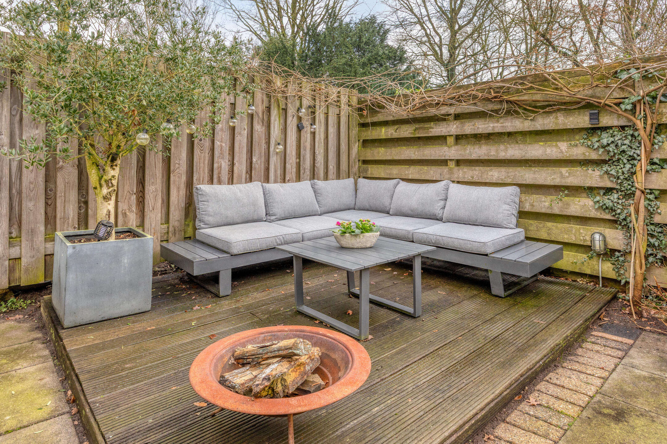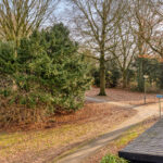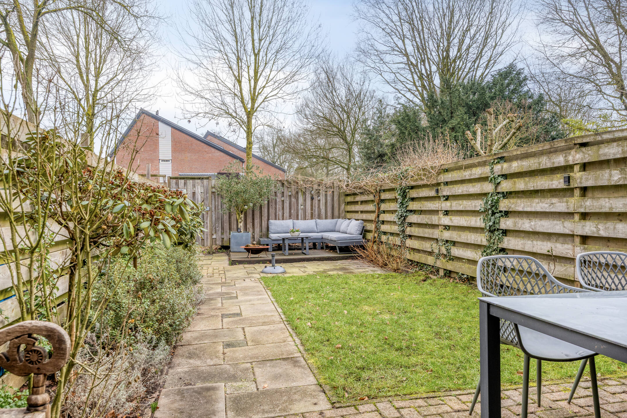 De tuin is keurig aangelegd en grenst aan een wandelpad wat leidt naar het nabijgelegen park.