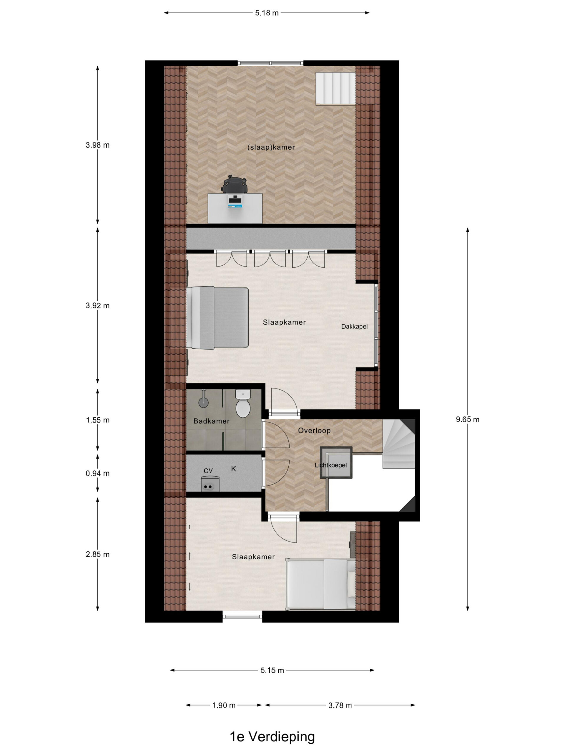 1e verdieping: overloop, cv-ruimte, doucheruimte met toilet, 2 slaapkamers, waarvan 1 zeer royaal en met een inbouwkast, dakkapel en airco.