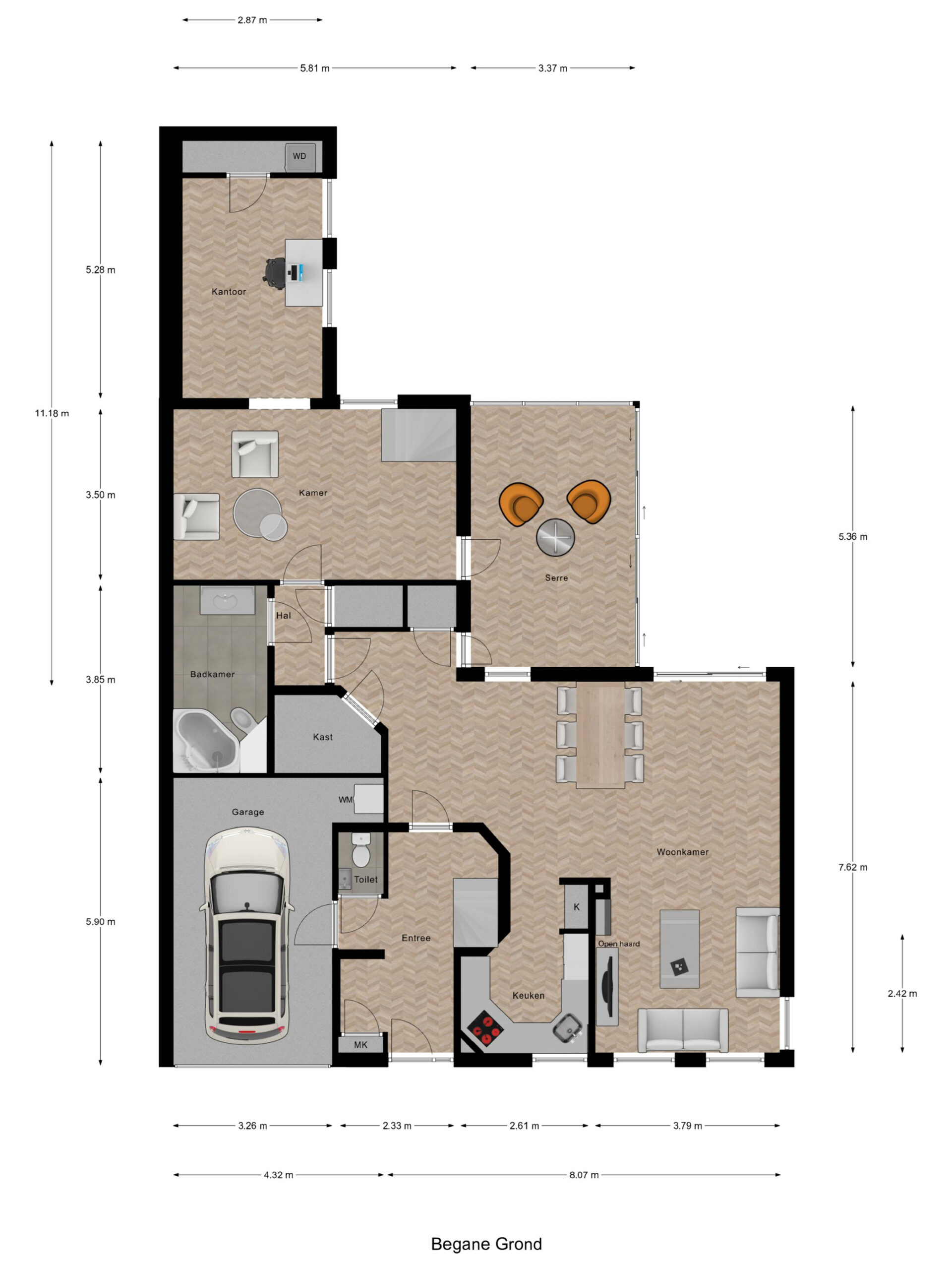 De inpandig bereikbare garage beschikt over een sectionaal deur en de witgoedaansluitingen, eventueel is deze ruimte te gebruiken als werk-/ kantoorruimte.