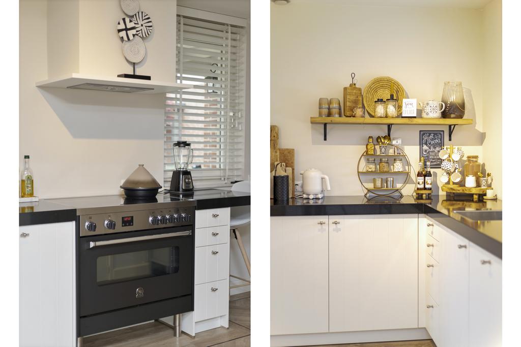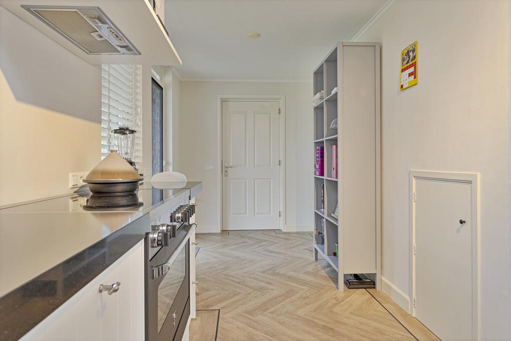 De moderne keukenopstelling is voorzien van een inductiekookplaat, afzuigkap, koelkast, vaatwasser, oven en spoelbak.
