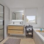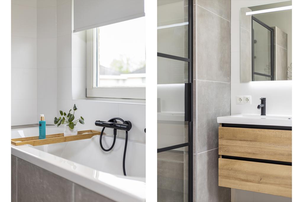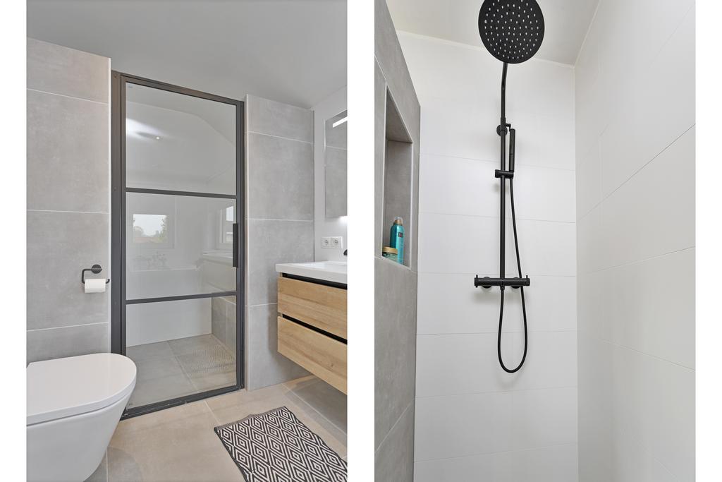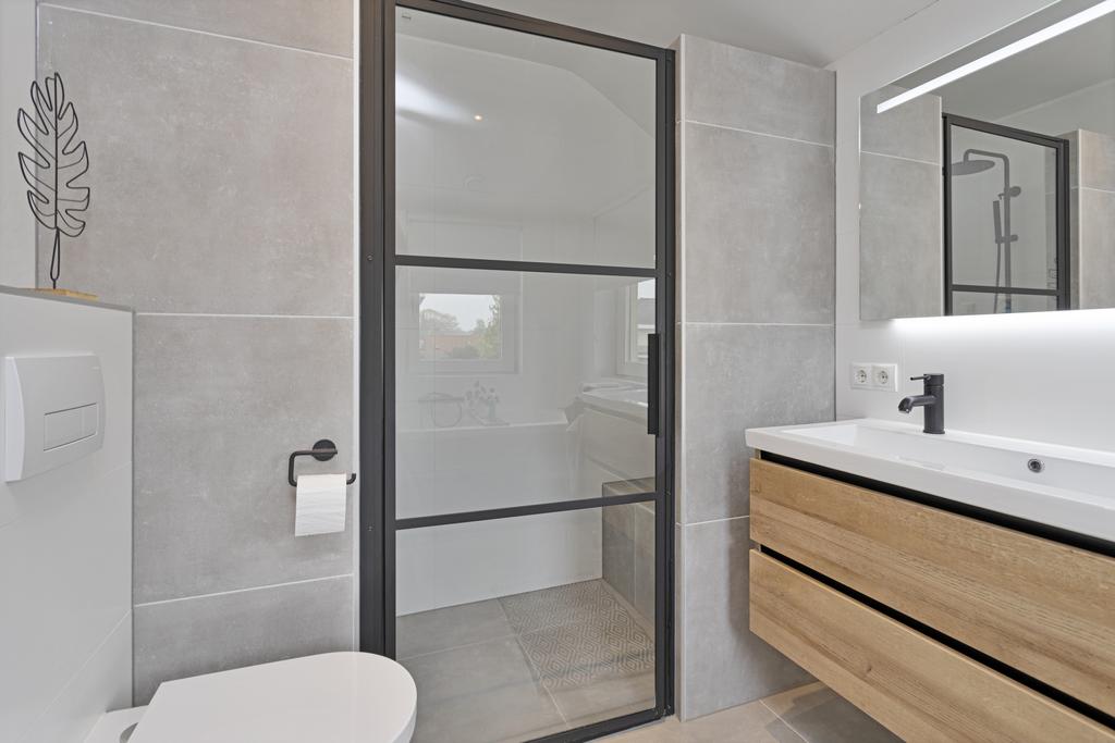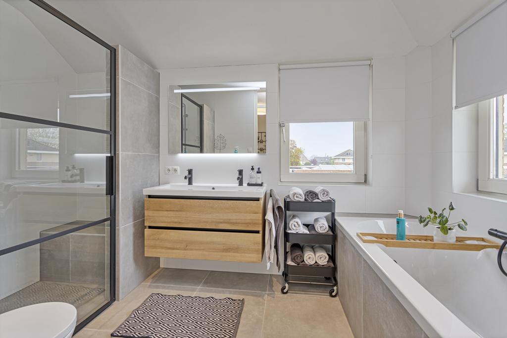 1e verdieping: overloop, 4 slaapkamers, moderne badkamer voorzien van een inloopdouche, wandcloset, ligbad en dubbele wastafel met meubel.