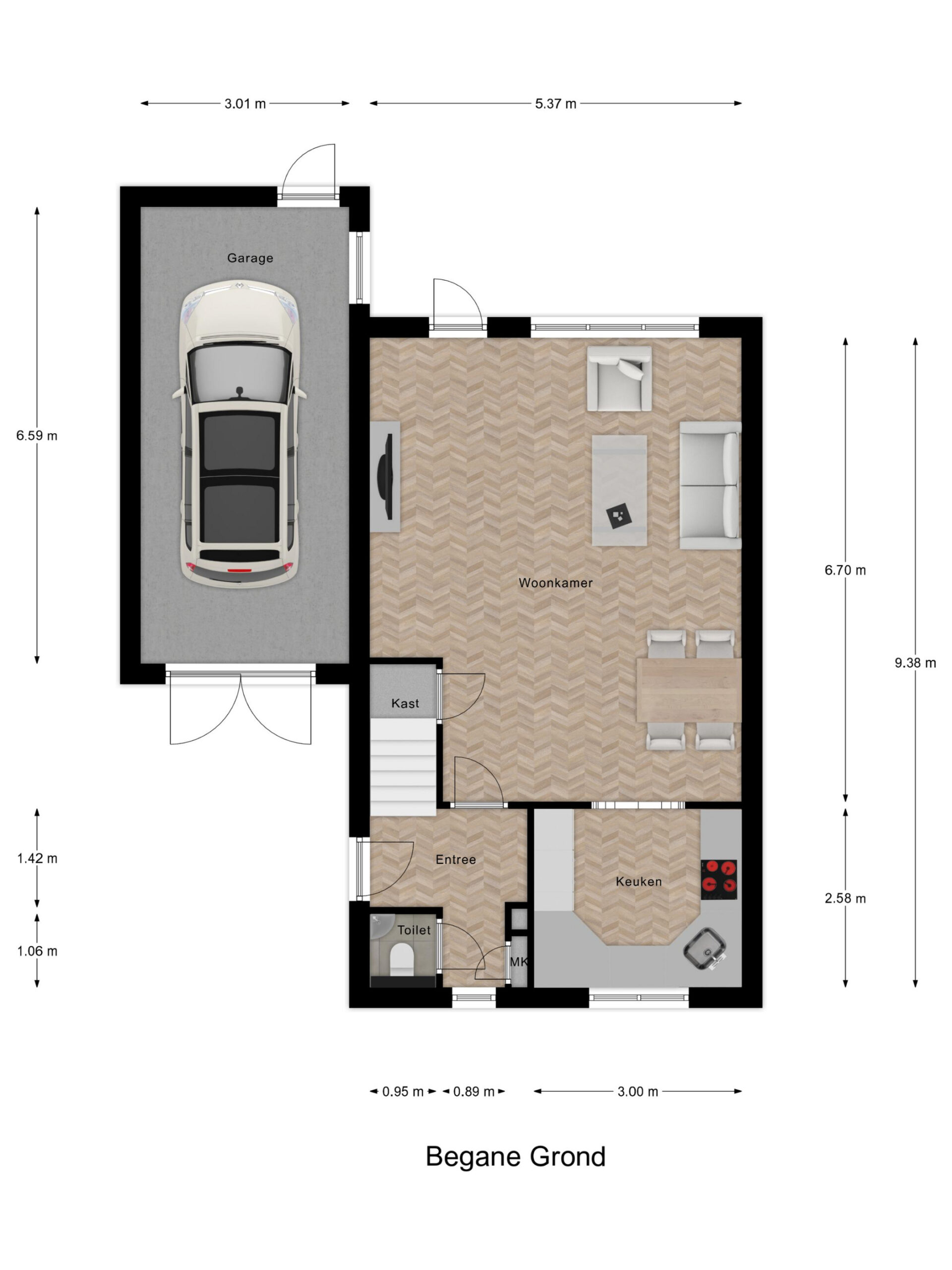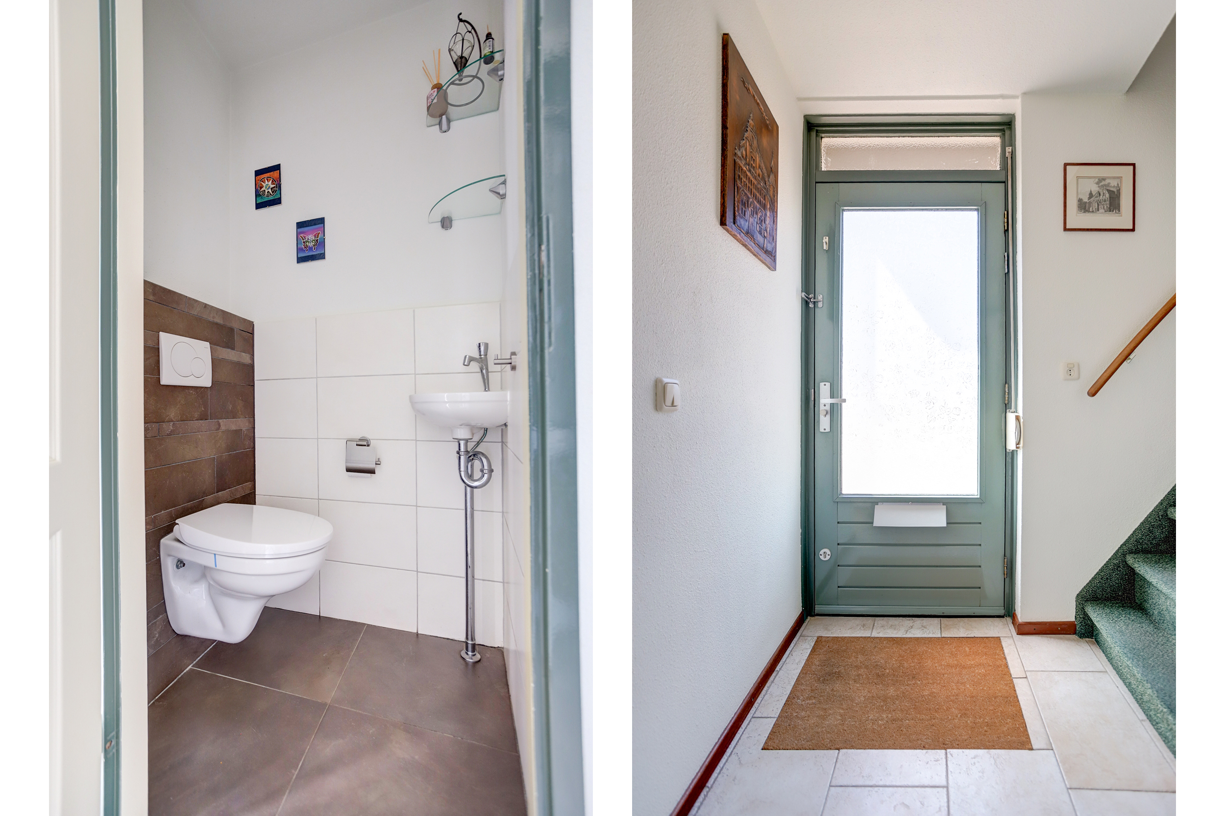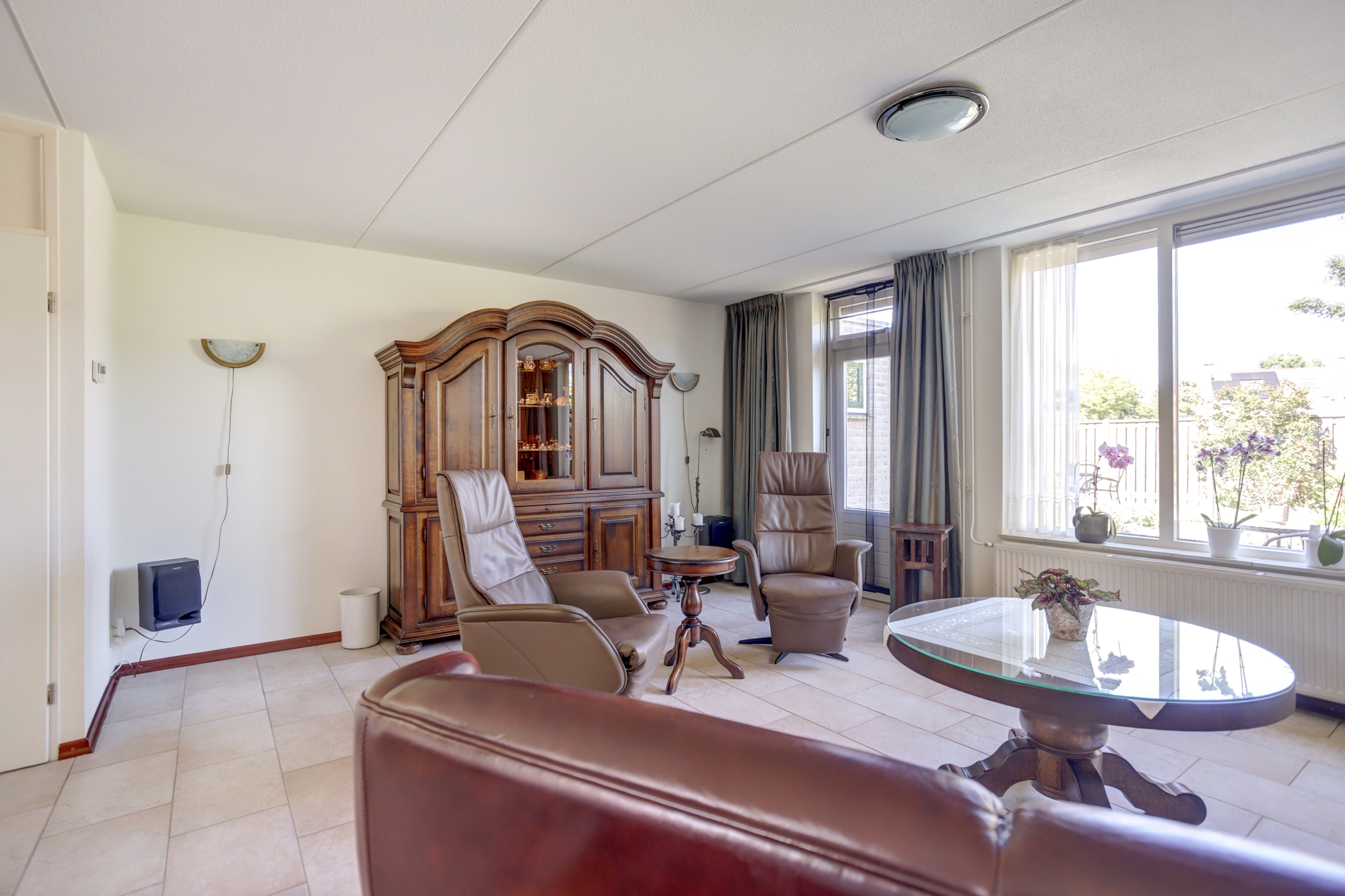 Begane grond: entree met meterkast en toiletruimte voorzien van wandcloset en fonteintje, sfeervolle woonkamer met volop lichtinval en met toegang tot de achtertuin, halfopen keuken voorzien van diverse inbouwapparatuur.