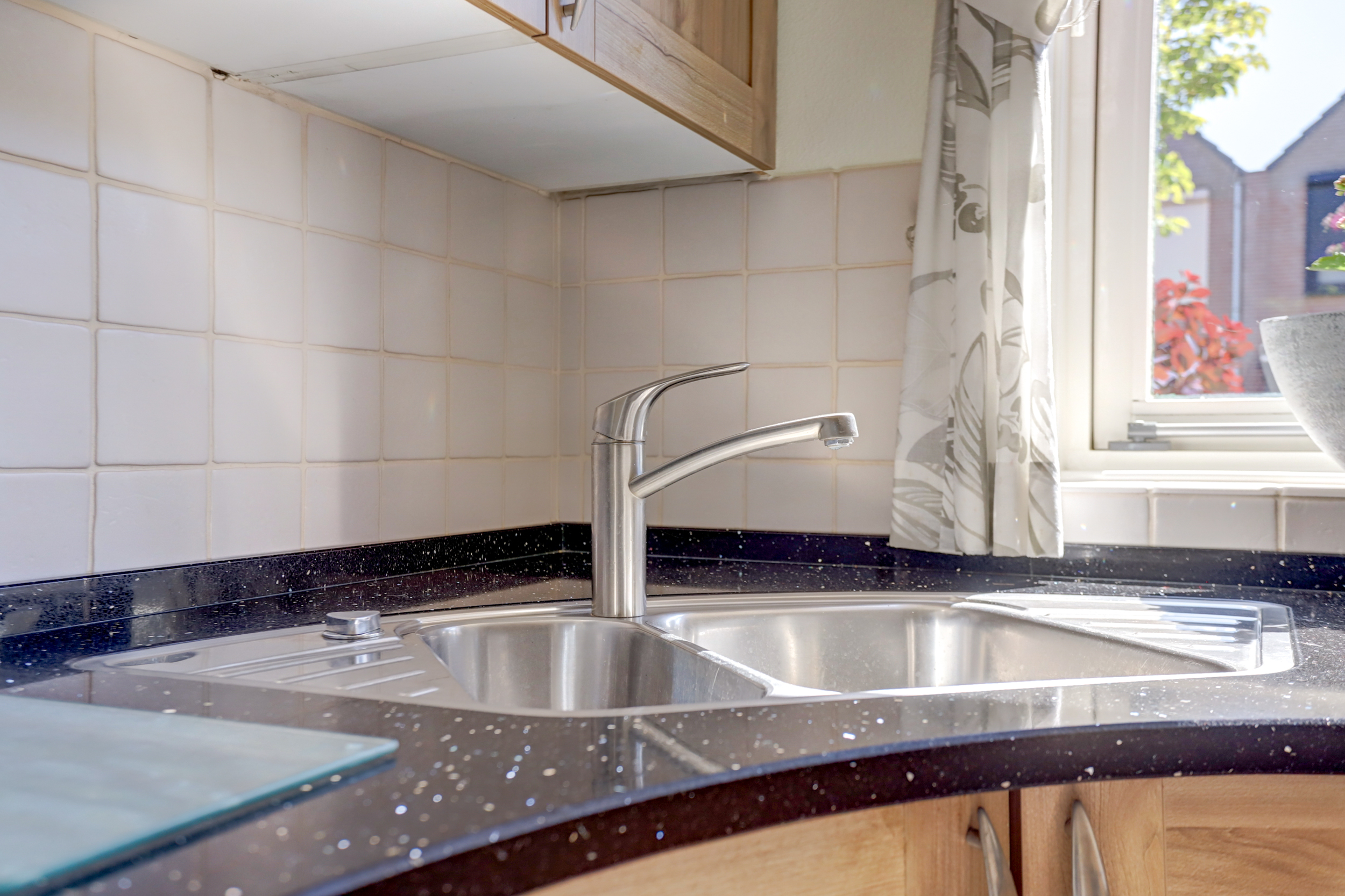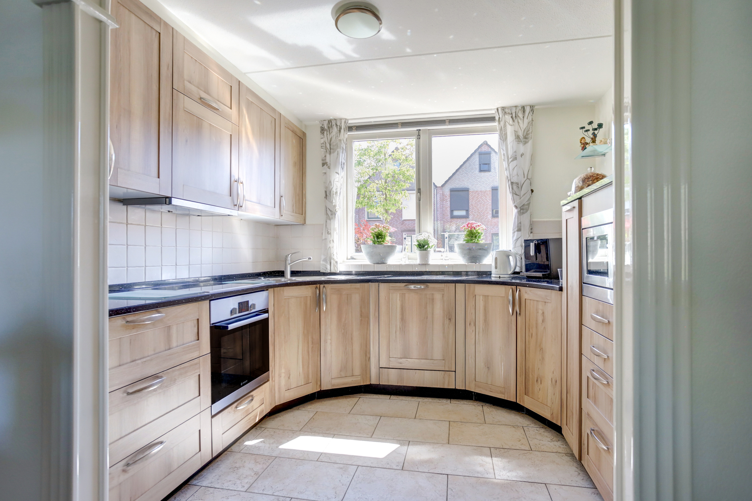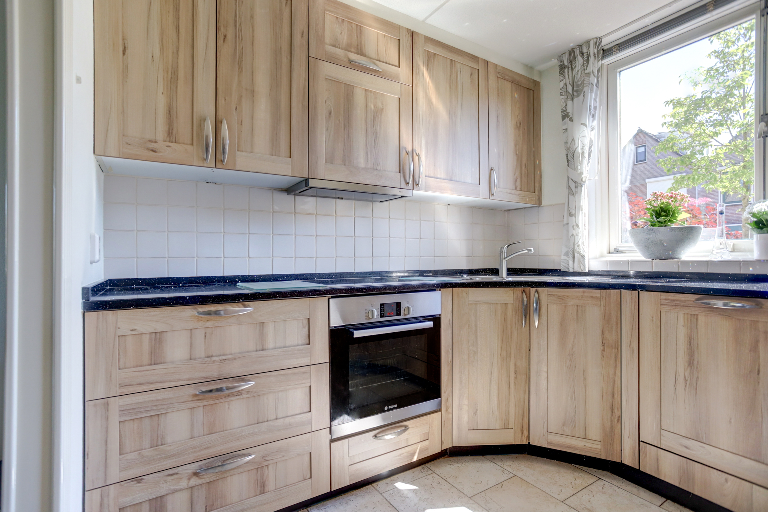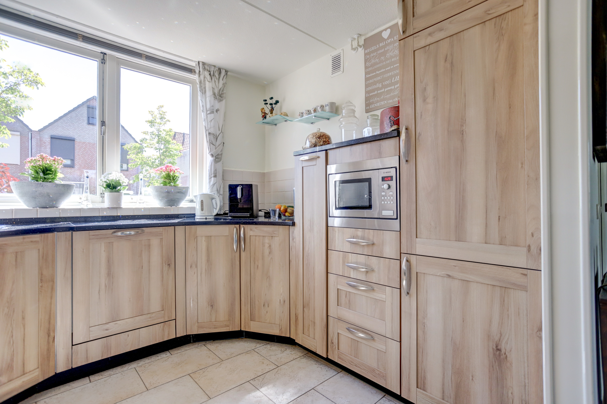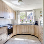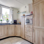 De keukeninrichting bestaat uit een inductiekookplaat, afzuigkap, oven, magnetron, koelkast (recent vervangen) en een spoelbak.