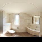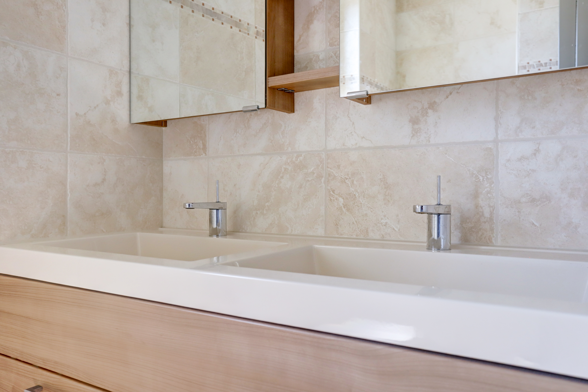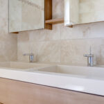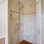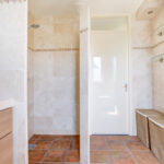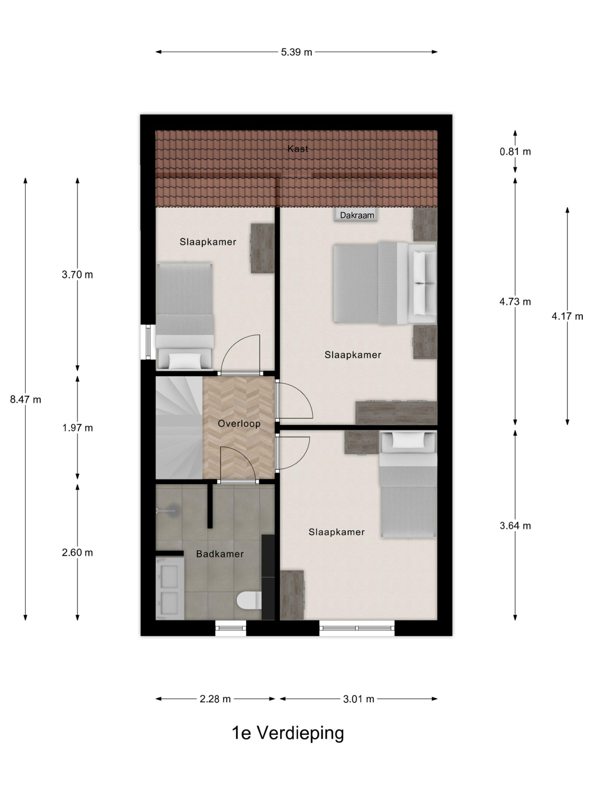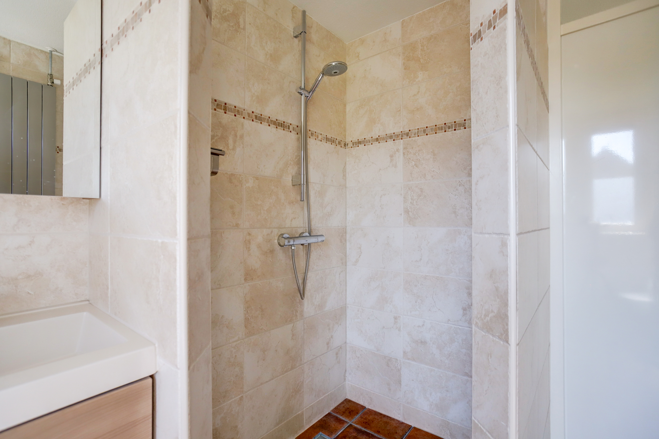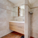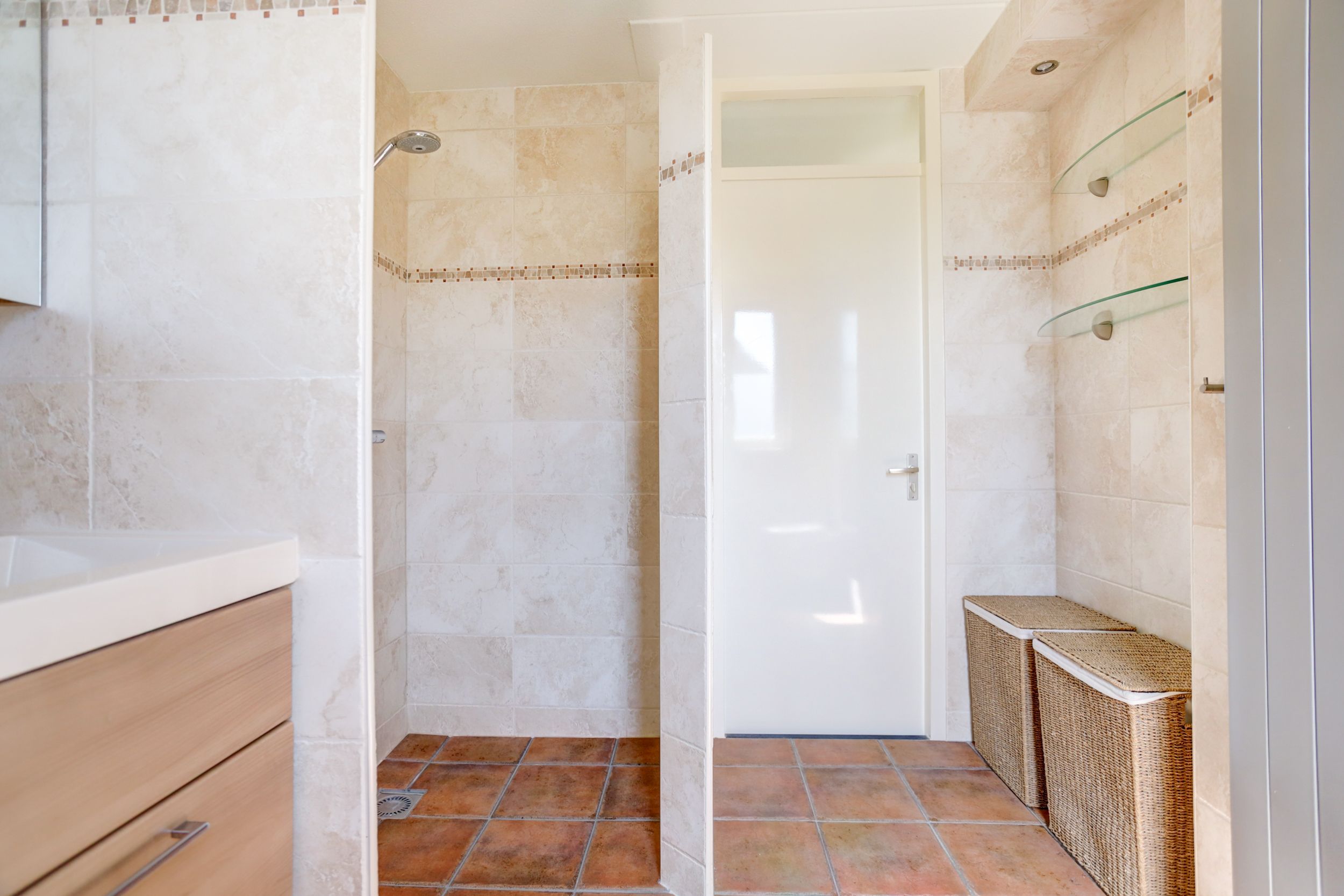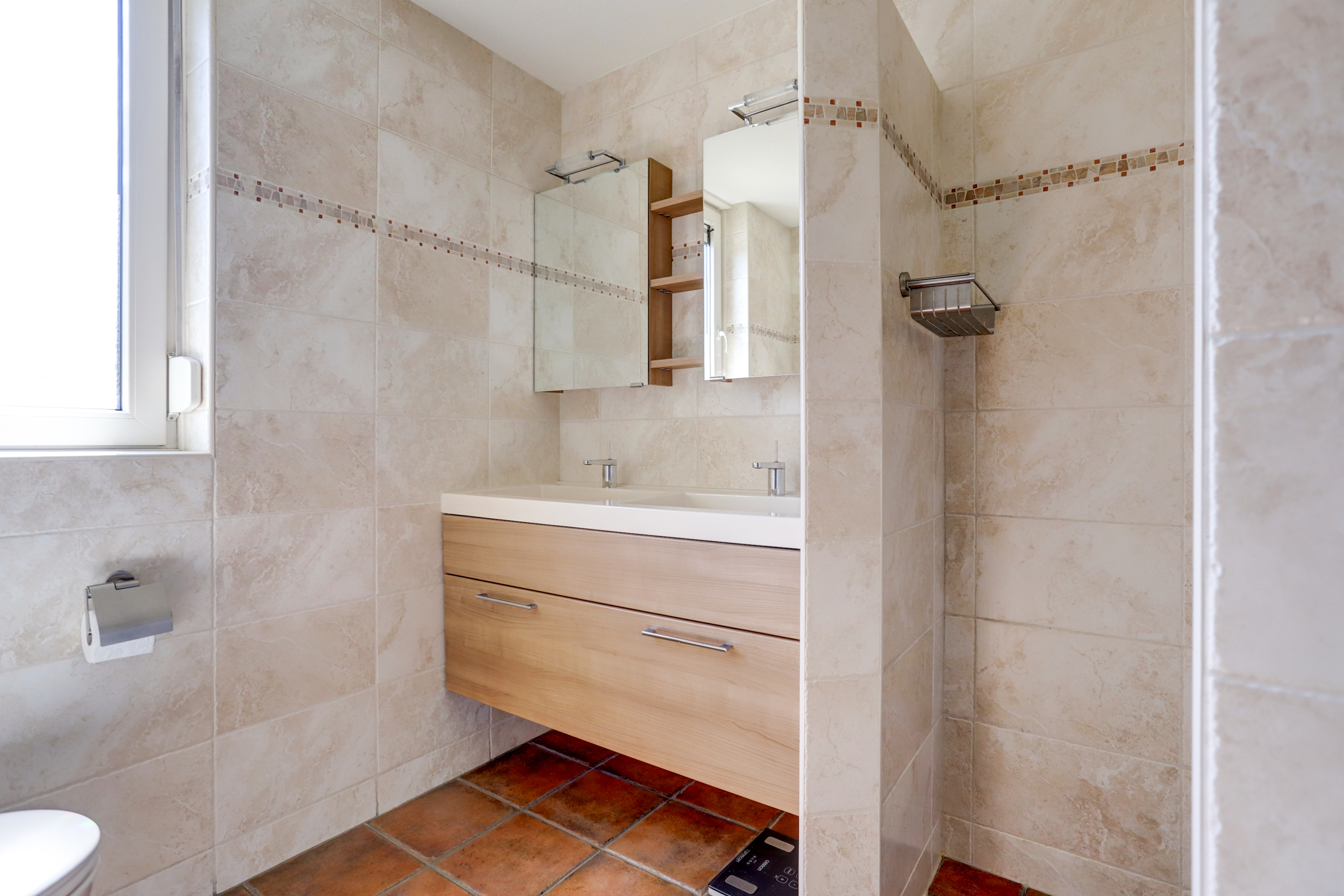1e verdieping: overloop met 3 ruime slaapkamers en een moderne badkamer voorzien van inloopdouche, wandcloset en dubbele wastafel met meubel.
