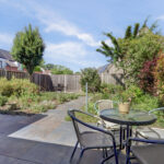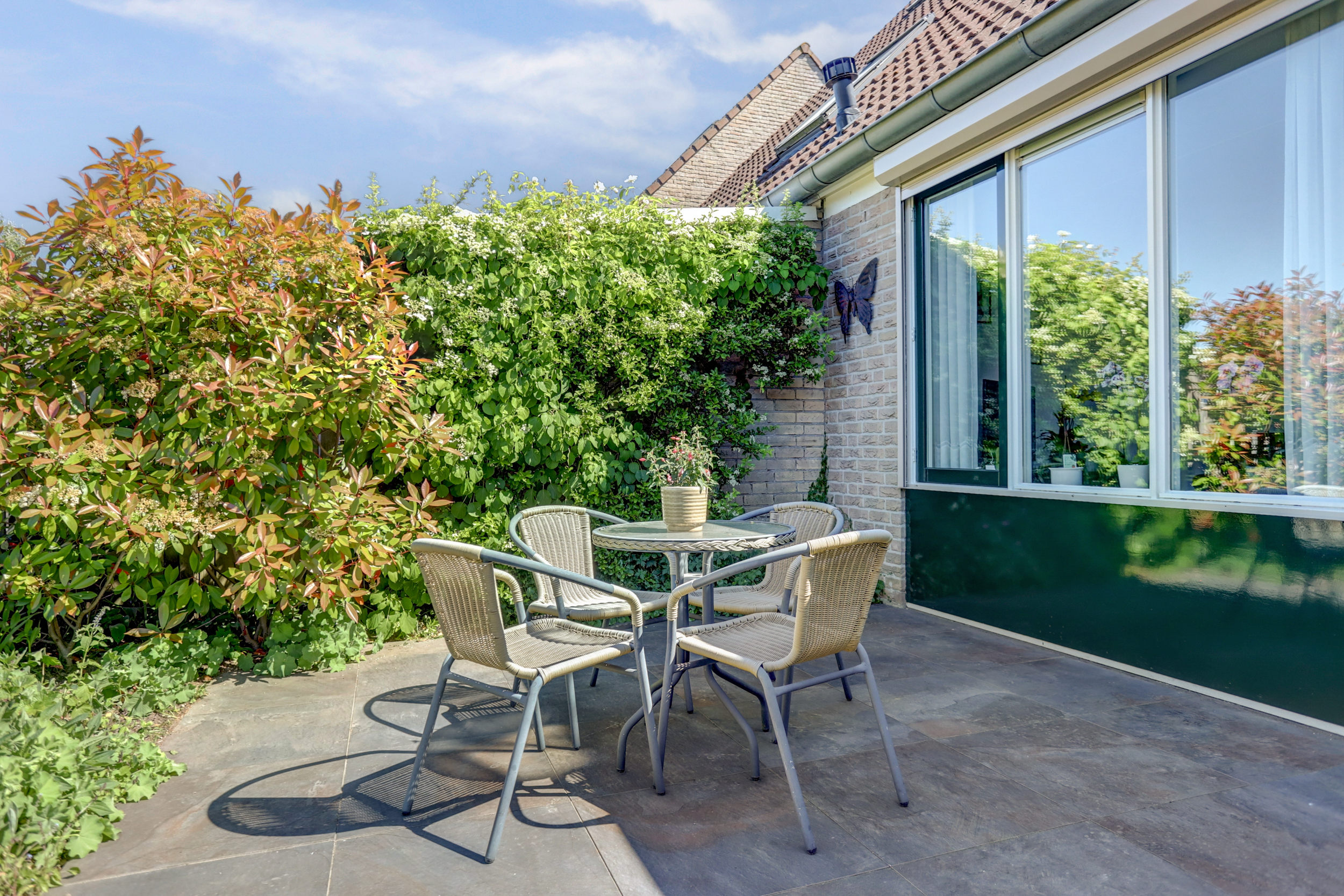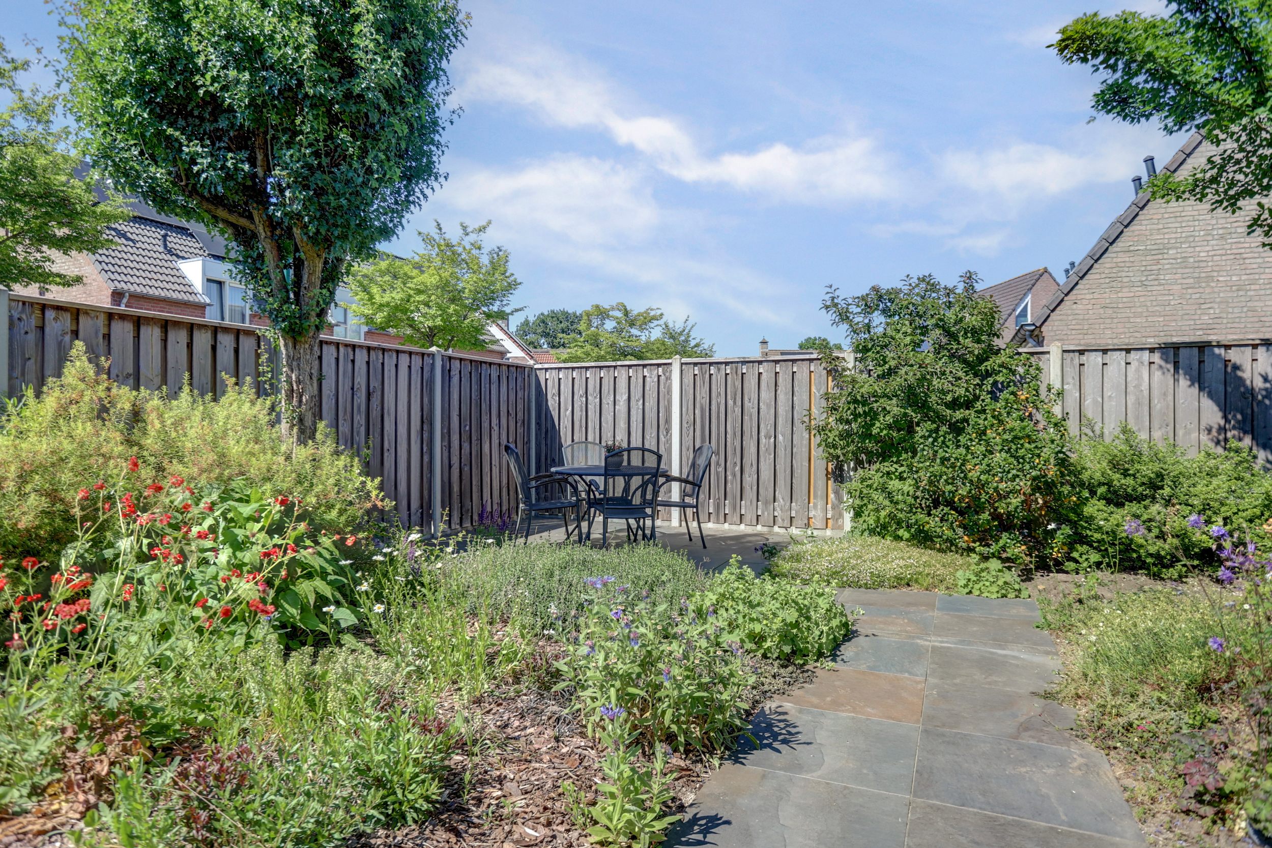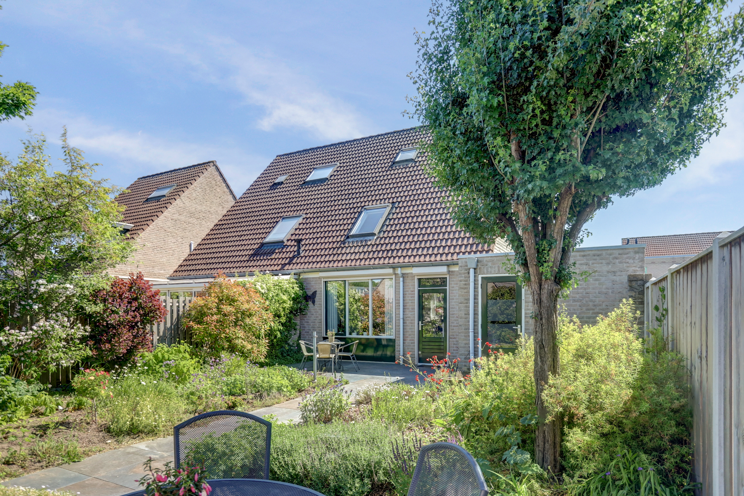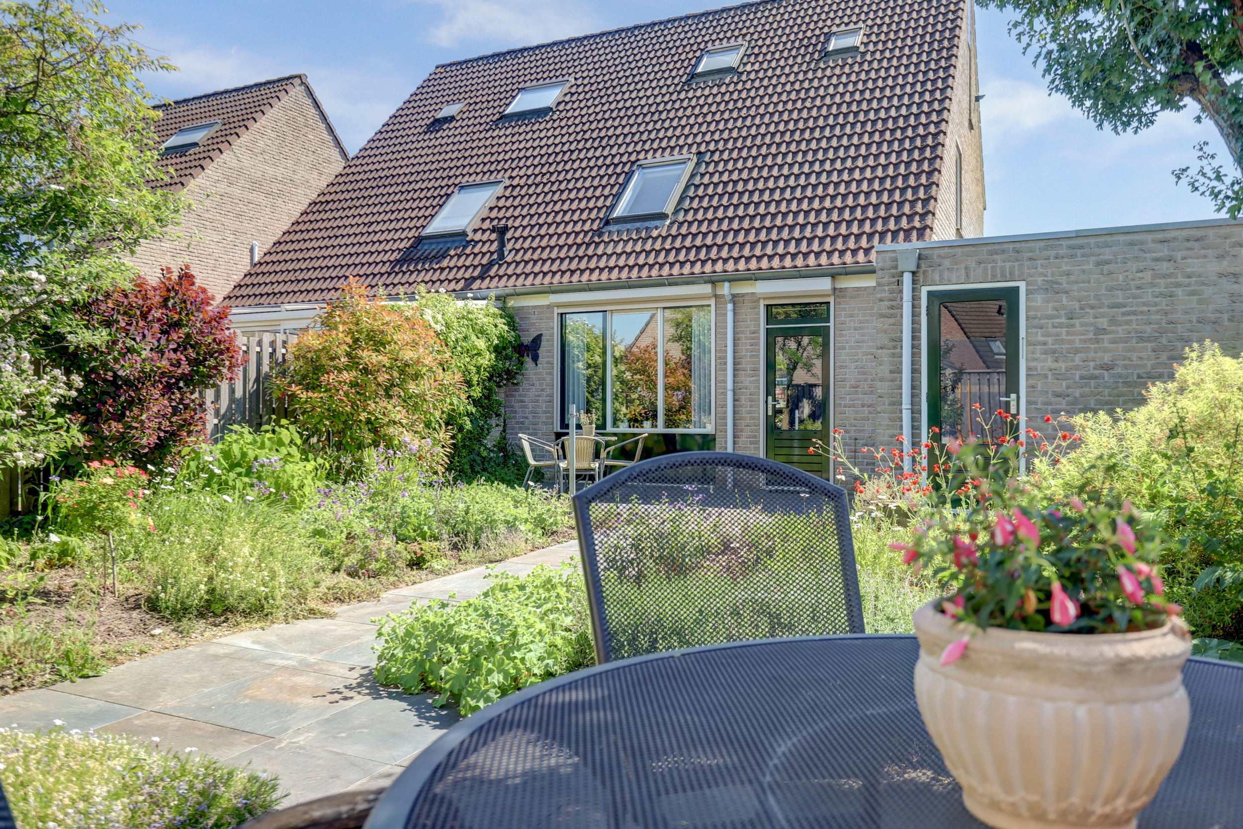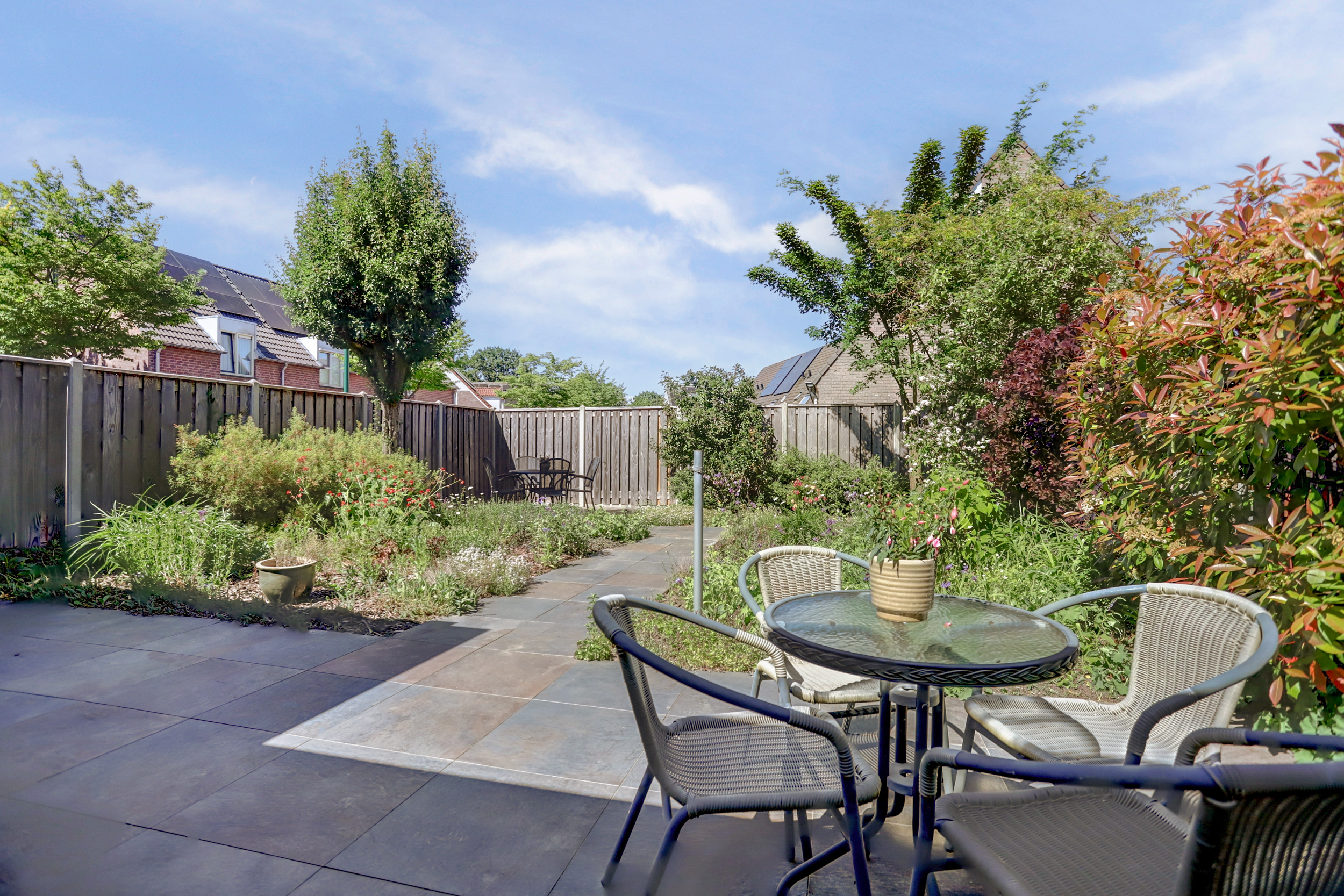 De fraai aangelegde achtertuin beschikt over meerdere terrassen.
