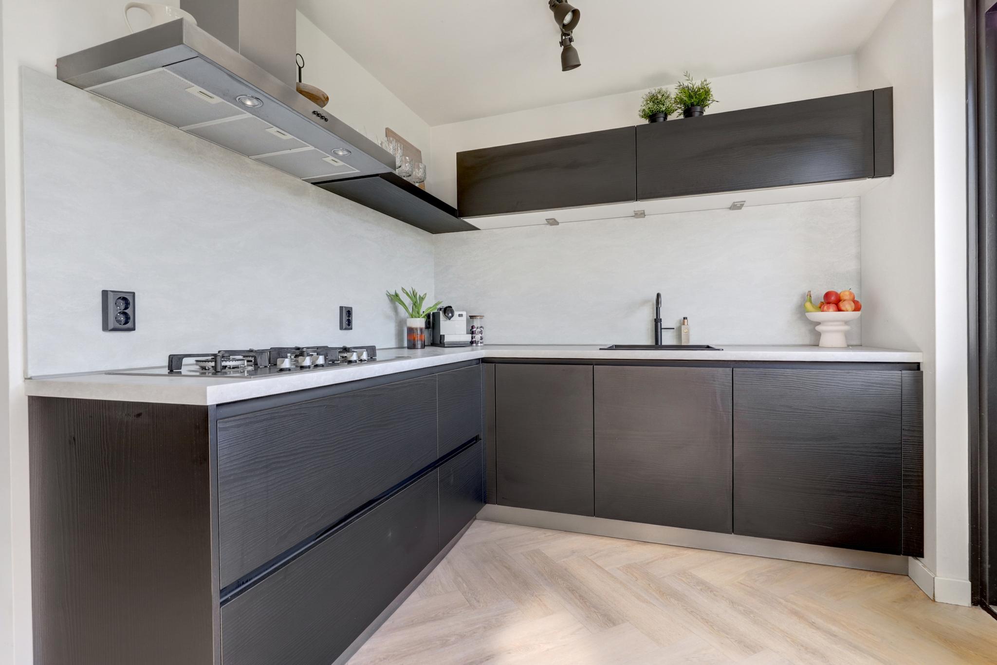 De keukenopstelling (2018) is voorzien van een 5-pits gasfornuis, afzuigkap, koelkast, spoelbak, vaatwasser, combimagnetron en Quooker.