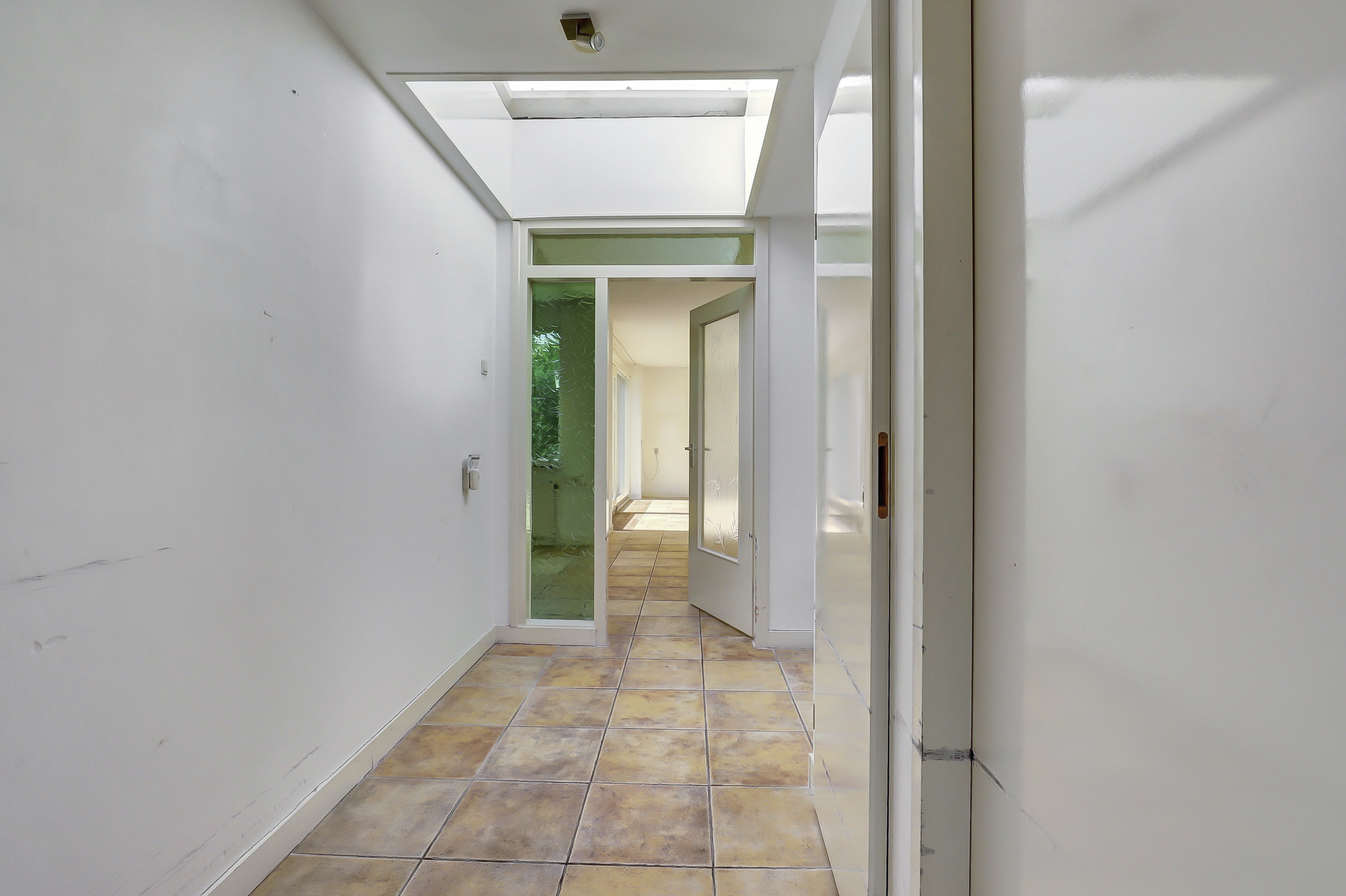 Begane grond: hal met meterkast, garderobe, toilet en de toegang tot de inpandige berging met de aansluitingen van de wasapparatuur en de opstelling van de cv-ketel. Royale L-vormige woonkamer met veel lichtinval en een schuifpui naar de op het zuiden gelegen achtertuin. De halfopen keuken biedt de mogelijkheid om een ruime keukeninrichting te plaatsen. Een portaal met toegang tot 2 slaapkamers (voorheen 3) en de badkamer voorzien van een douche, toilet en vaste wastafel. In de voormalige garage is een werkkamer gerealiseerd, welke te bereiken is via één van de slaapkamers.