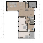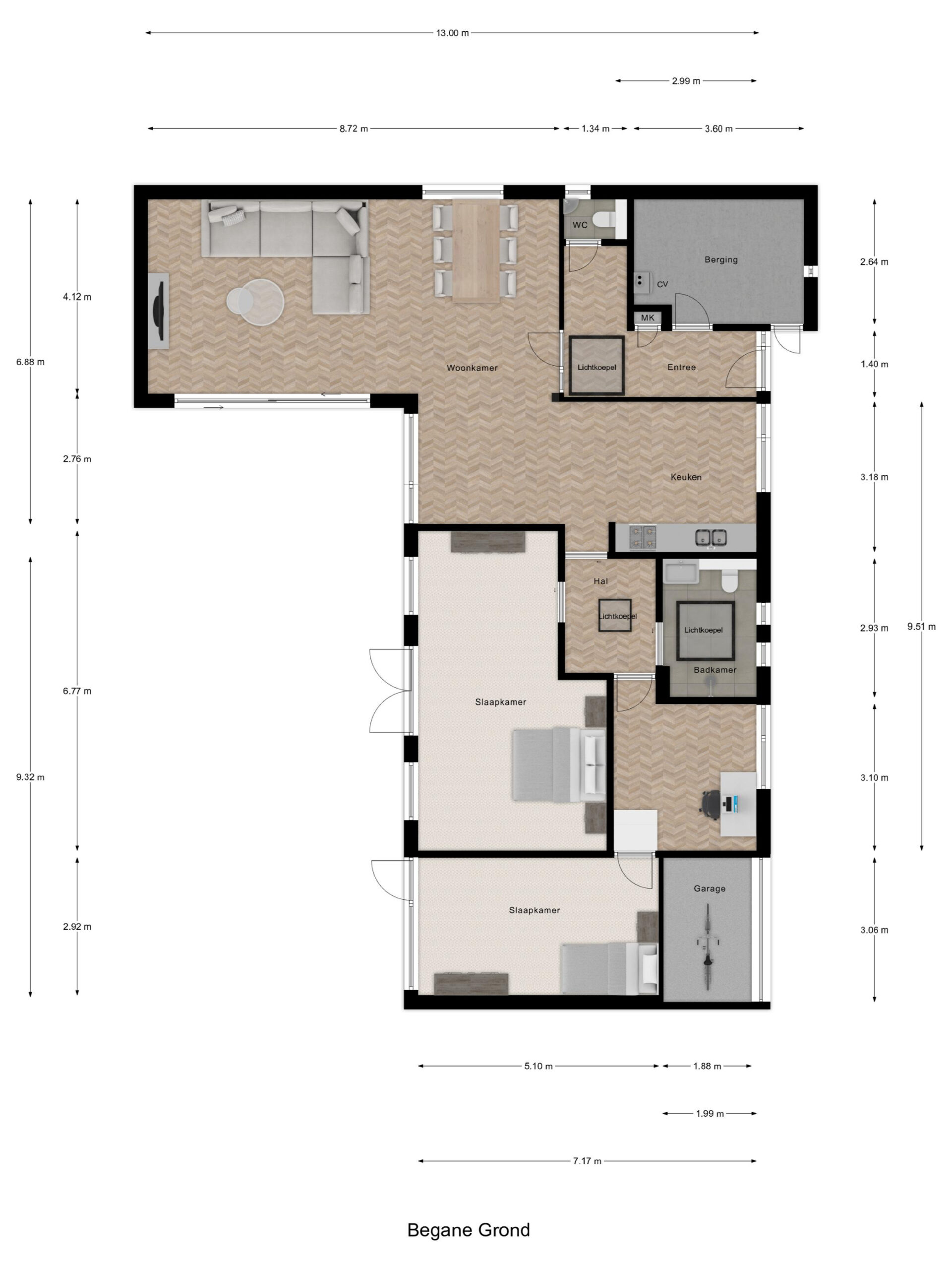 Begane grond: hal met meterkast, garderobe, toilet en de toegang tot de inpandige berging met de aansluitingen van de wasapparatuur en de opstelling van de cv-ketel. Royale L-vormige woonkamer…