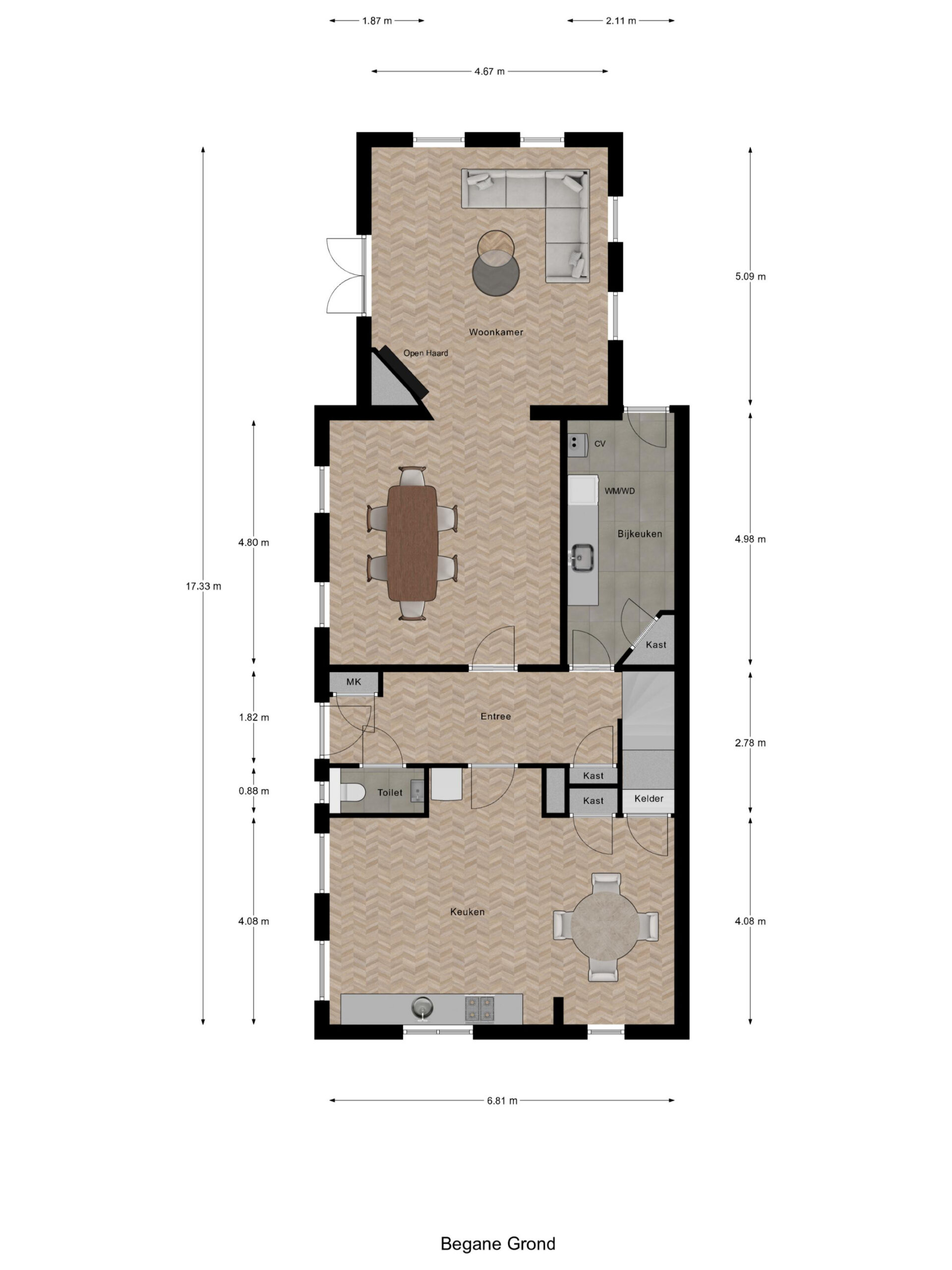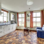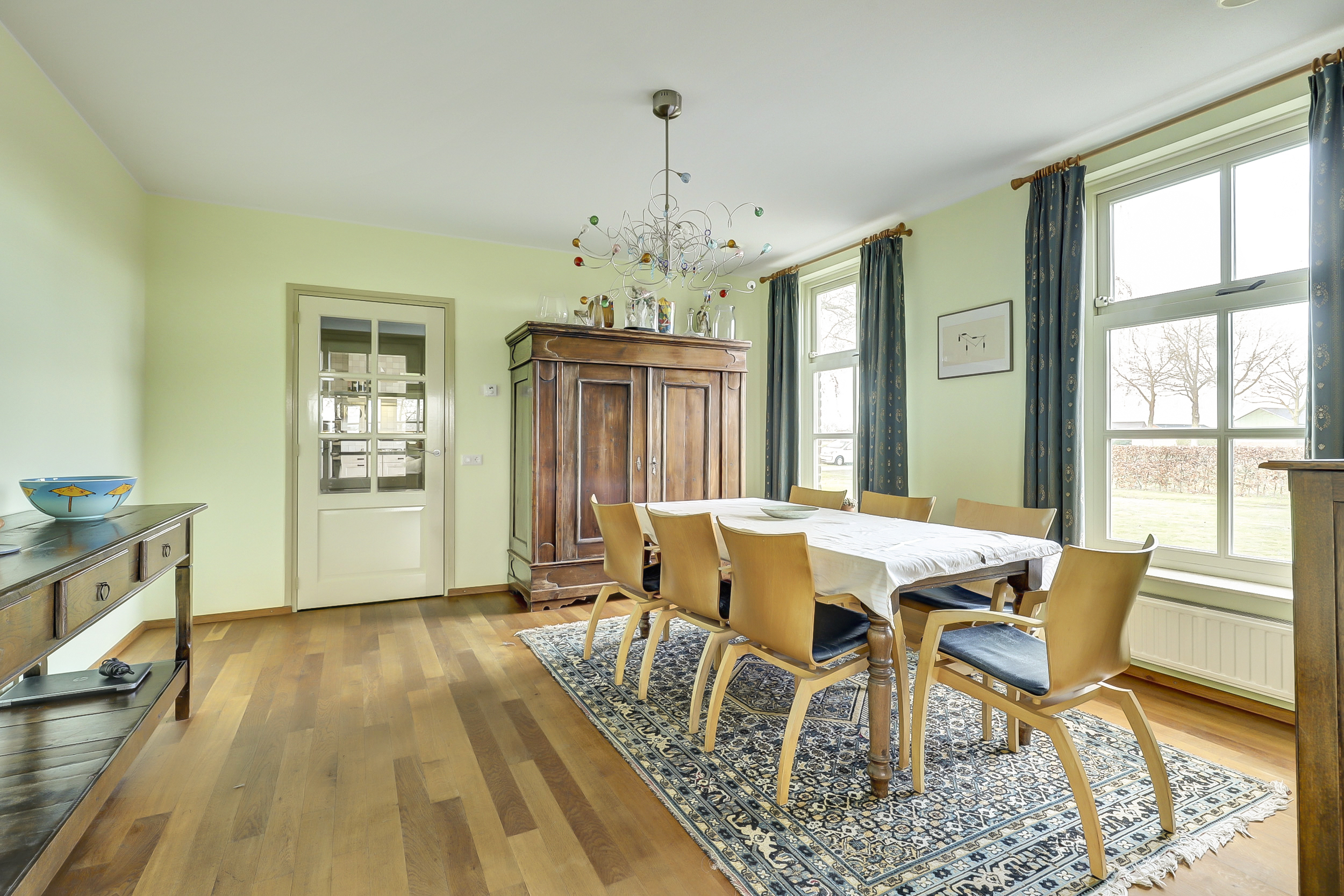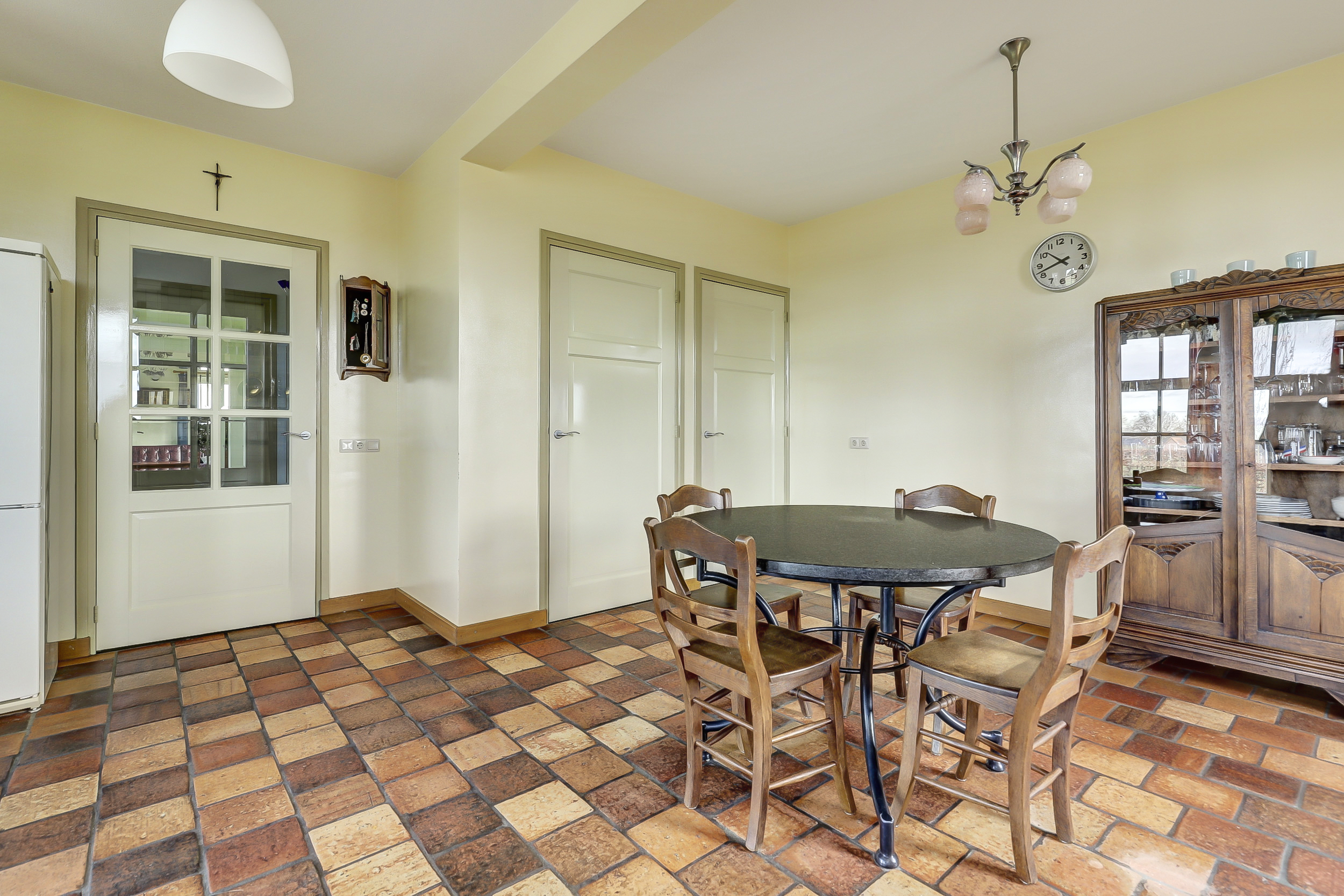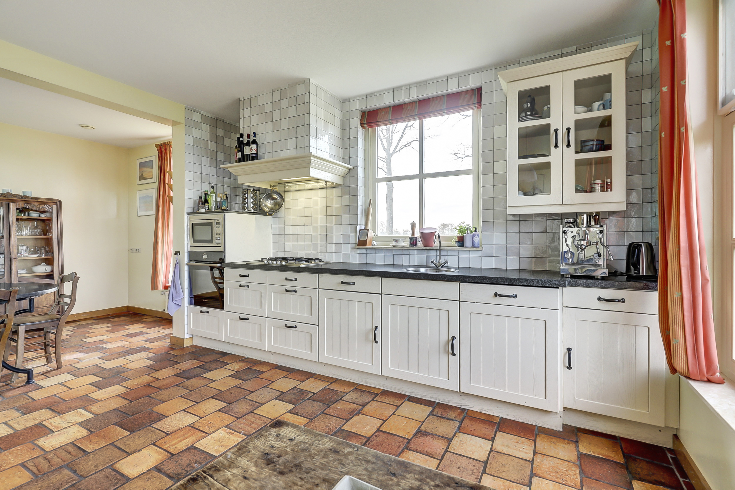 Begane grond: hal met meterkast en toilet met wandcloset en fonteintje. Een zeer ruime woonkamer die opgedeeld is een eetkamer en een zitkamer. Deze sfeervolle woonvertrekken zijn voorzien van een eikenhouten vloer, openslaande deuren naar de zij-/ achtertuin en een sfeervolle gashaard. De ruim opgezette en traditionele woonkeuken is aan de voorzijde van de woning gelegen met een fraai en landelijk uitzicht. Bijkeuken met de aansluitingen van de wasapparatuur en de opstelling van de cv-ketel.