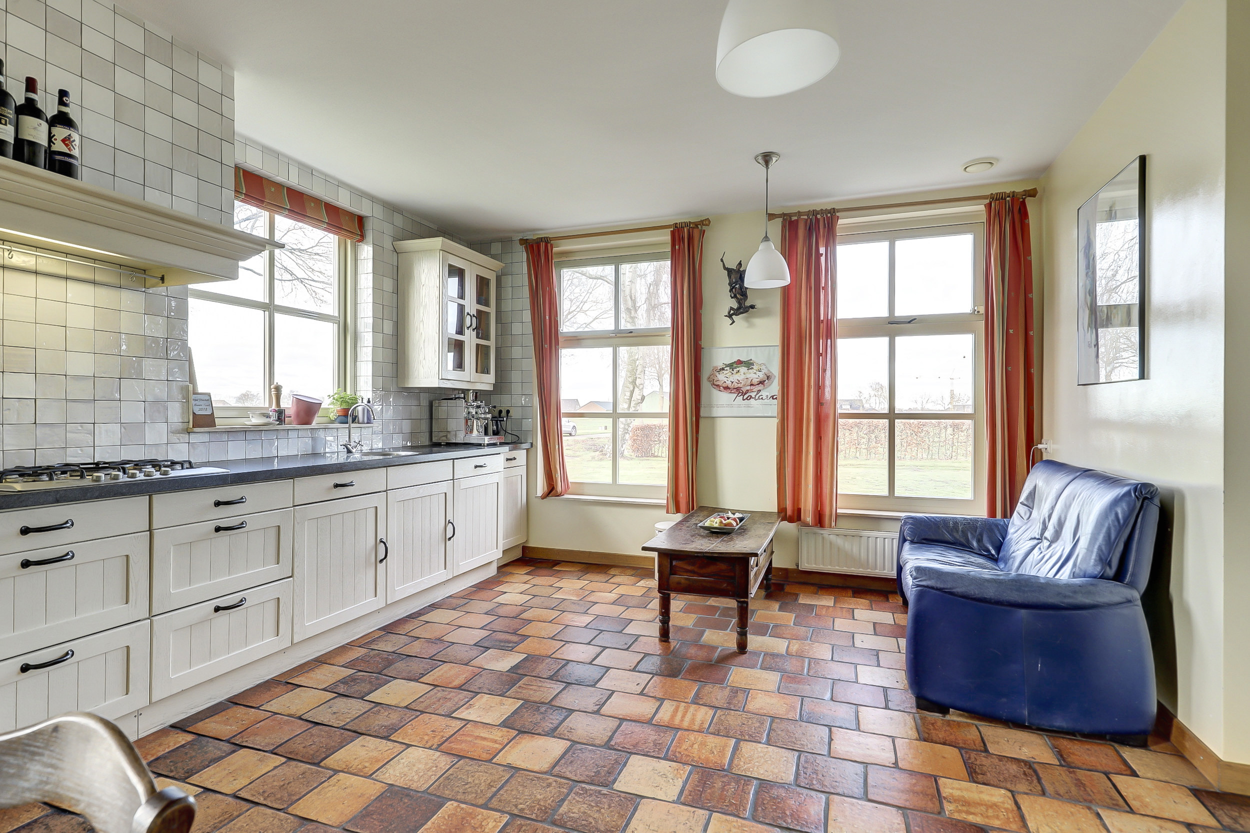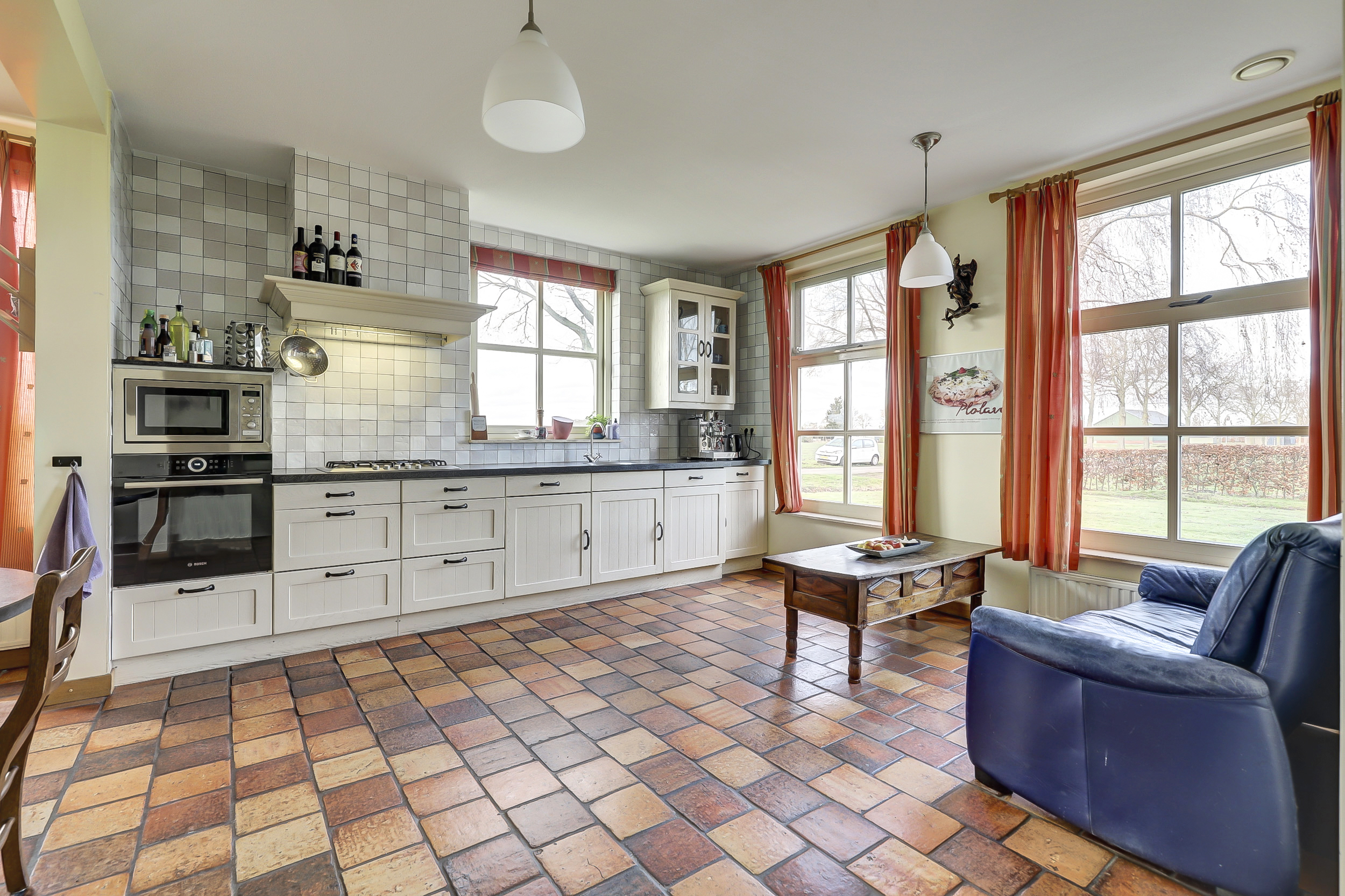 De keukenopstelling is voorzien van een 5-pits gaskookplaat, afzuigkap, oven, magnetron en vaatwasser.