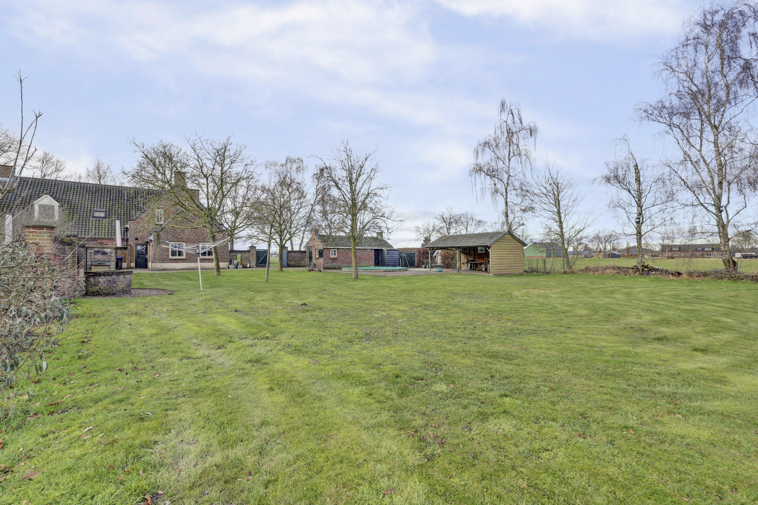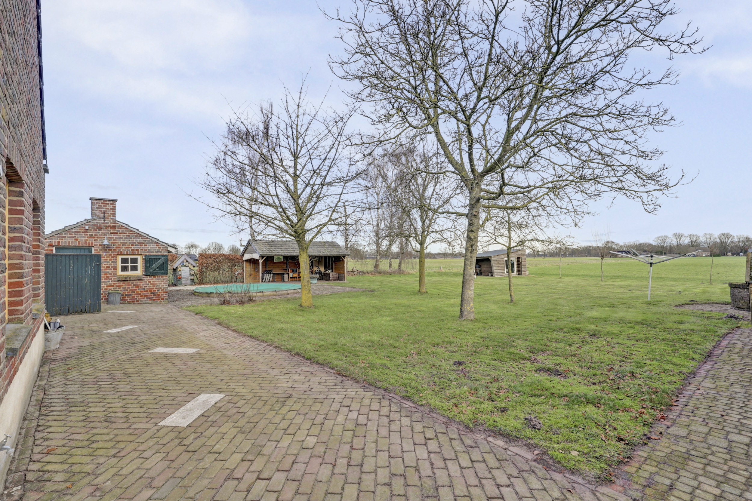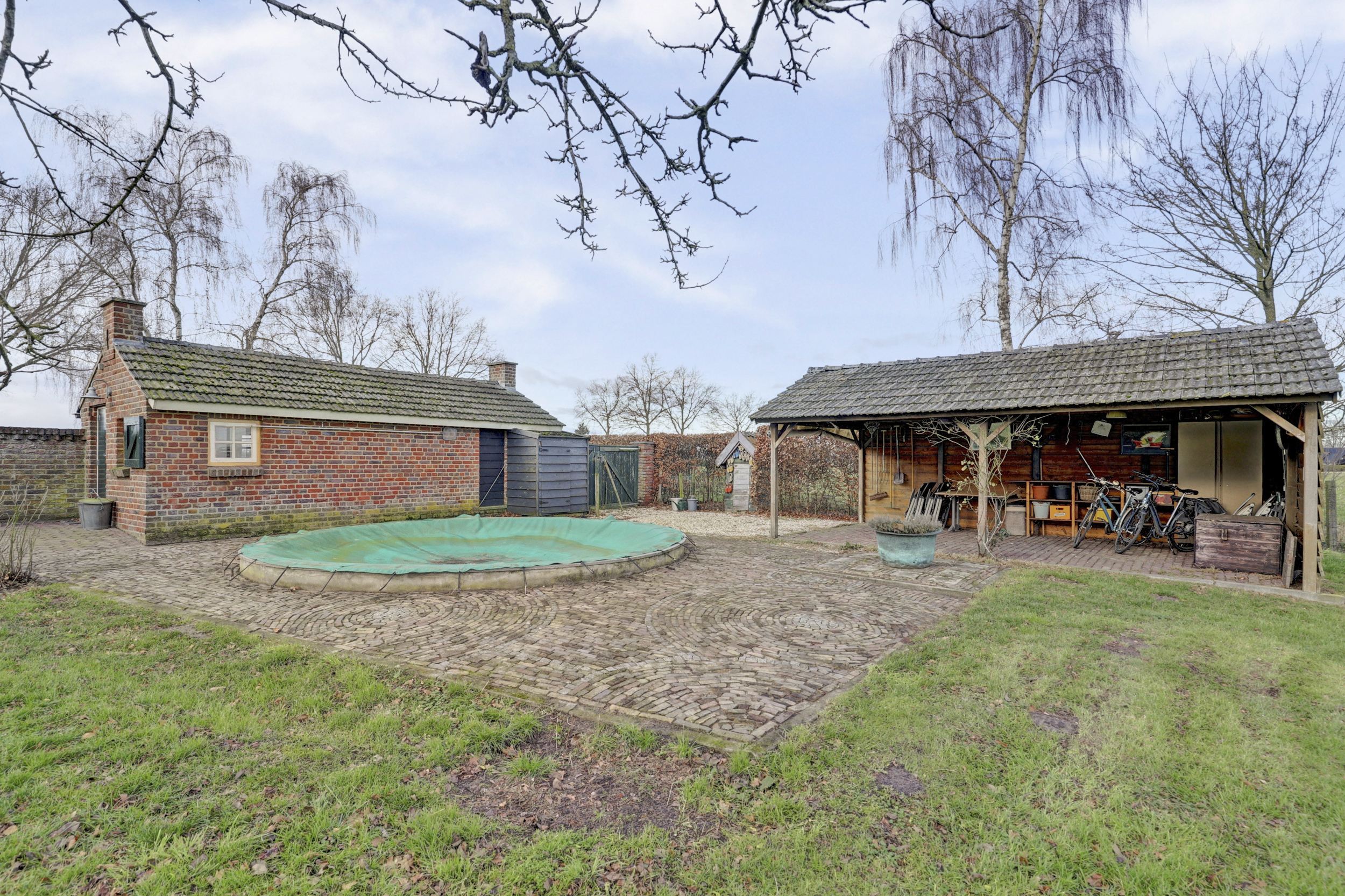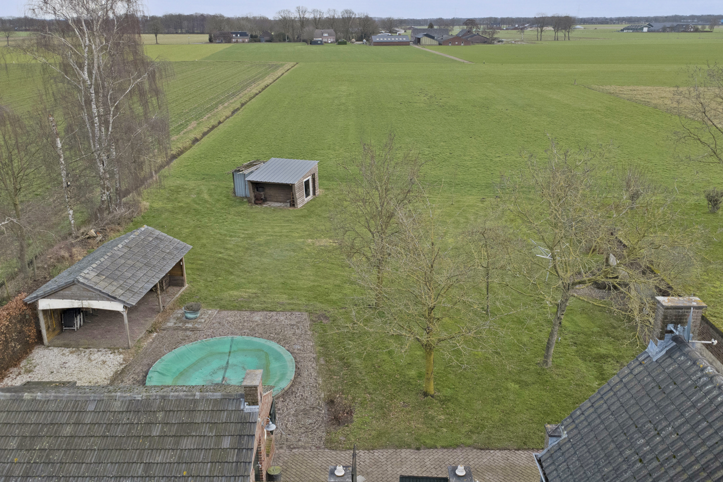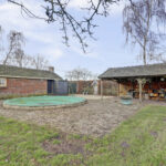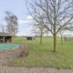 Een vrij gelegen achtertuin met buiten zwembad, sfeervolle veranda en een functioneel bijgebouw.