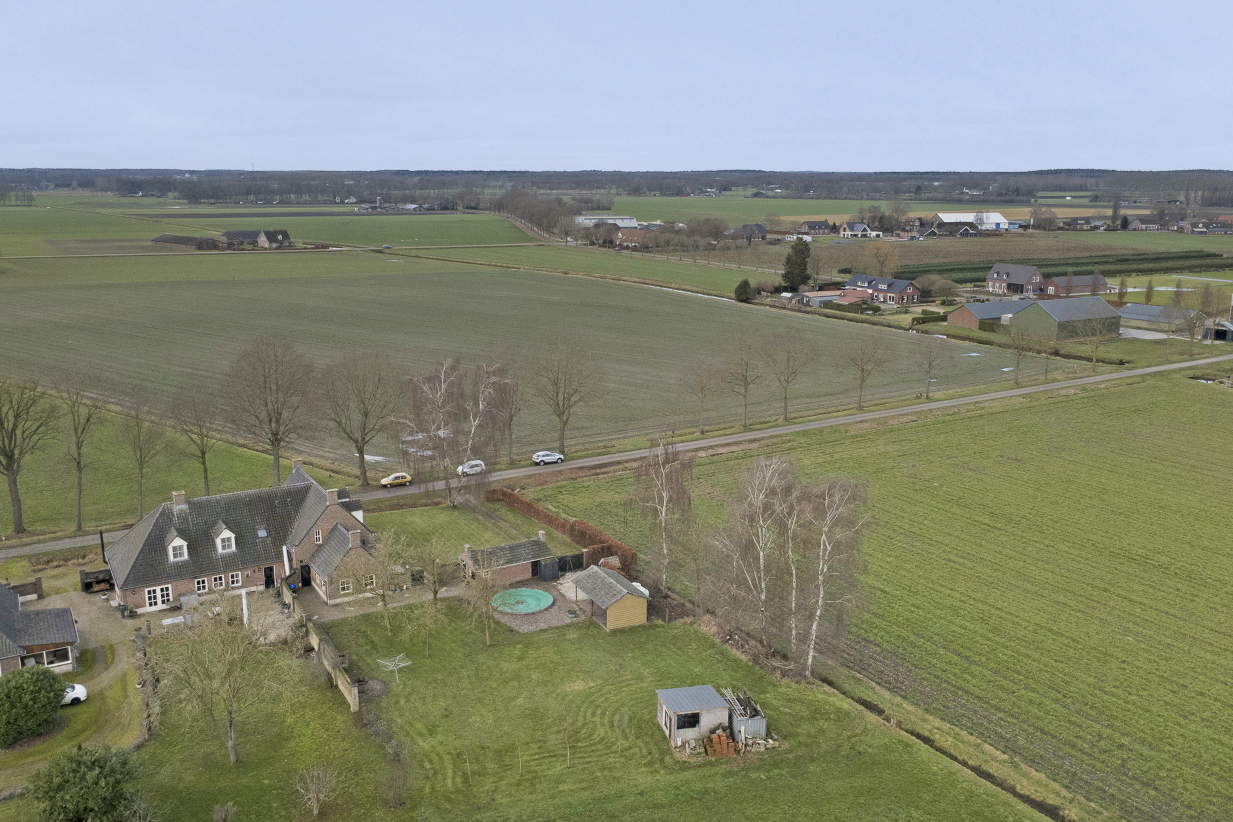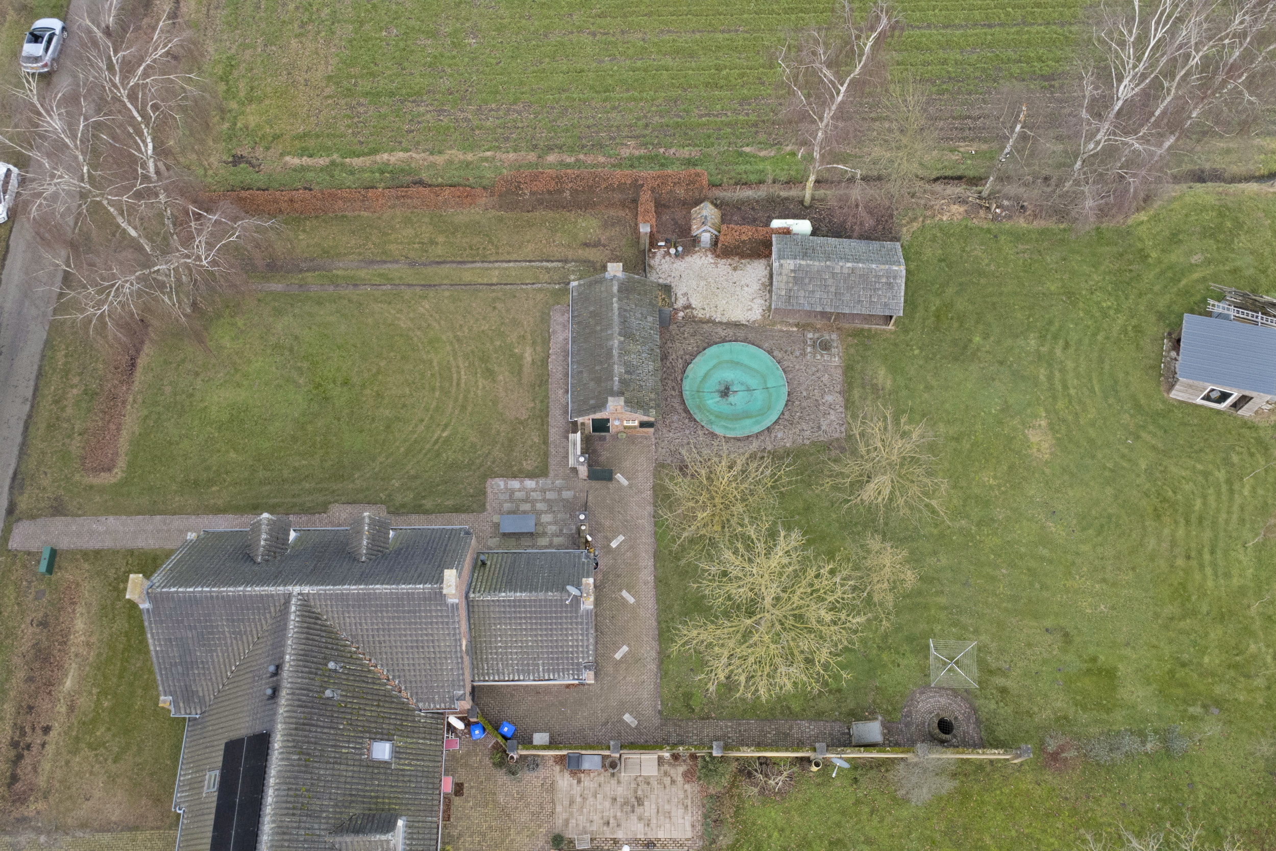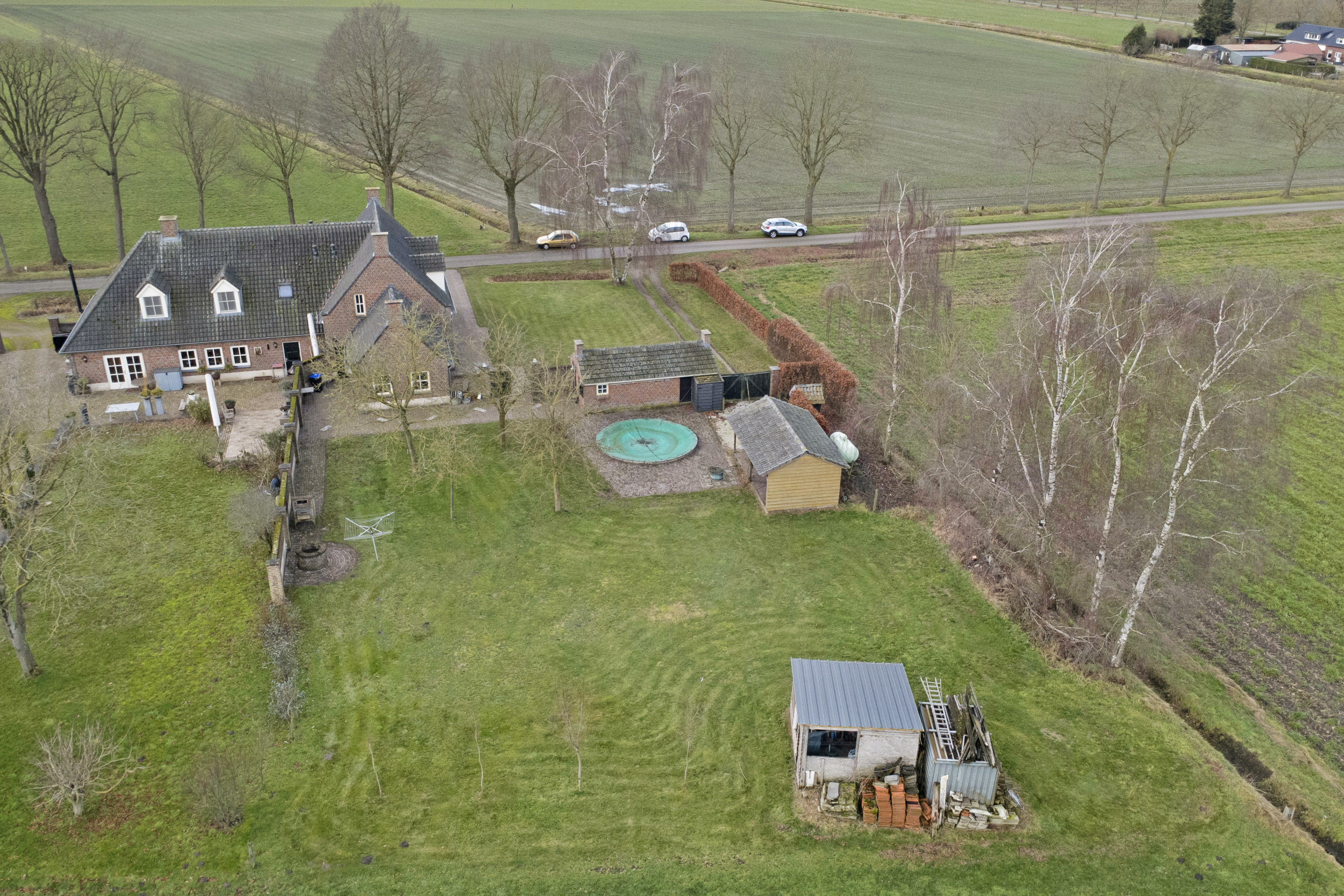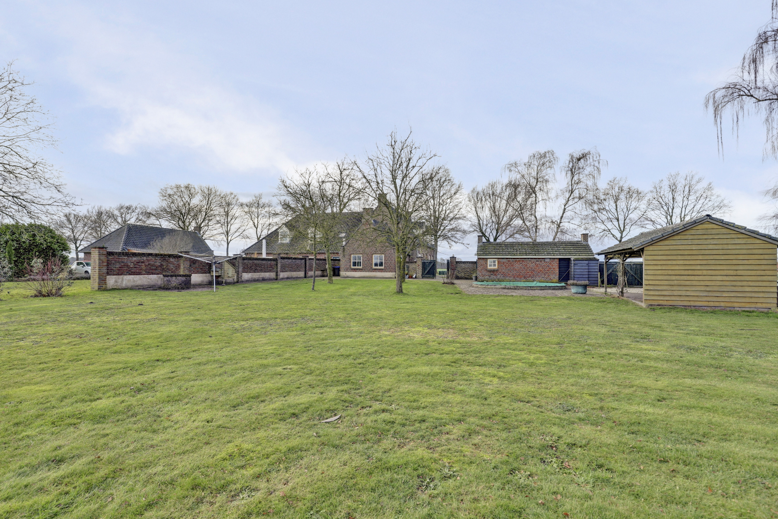 Een vrij gelegen achtertuin met buiten zwembad, sfeervolle veranda en een functioneel bijgebouw.