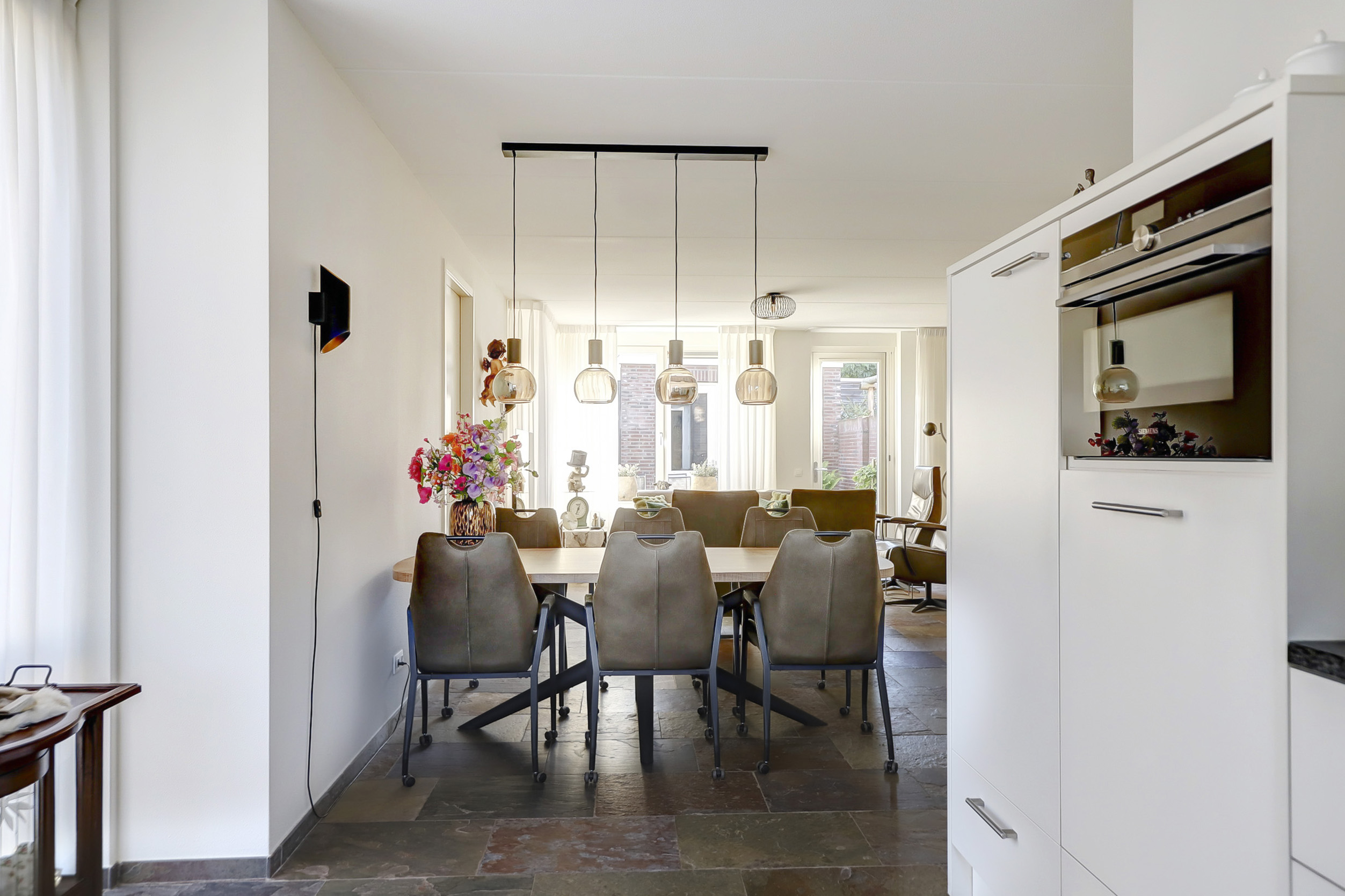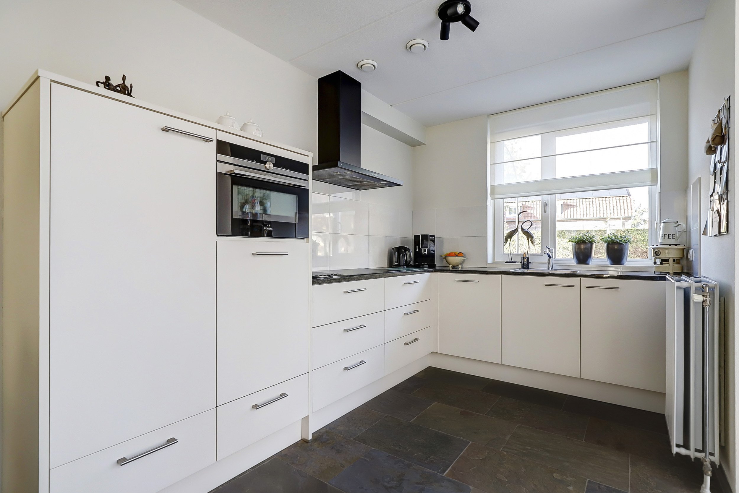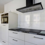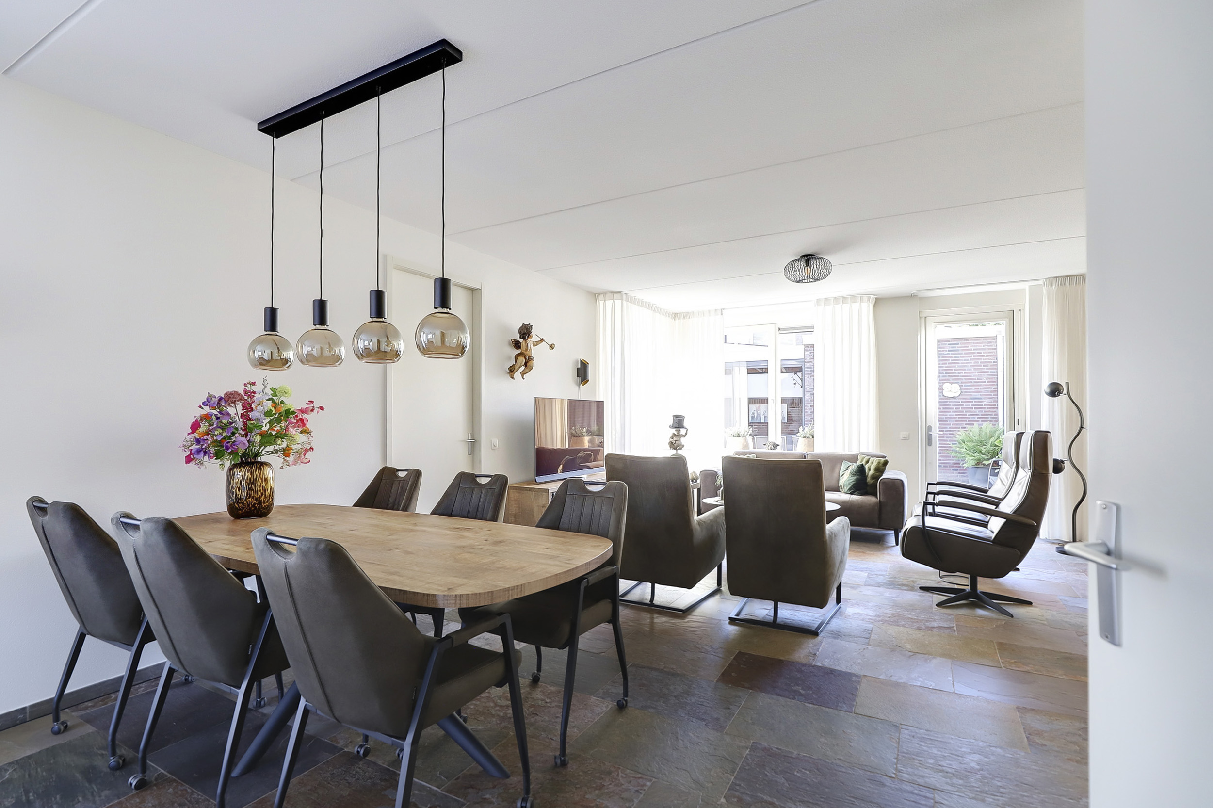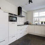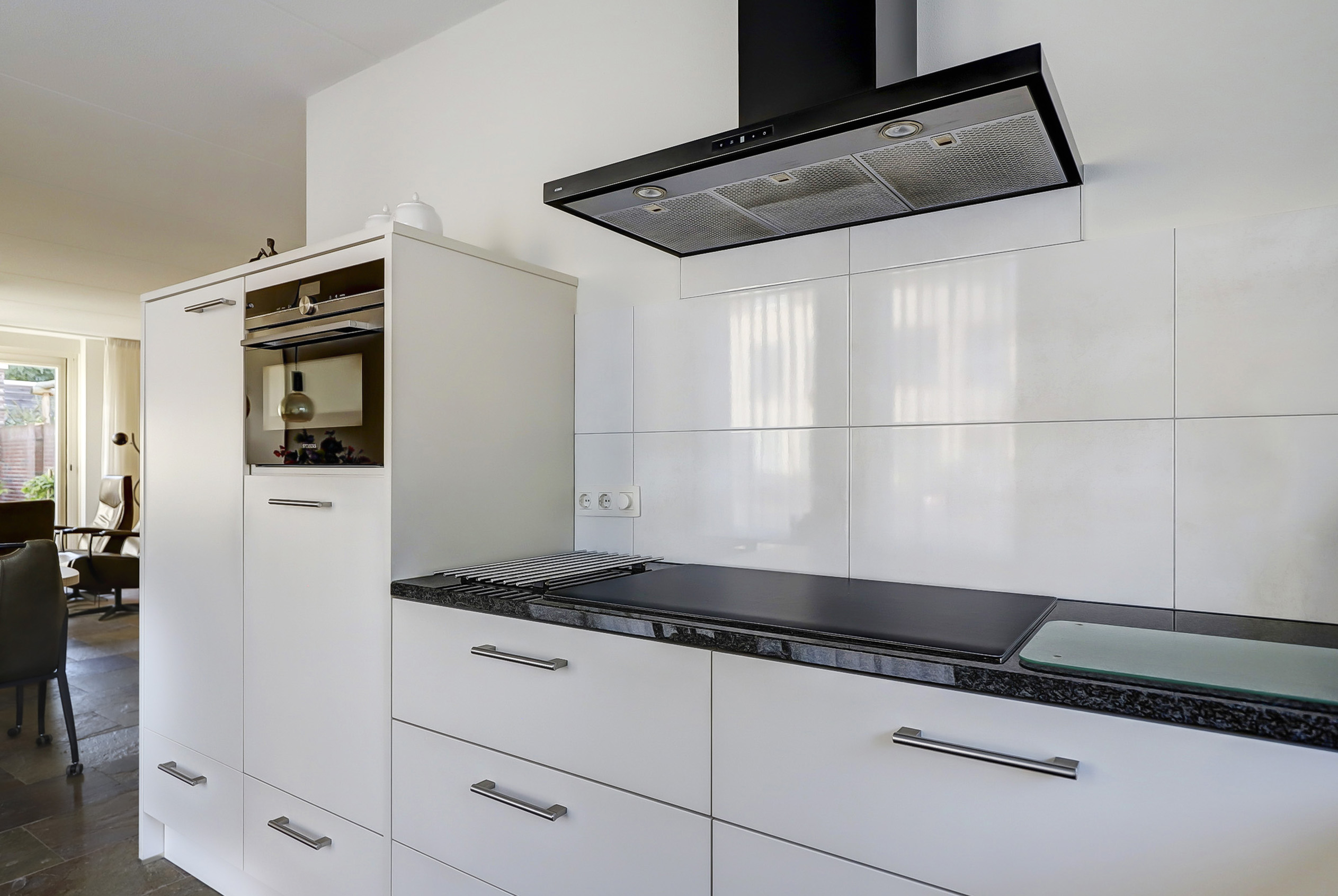 De keukenopstelling is voorzien van een vaatwasser, koelkast, combioven, inductiekookplaat, afzuigkap en een natuurstenen werkblad.