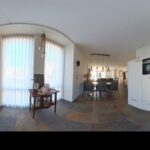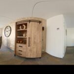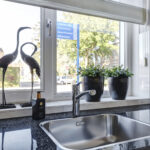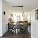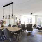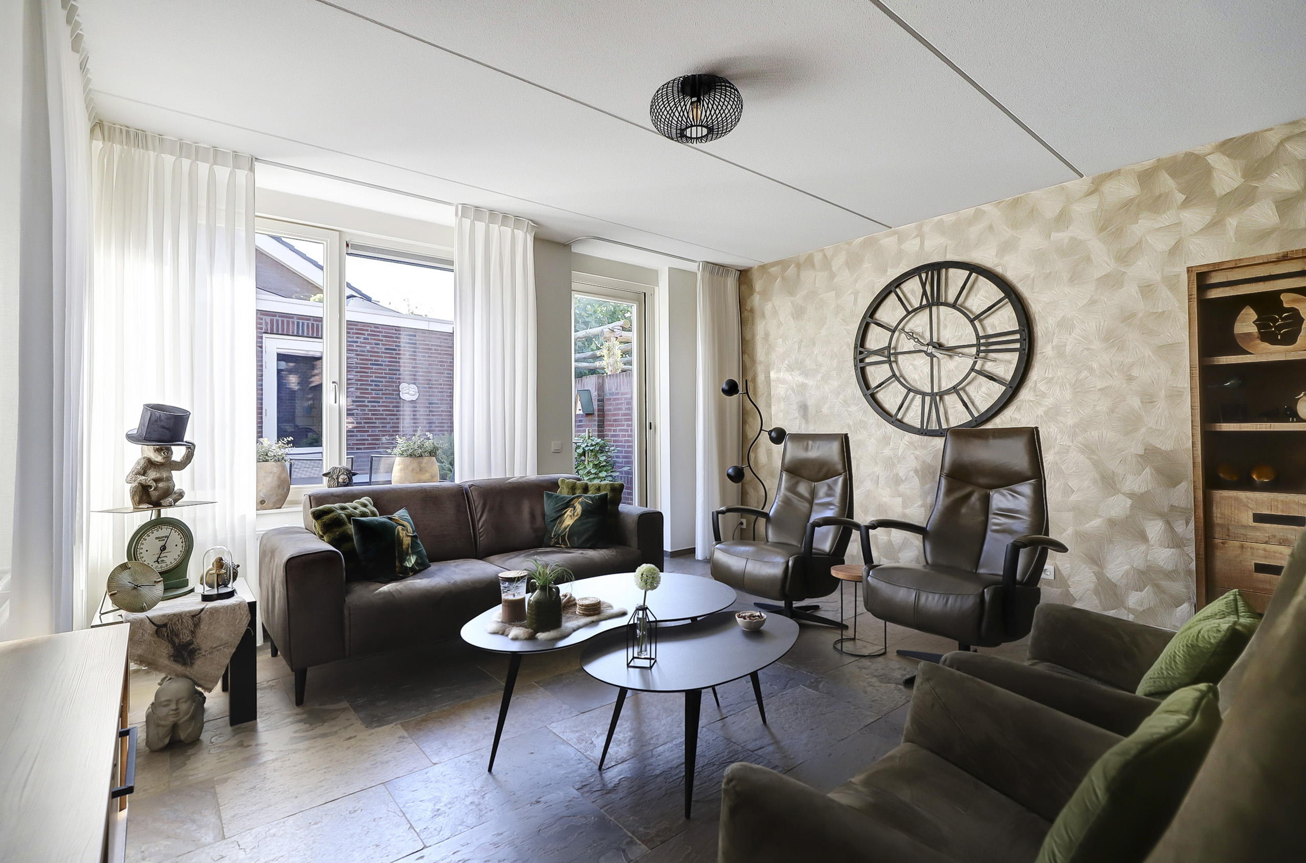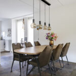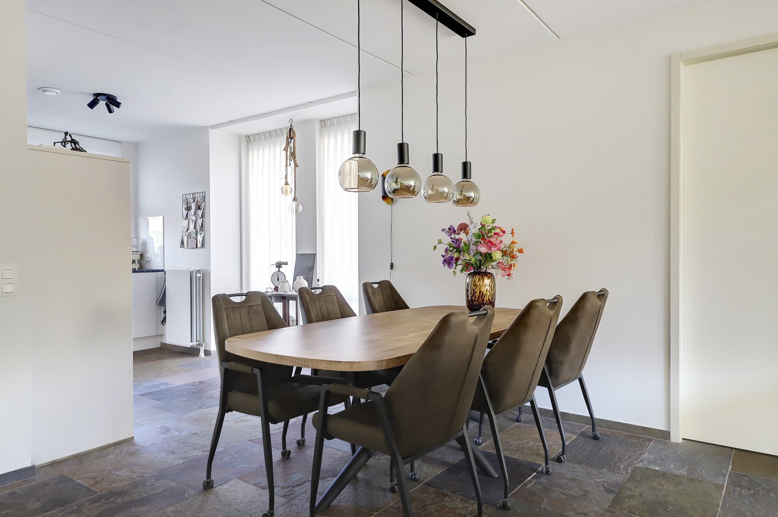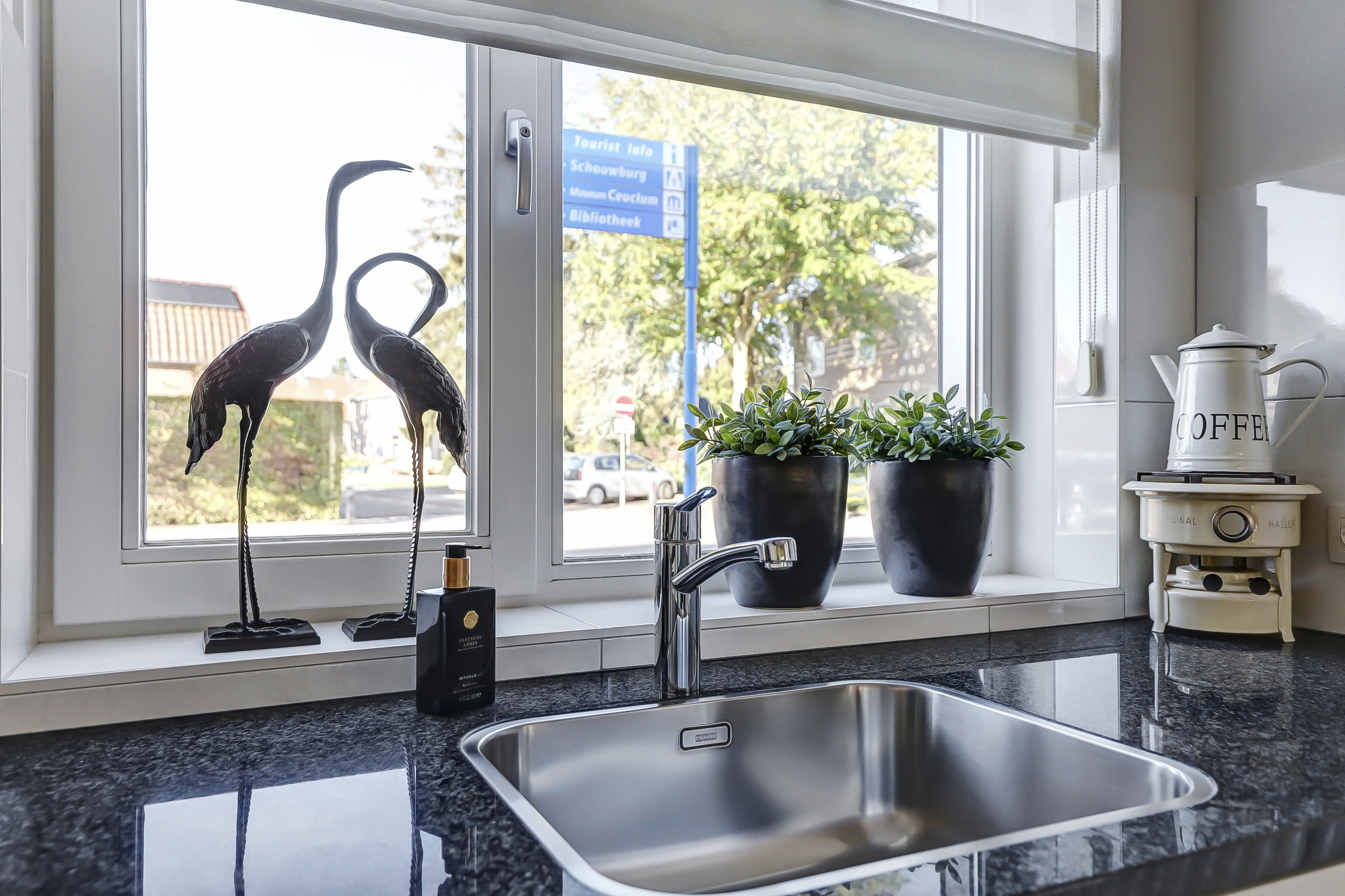 De keukenopstelling is voorzien van een vaatwasser, koelkast, combioven, inductiekookplaat, afzuigkap en een natuurstenen werkblad.