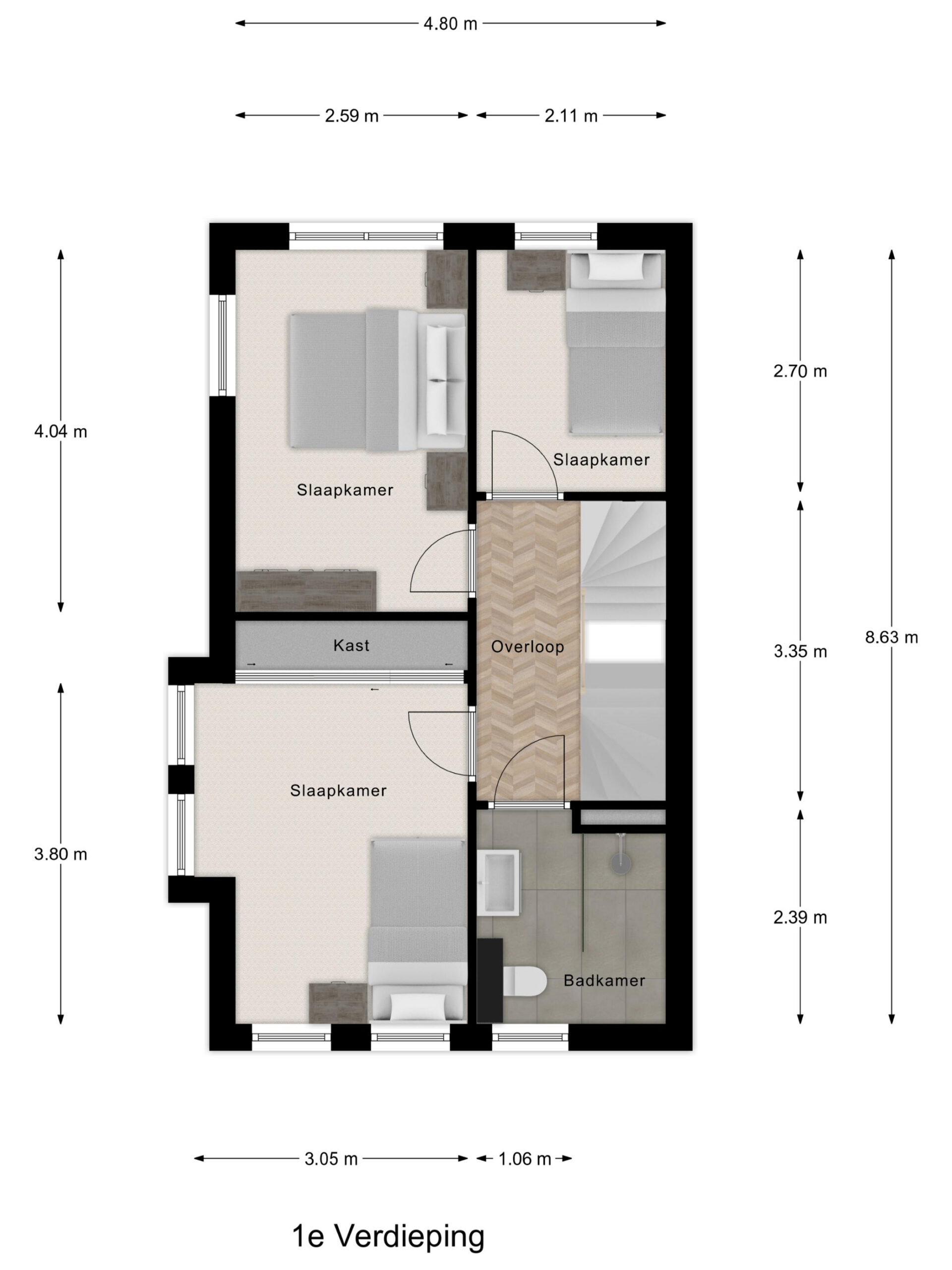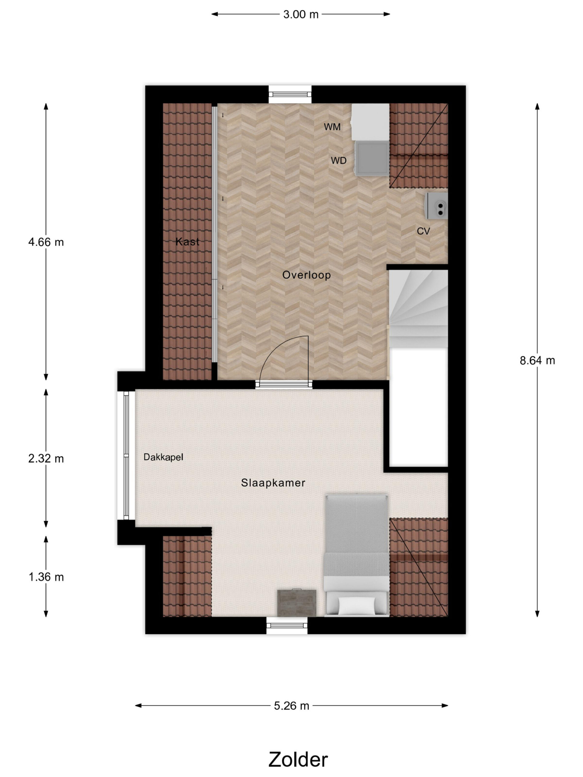 2e verdieping: middels een vaste trap te bereiken ruime overloop met de cv-opstelling en de witgoedaansluitingen, 4e slaapkamer voorzien van een dakkapel.
