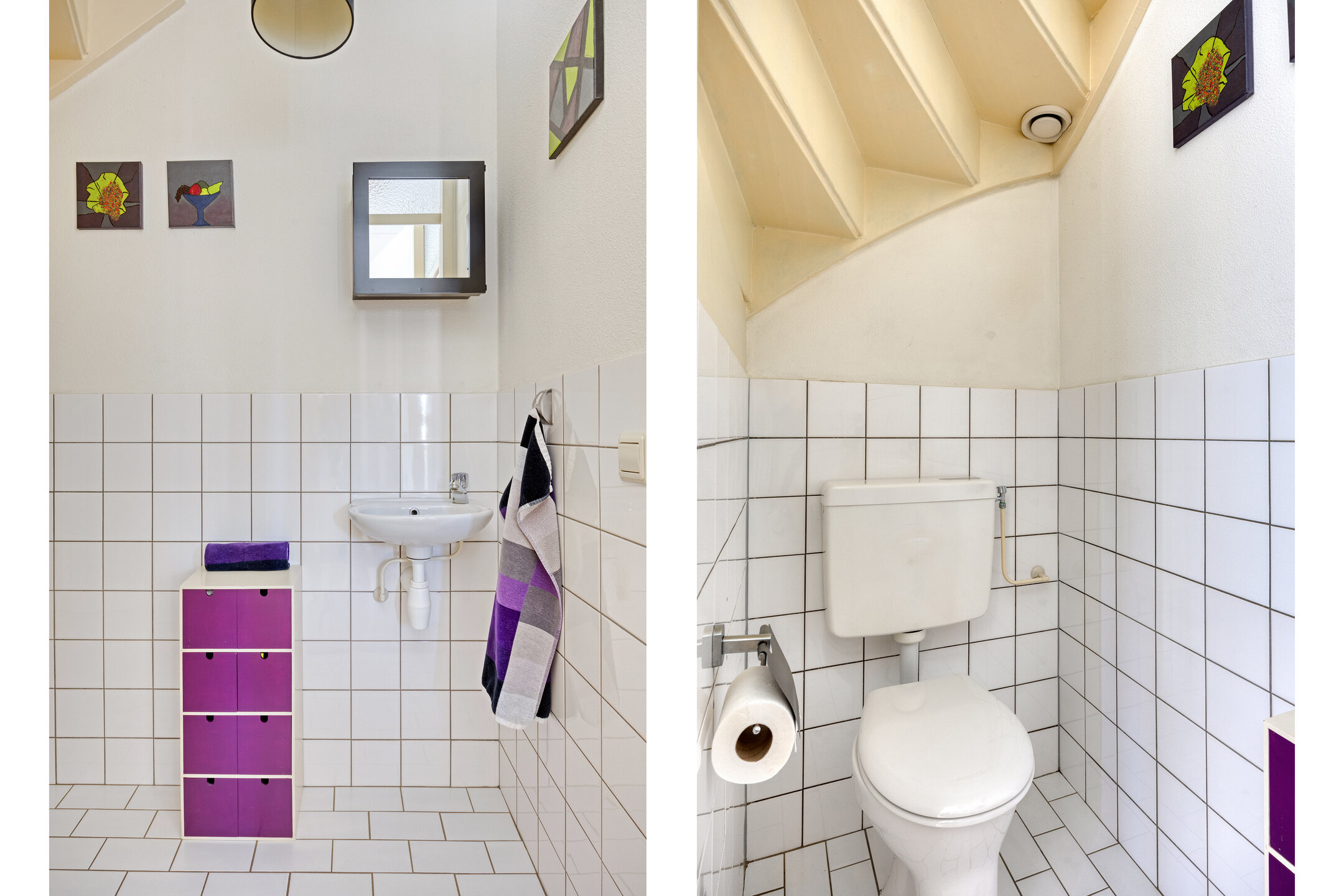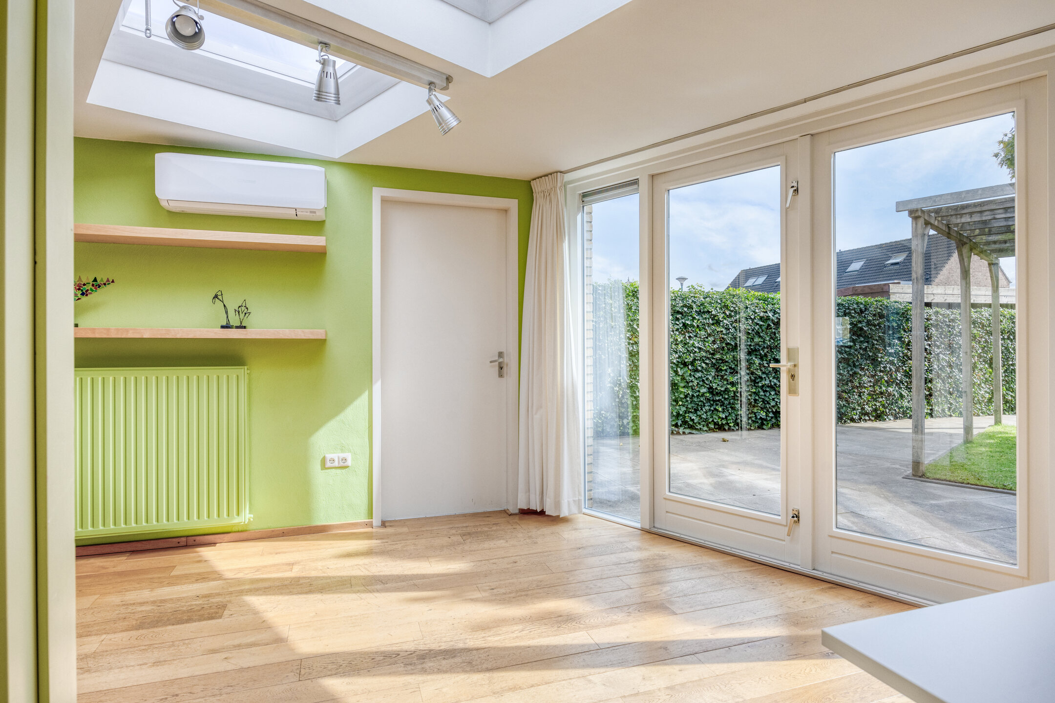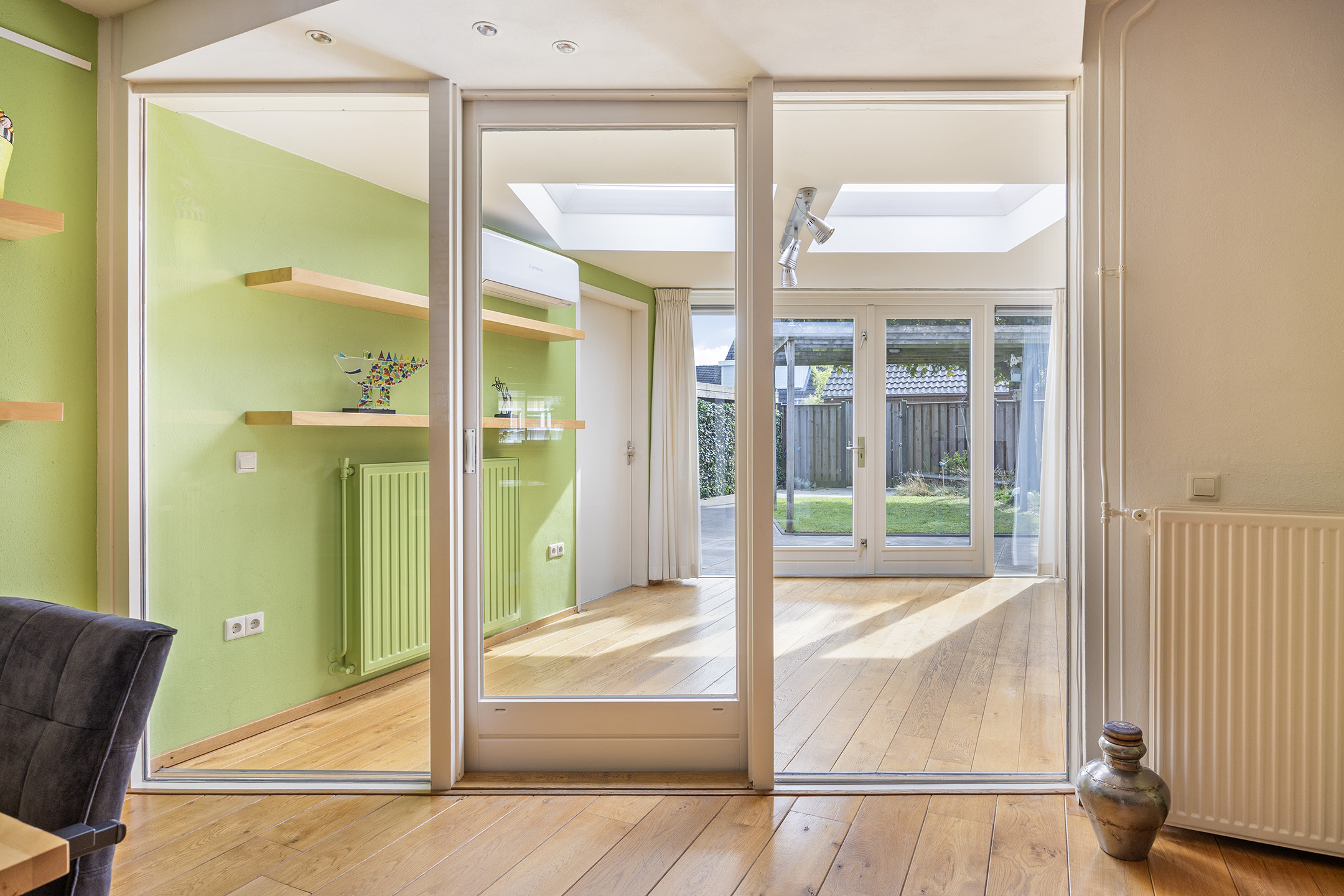 Begane grond: hal met meterkast en toilet met fonteintje. Een leuke en verrassende indeling met halfopen keuken, de centraal gelegen woonkamer, aansluitend een aangebouwde tuinkamer en tv-kamer met toegang tot de garage.