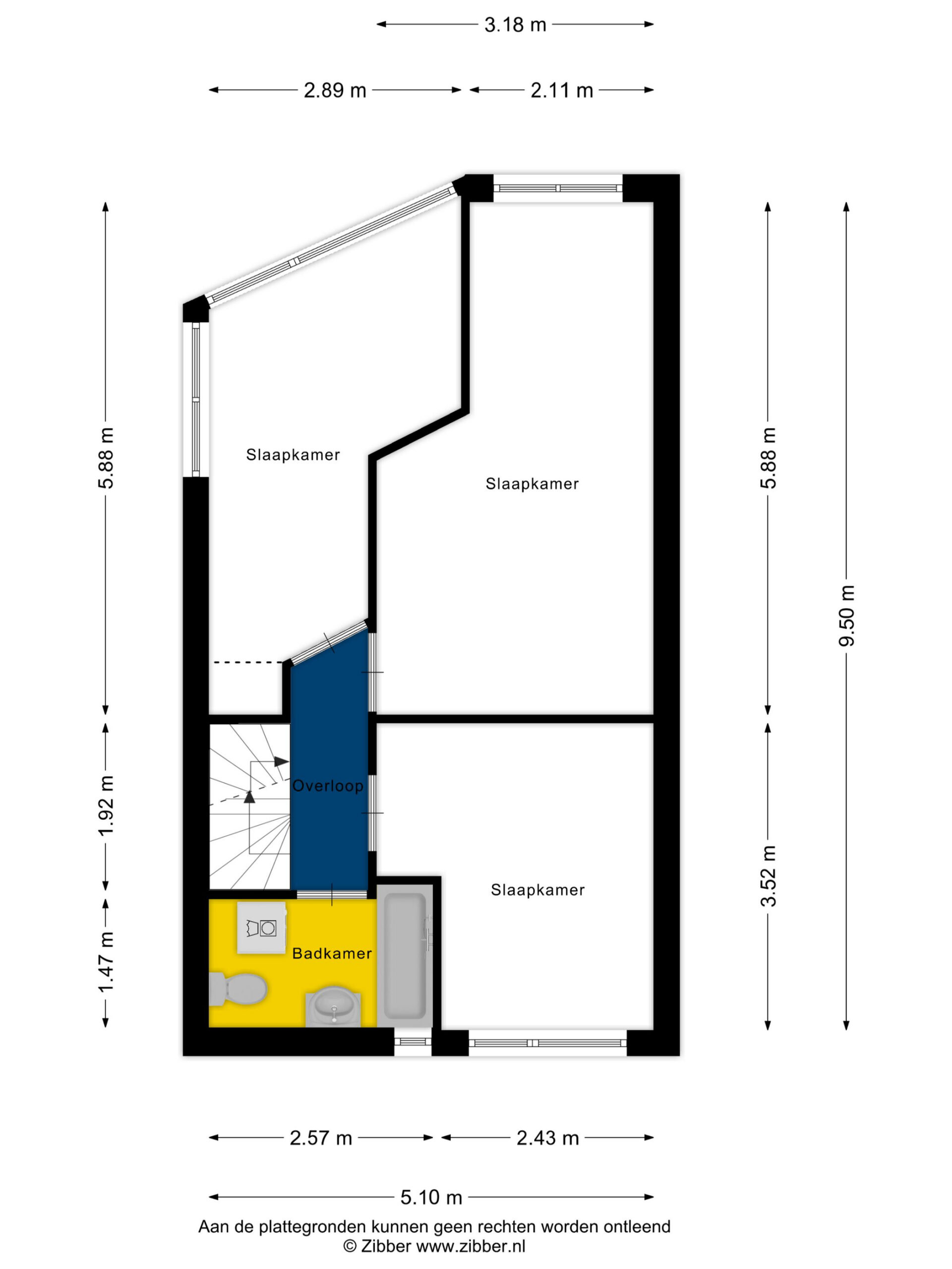 1e verdieping: overloop, 3 slaapkamers, badkamer voorzien van een toilet, wastafel, ligbad en aansluitingen t.b.v. het witgoed.