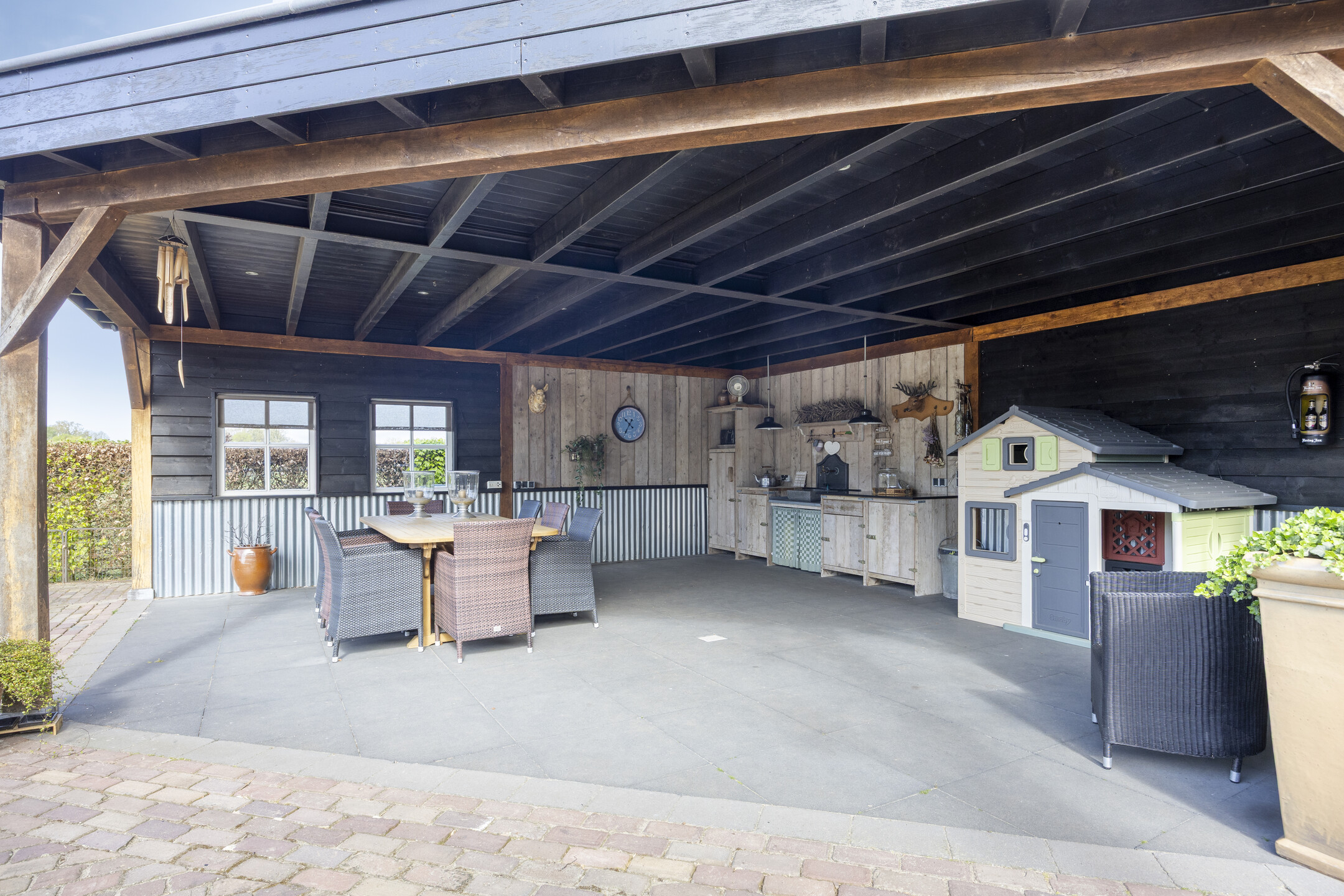 De fraai aangelegde achtertuin beschikt over een beregeningsinstallatie met pomp en een fraaie veranda met buitenkeuken.
