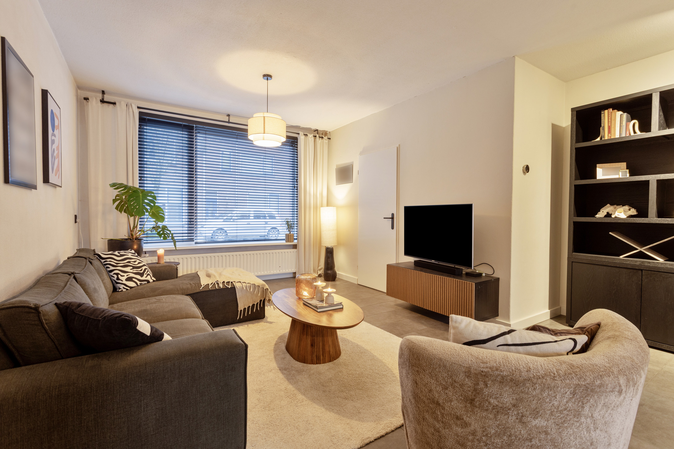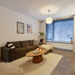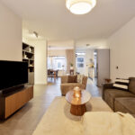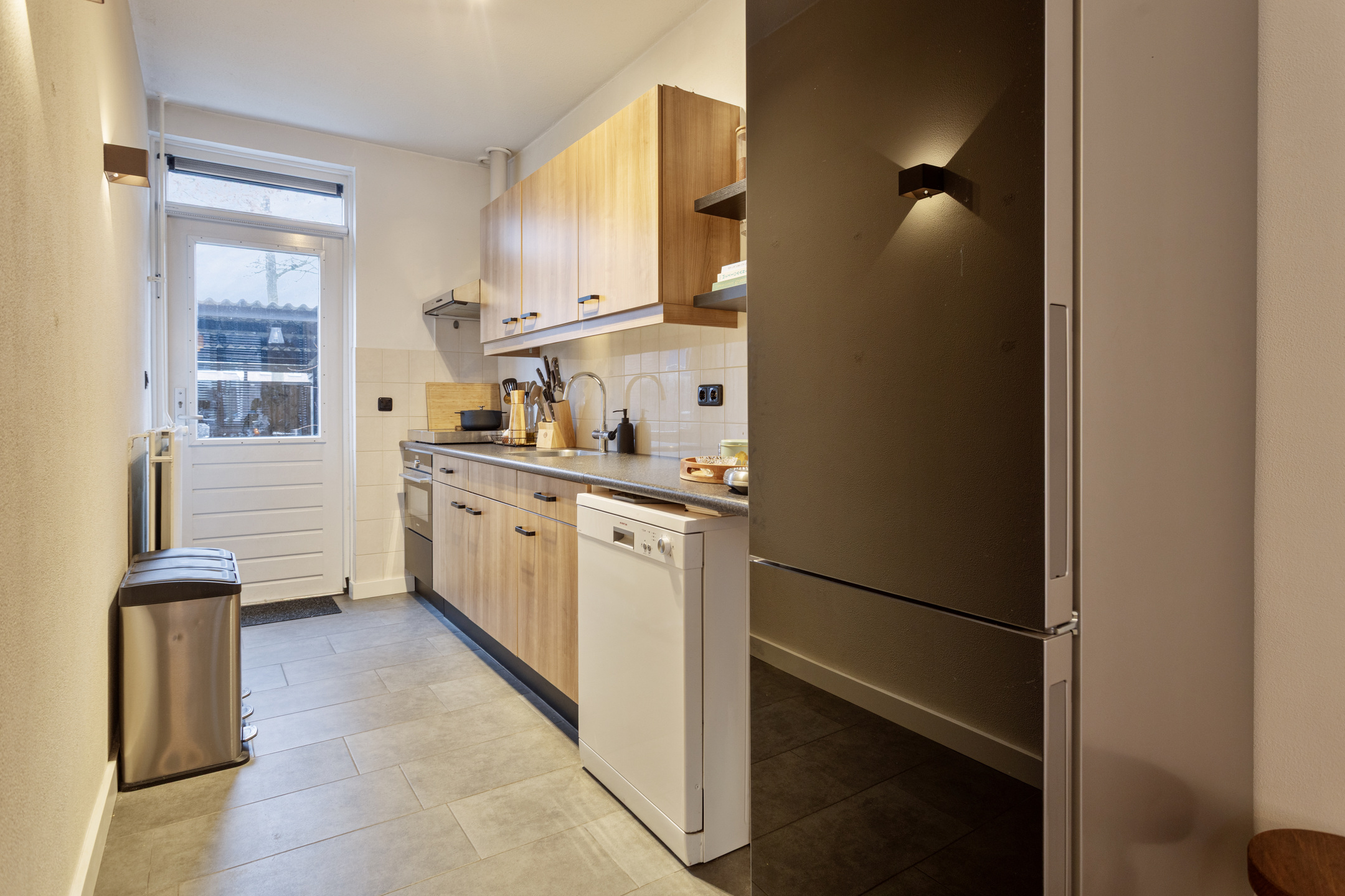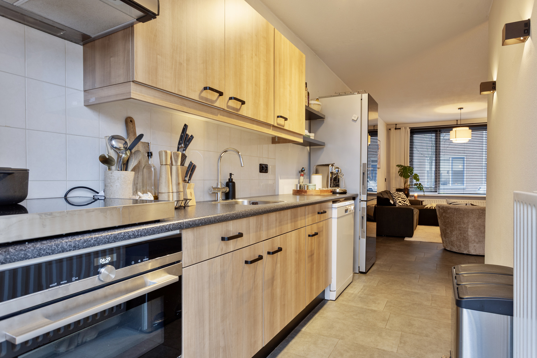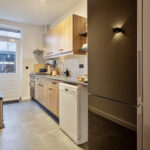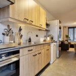 De keukenopstelling is voorzien van een inductiekookplaat, afzuigkap, oven en vaatwasser.