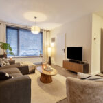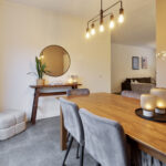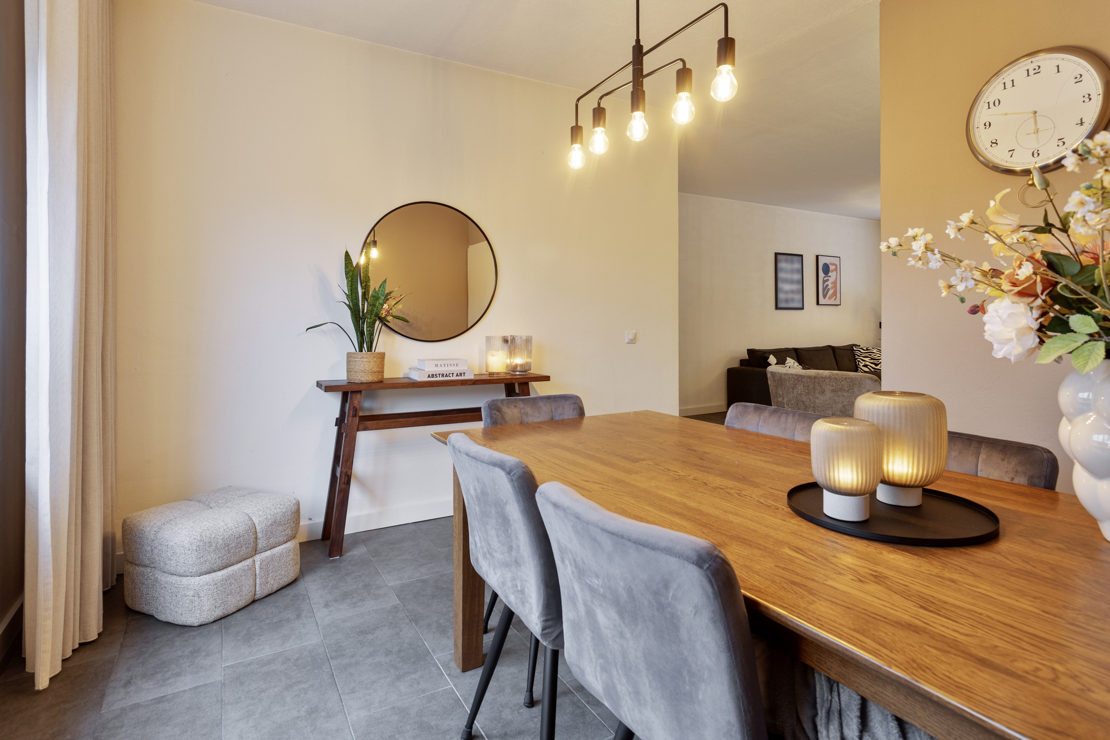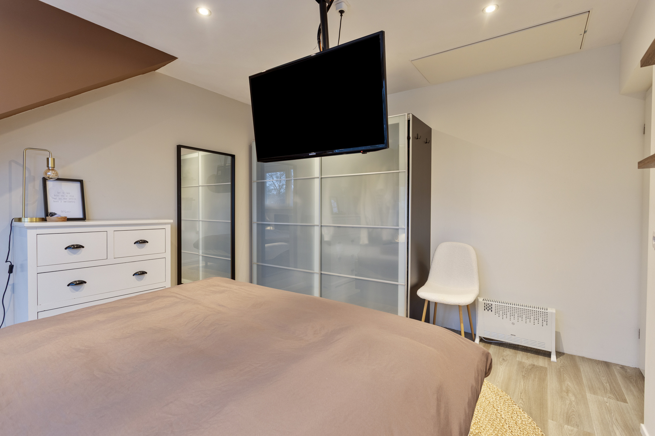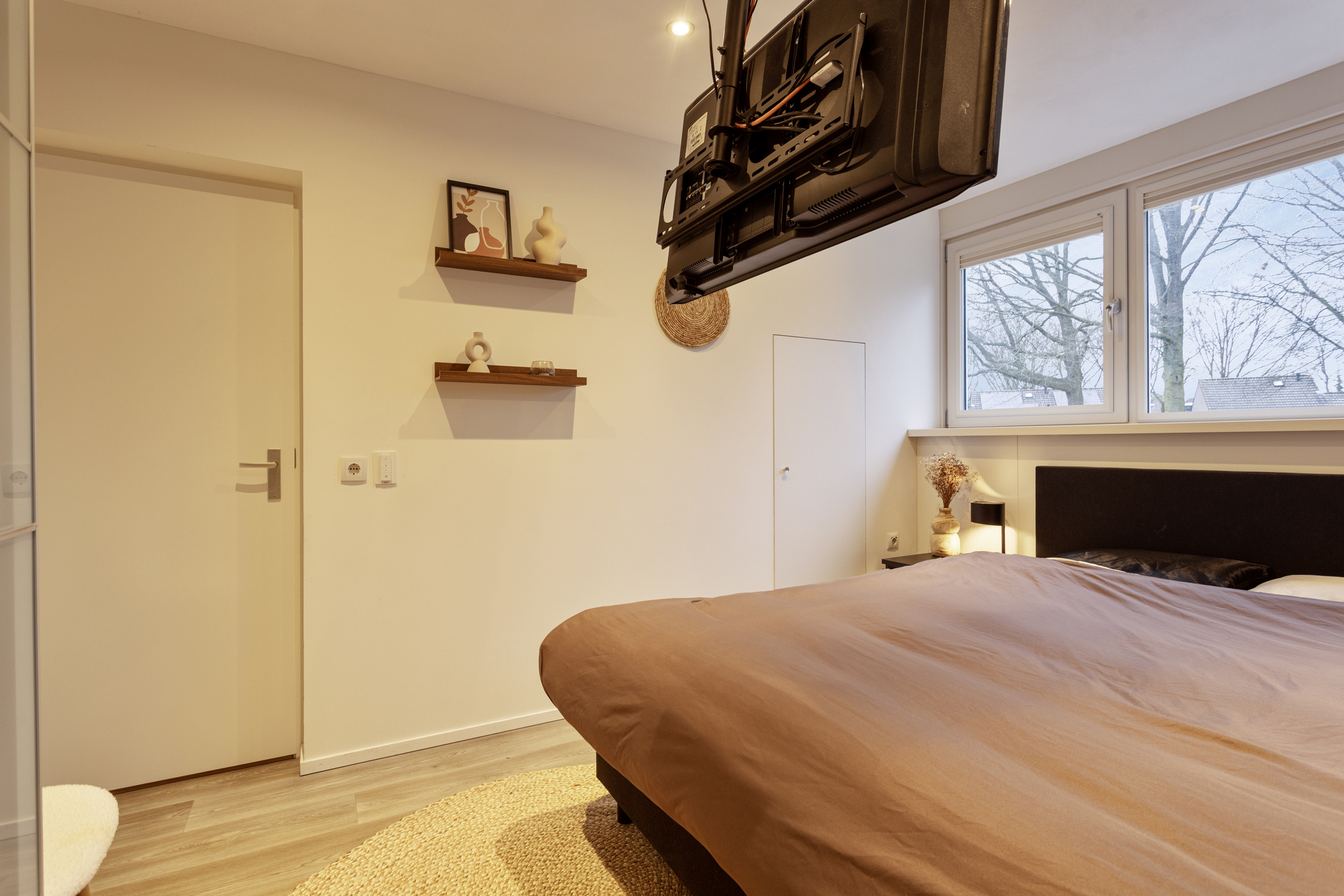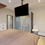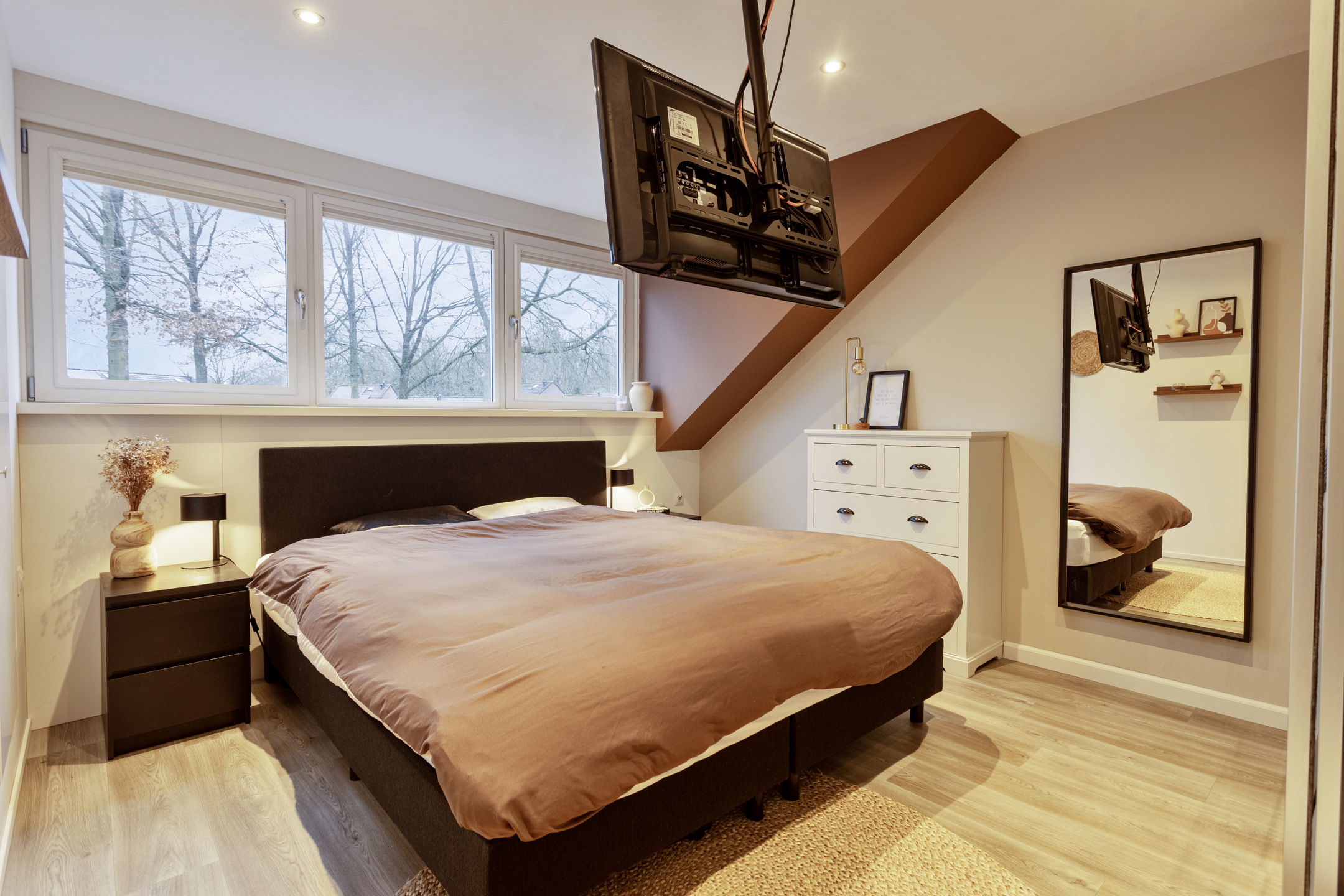 De keukenopstelling is voorzien van een inductiekookplaat, afzuigkap, oven en vaatwasser.