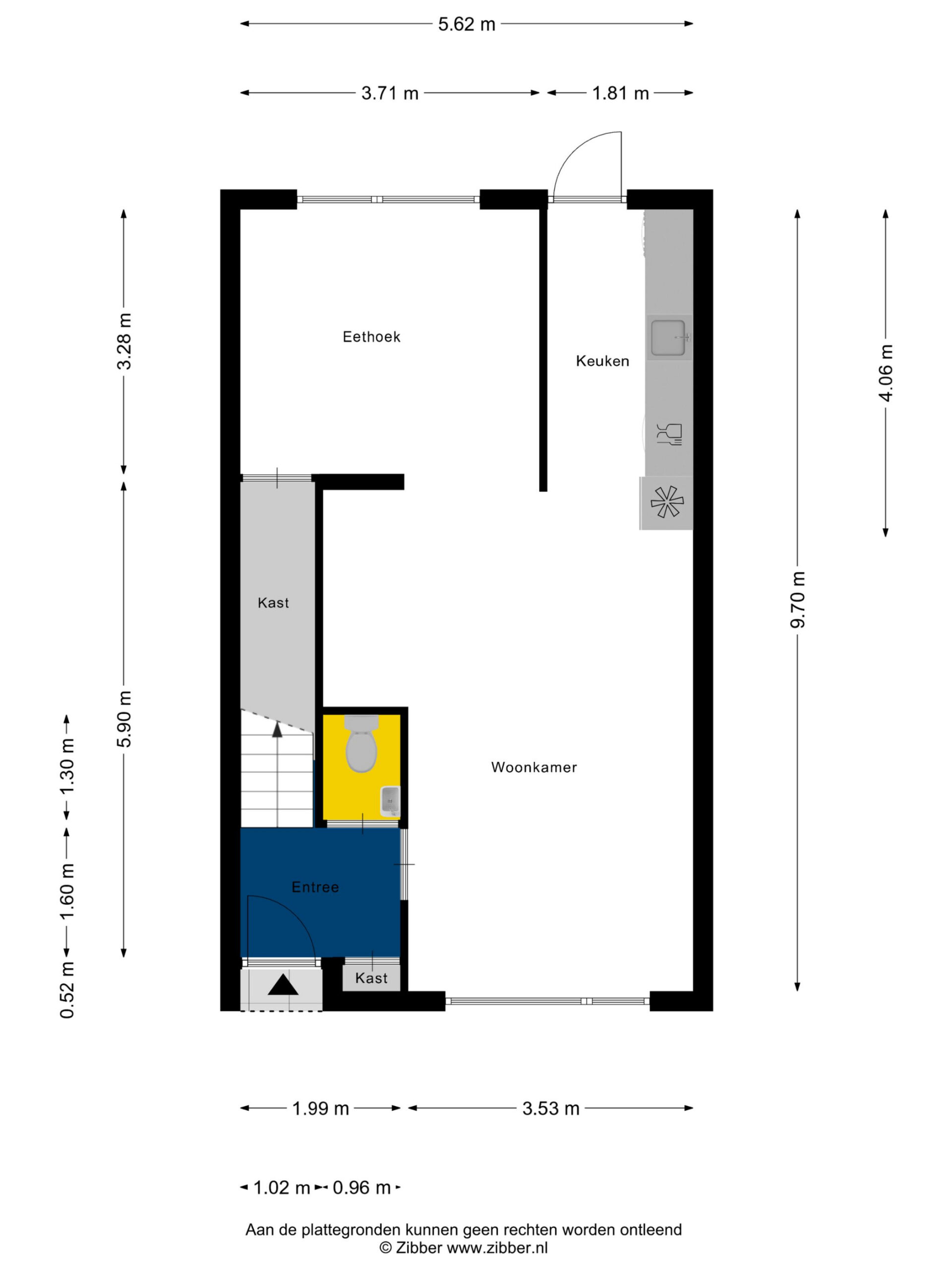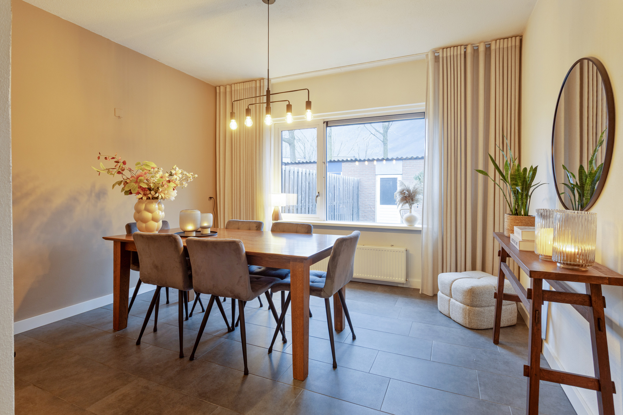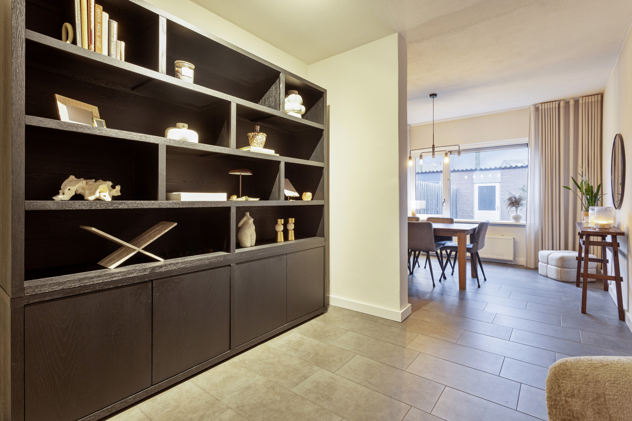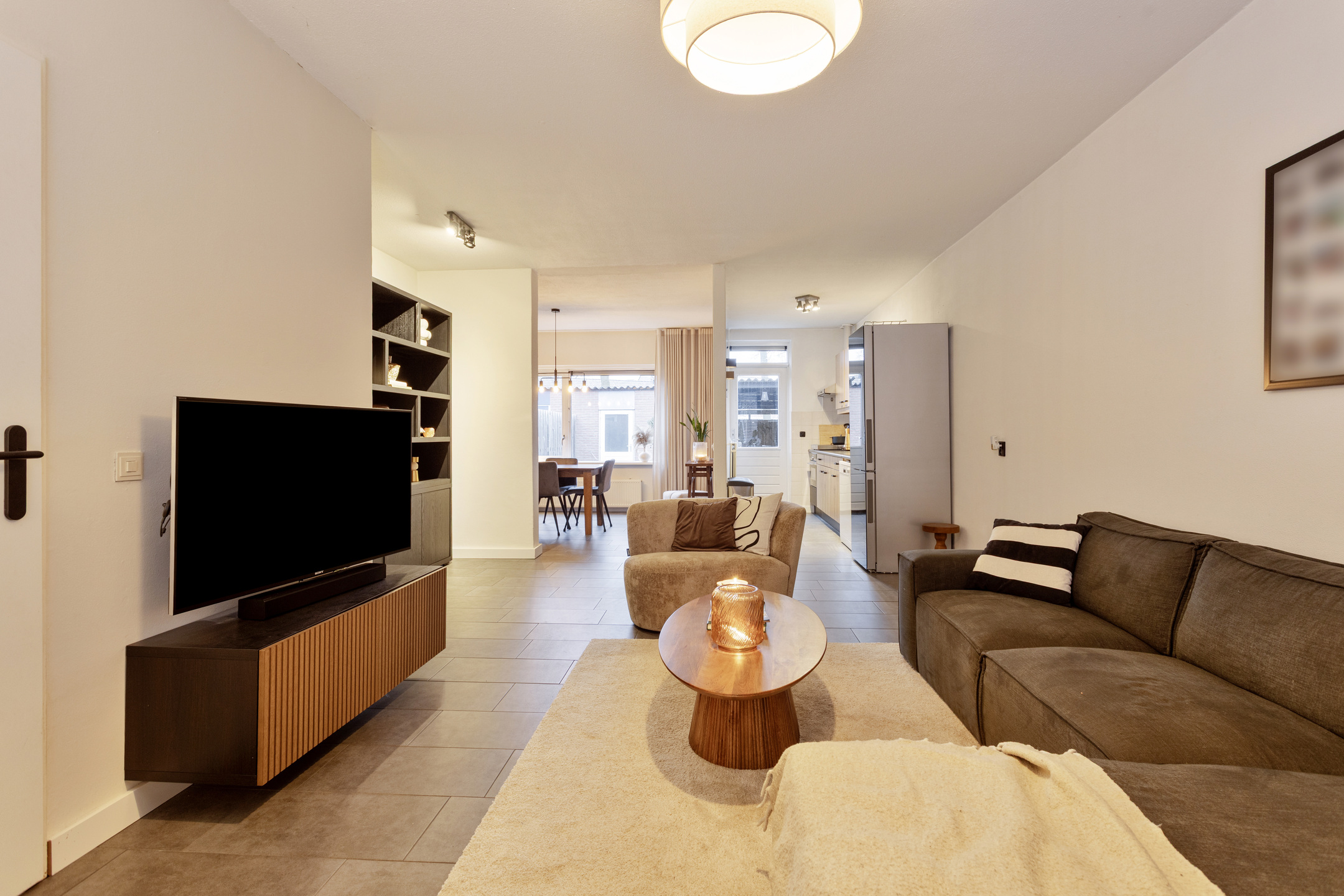 Begane grond: hal met meterkast en toiletruimte voorzien van toilet en fonteintje. Zeer ruime en lichte woonkamer, aan de achterzijde bevindt zich de eetkamer met zicht op de achtertuin, halfopen keuken voorzien van diverse inbouwapparatuur.