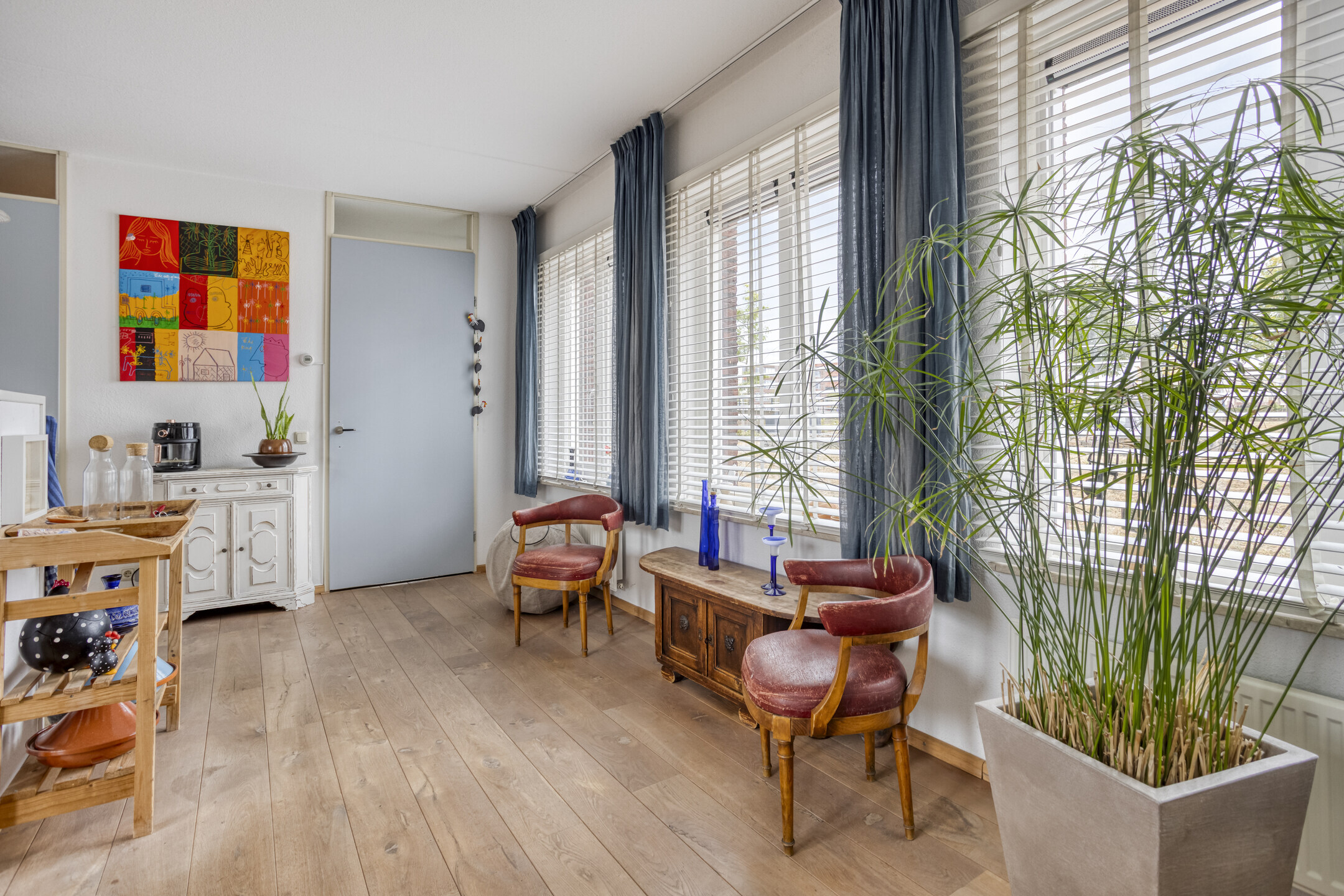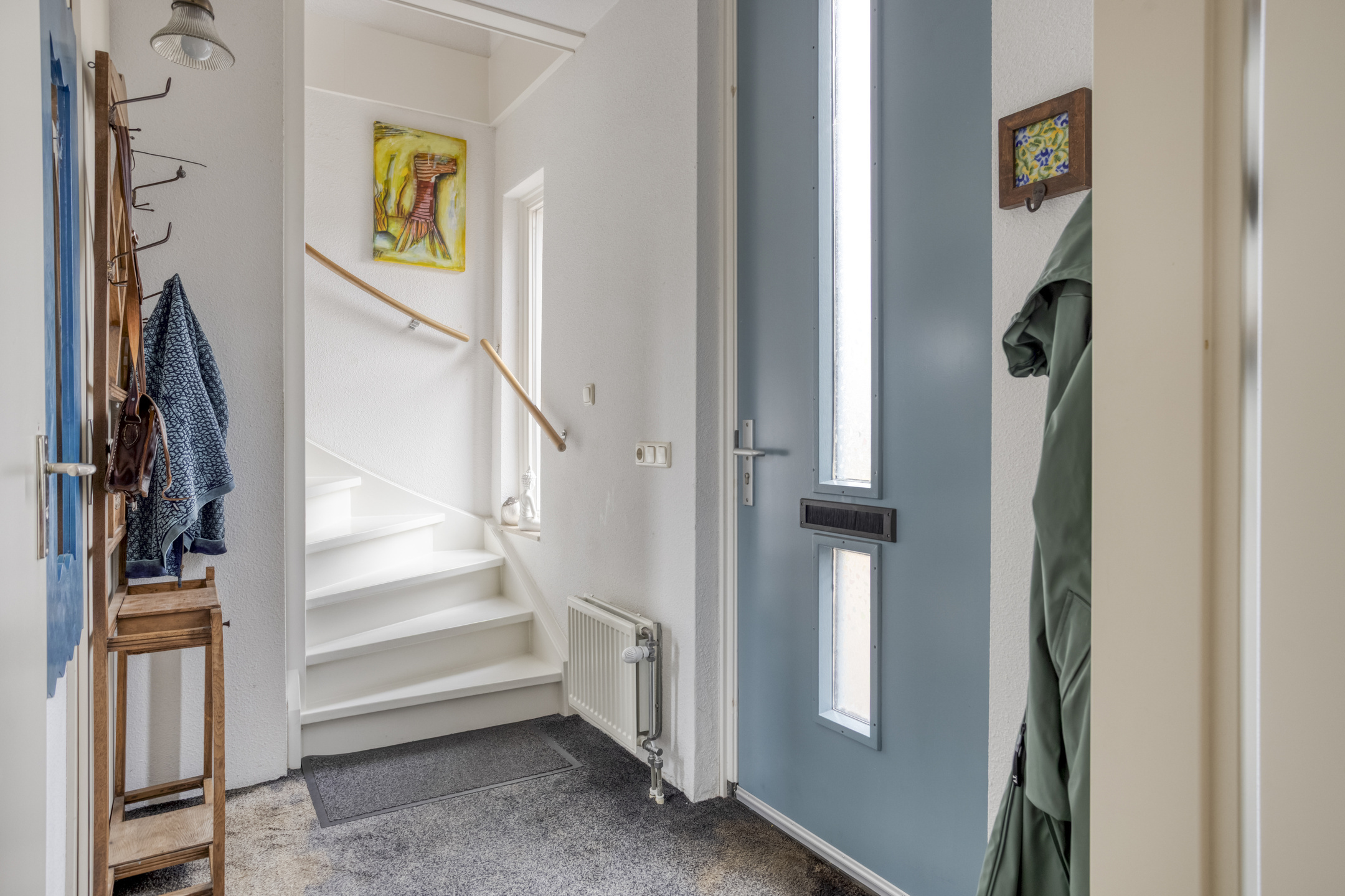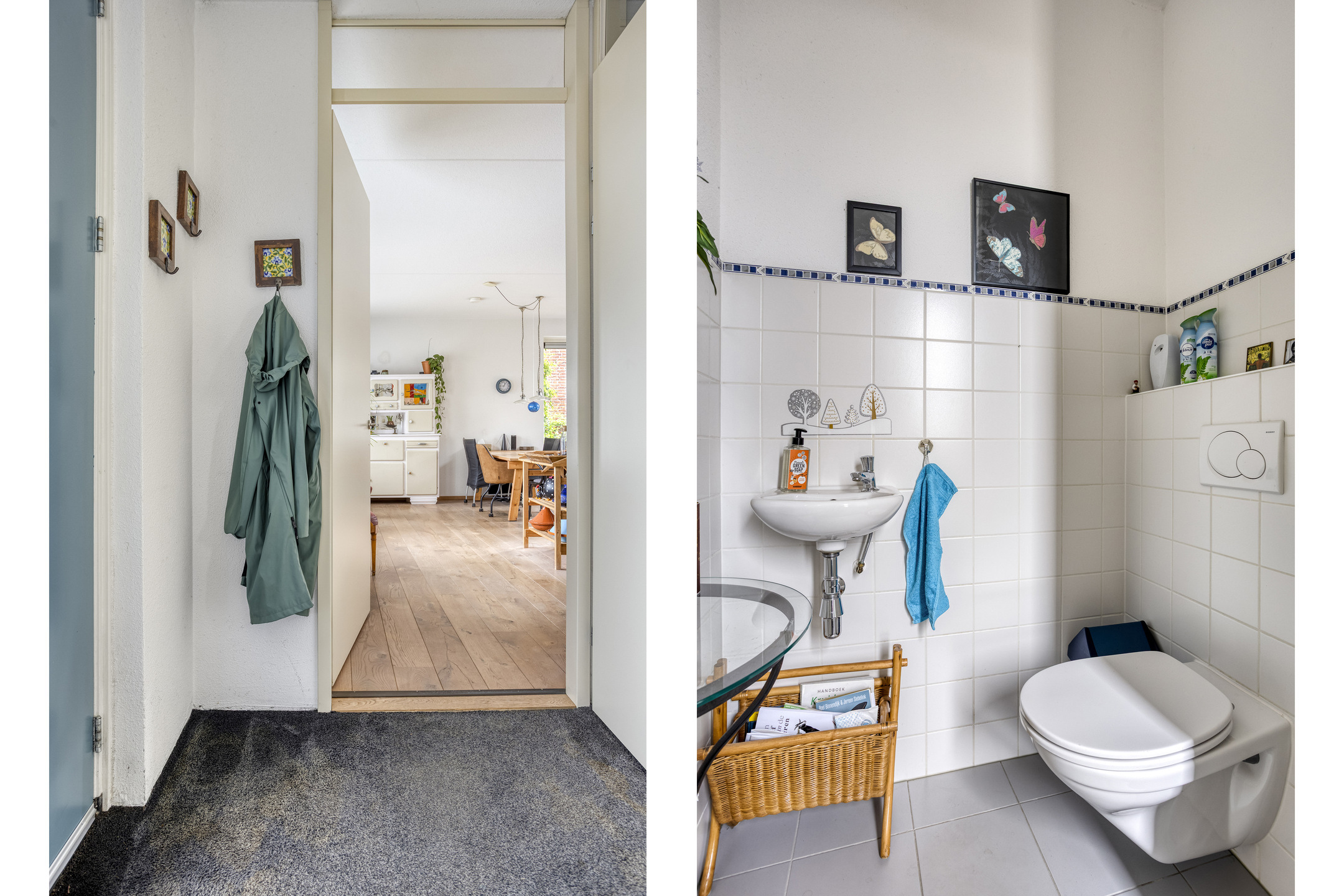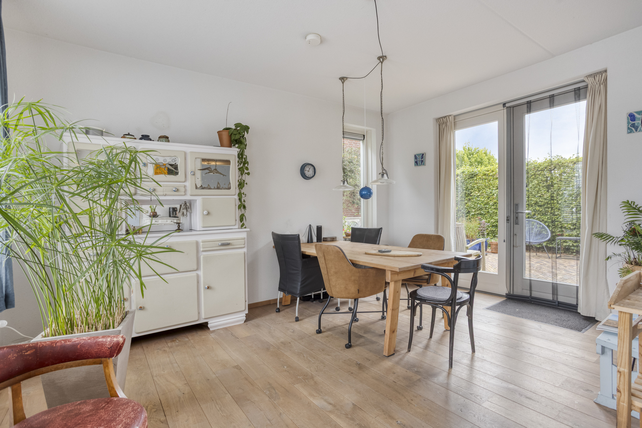Hal met meterkast, modern zwevend toilet met fonteintje en trapopgang. Open woonkeuken met eetkamer, voorzien van openslaande tuindeuren en inpandige berging. De karakteristieke houten vloer geeft warmte en sfeer aan de hele begane grond.