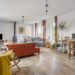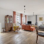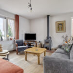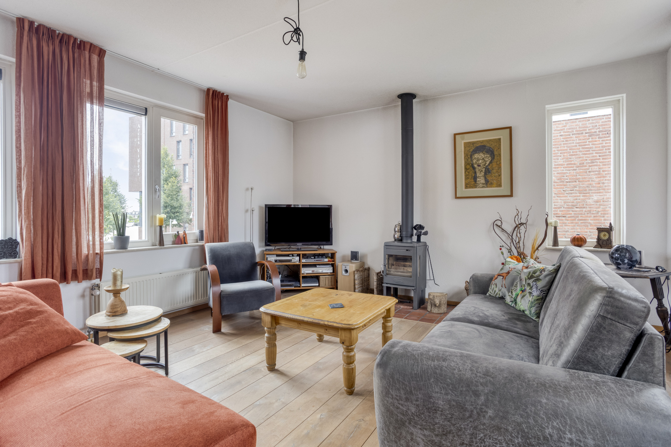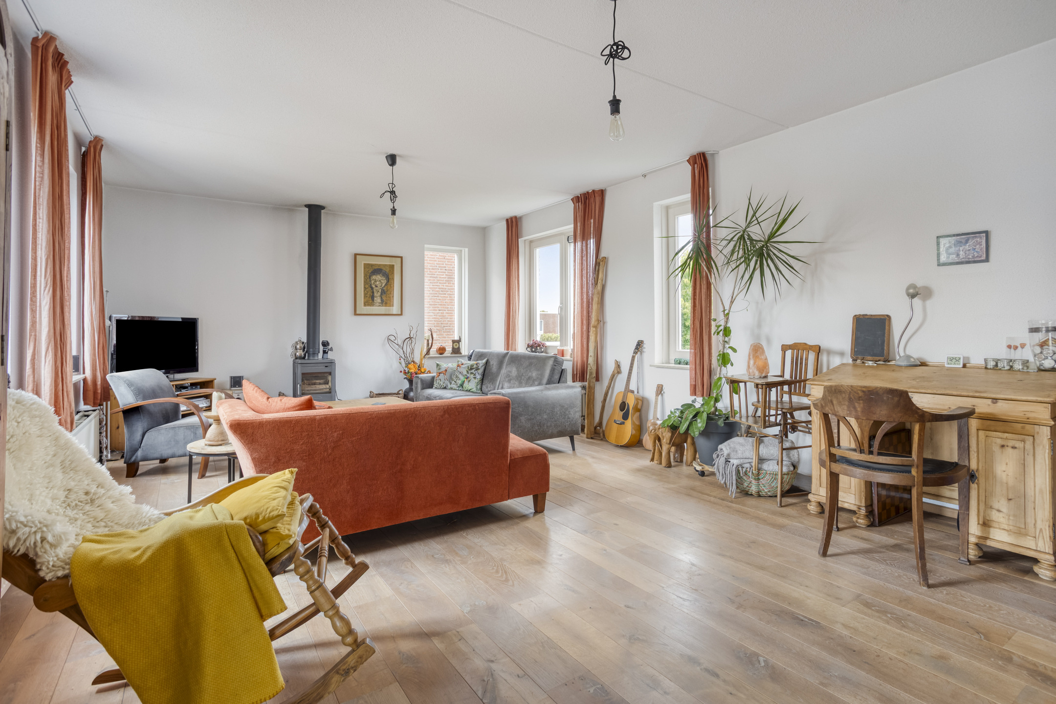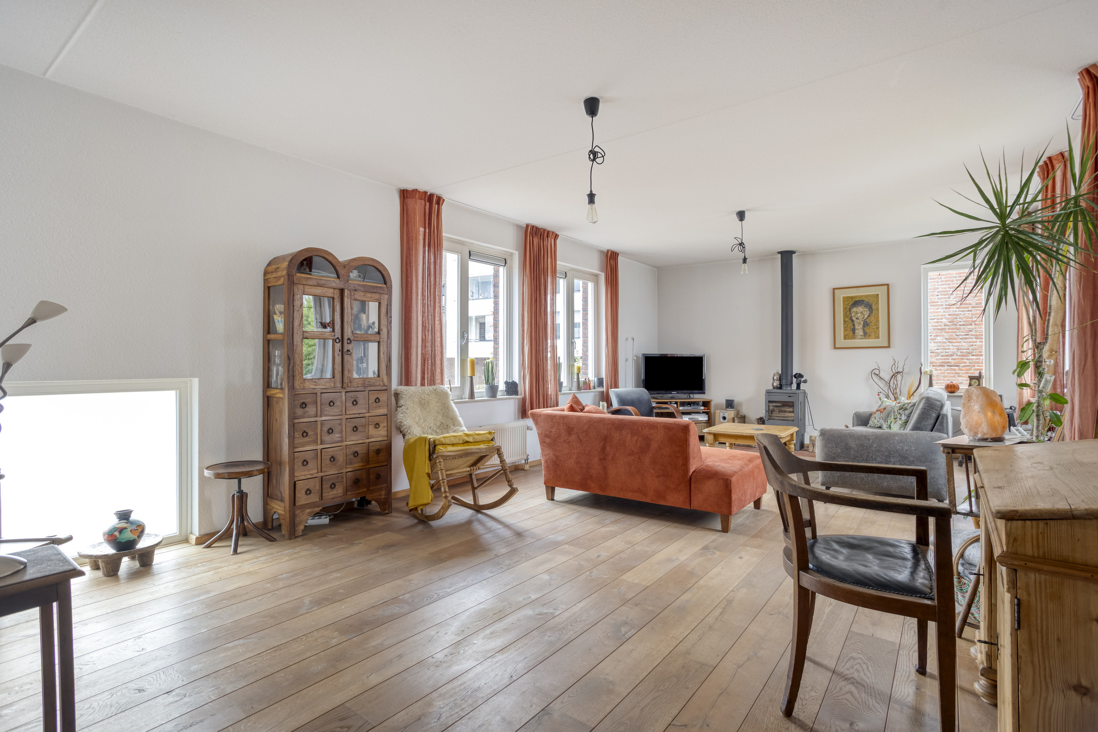 Via de overloop kom je in de woonkamer met veel lichtinval en vrij zicht naar buiten. Grote raampartijen zorgen voor een overvloed aan natuurlijk licht. De sfeervolle houtkachel maakt het plaatje compleet – perfect voor gezellige avonden.