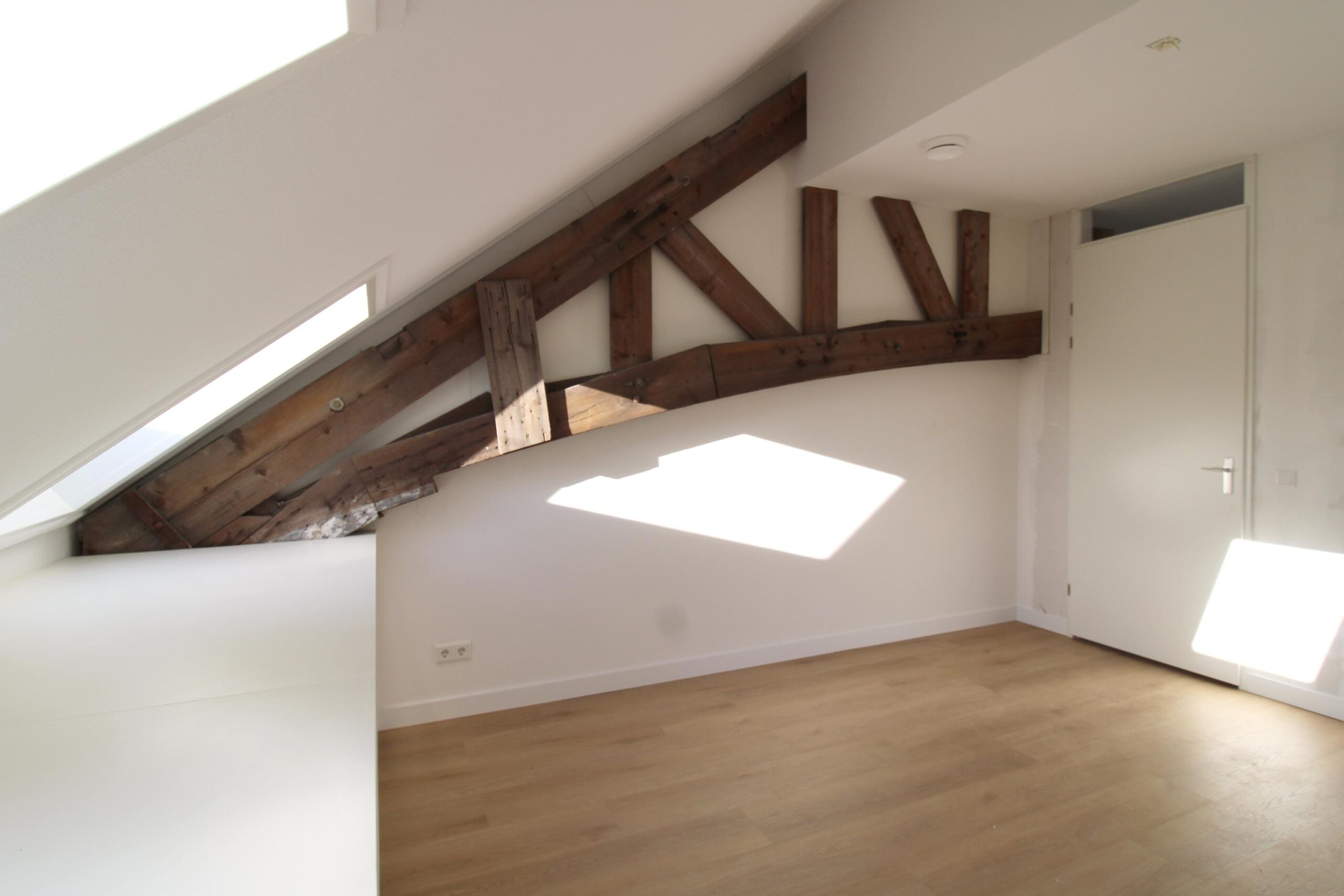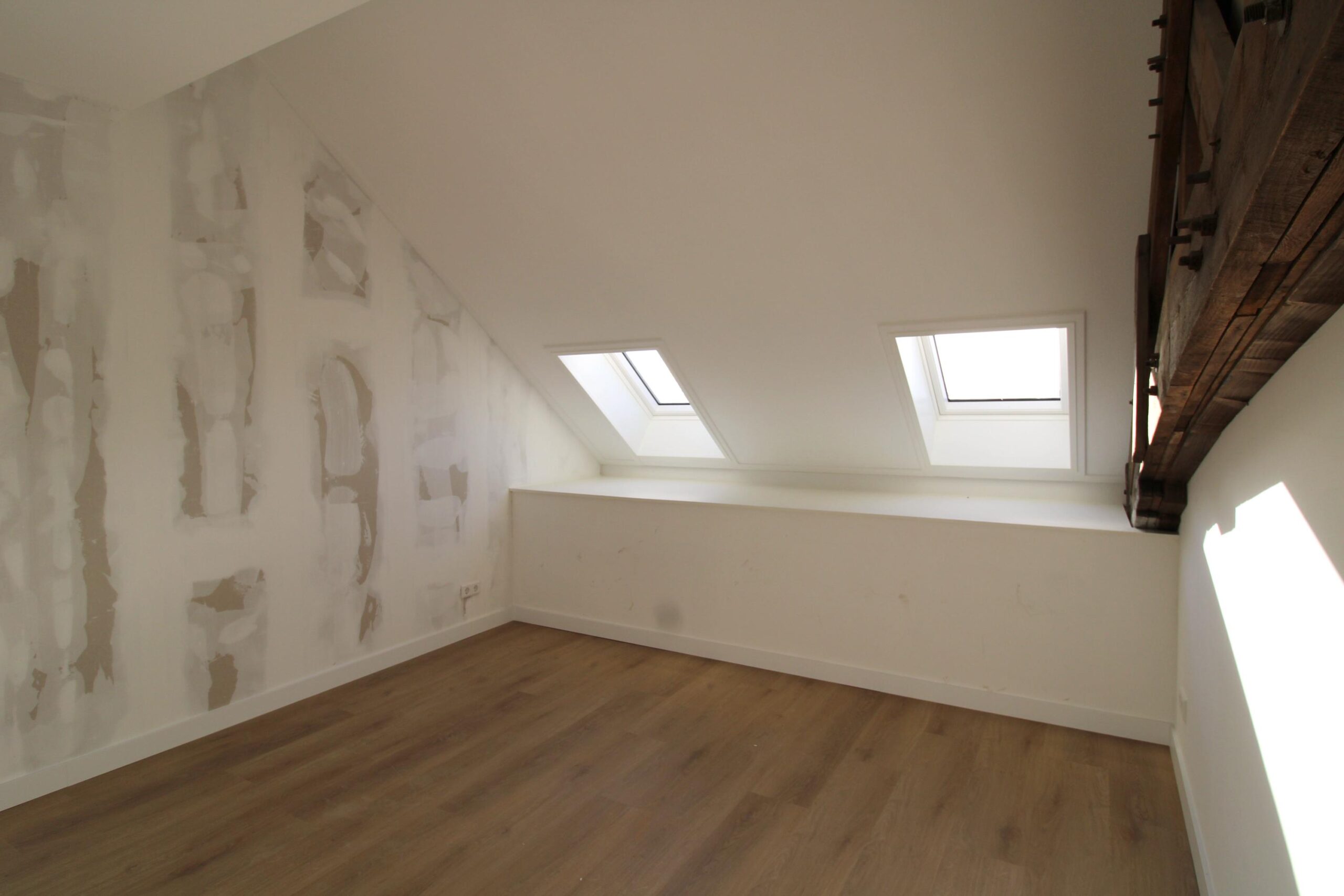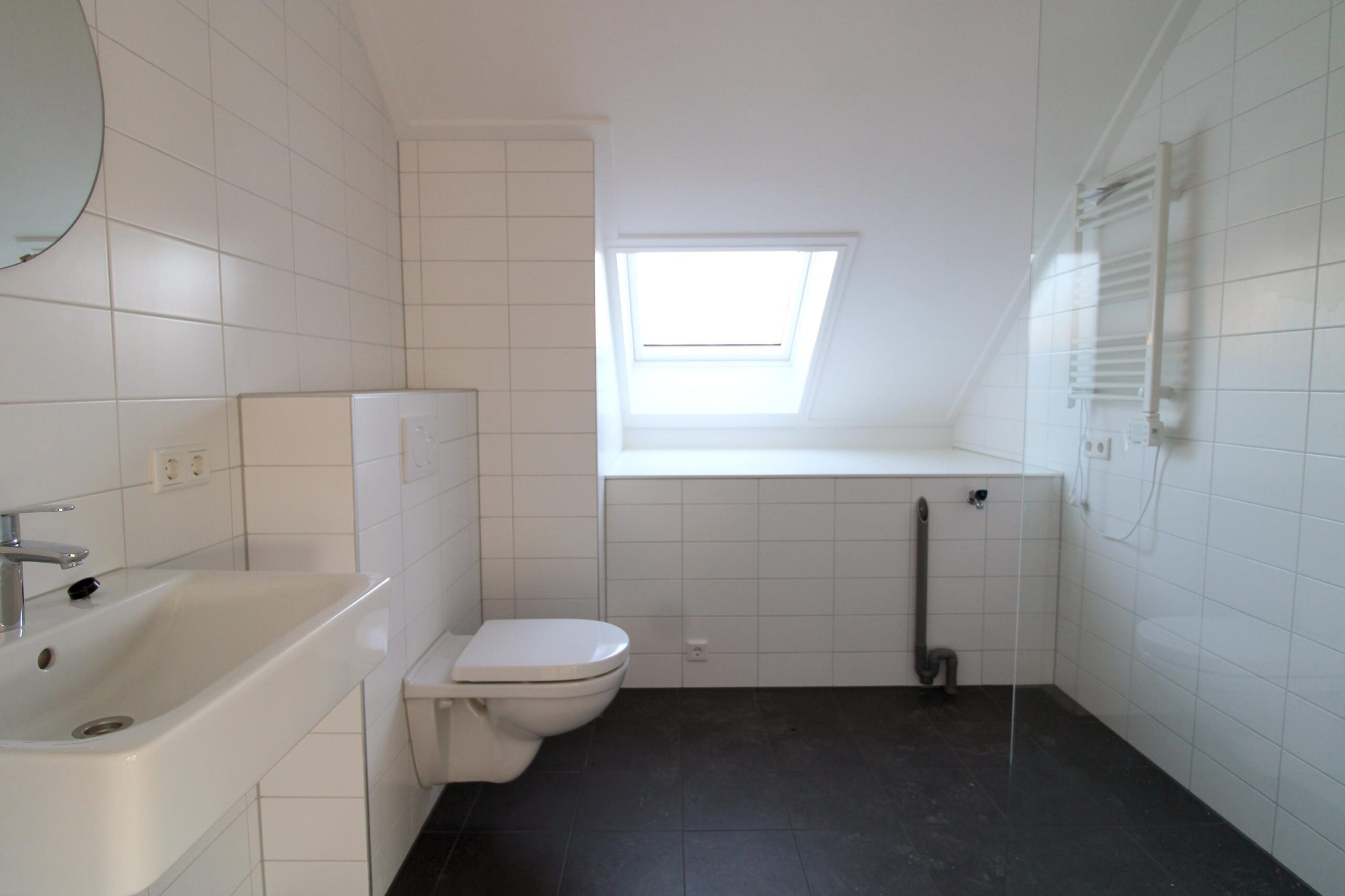 Royale overloop met ruimte voor een werkplek (hier bevindt zich tevens de vlizotrap naar de zolder), de ruime slaapkamer, voorzien van 2 dakramen, complete badkamer met douchehoek, wastafel, toilet en de opstelplaats voor de wasmachine.