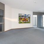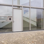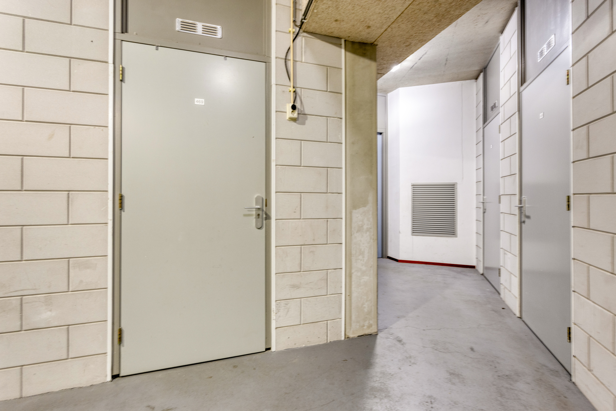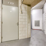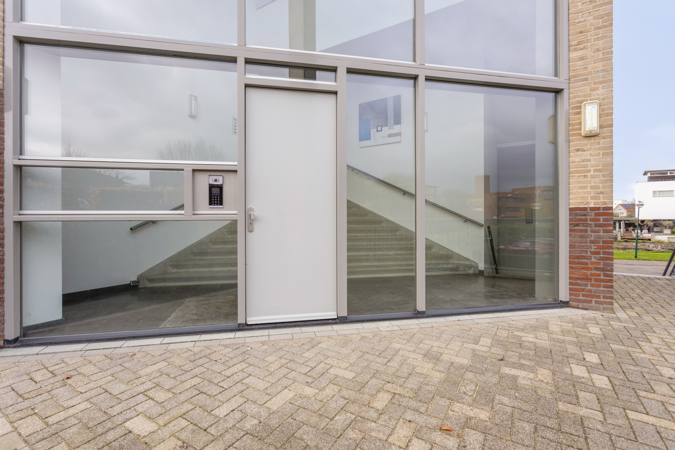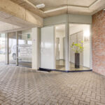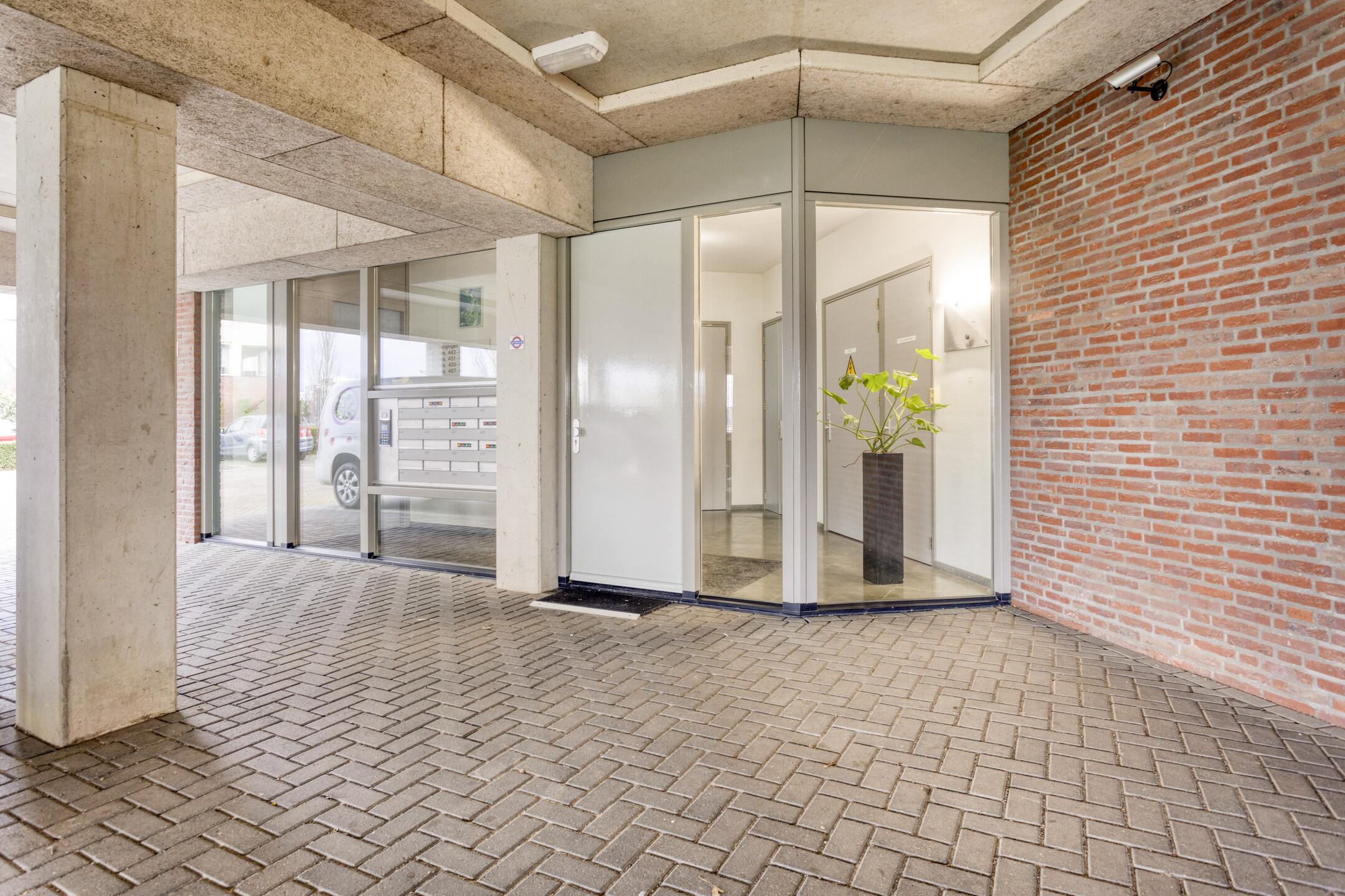 Begane grond: entree van het complex met trappenhuis, lift, videofooninstallatie en toegang tot de bergingen.