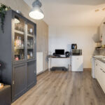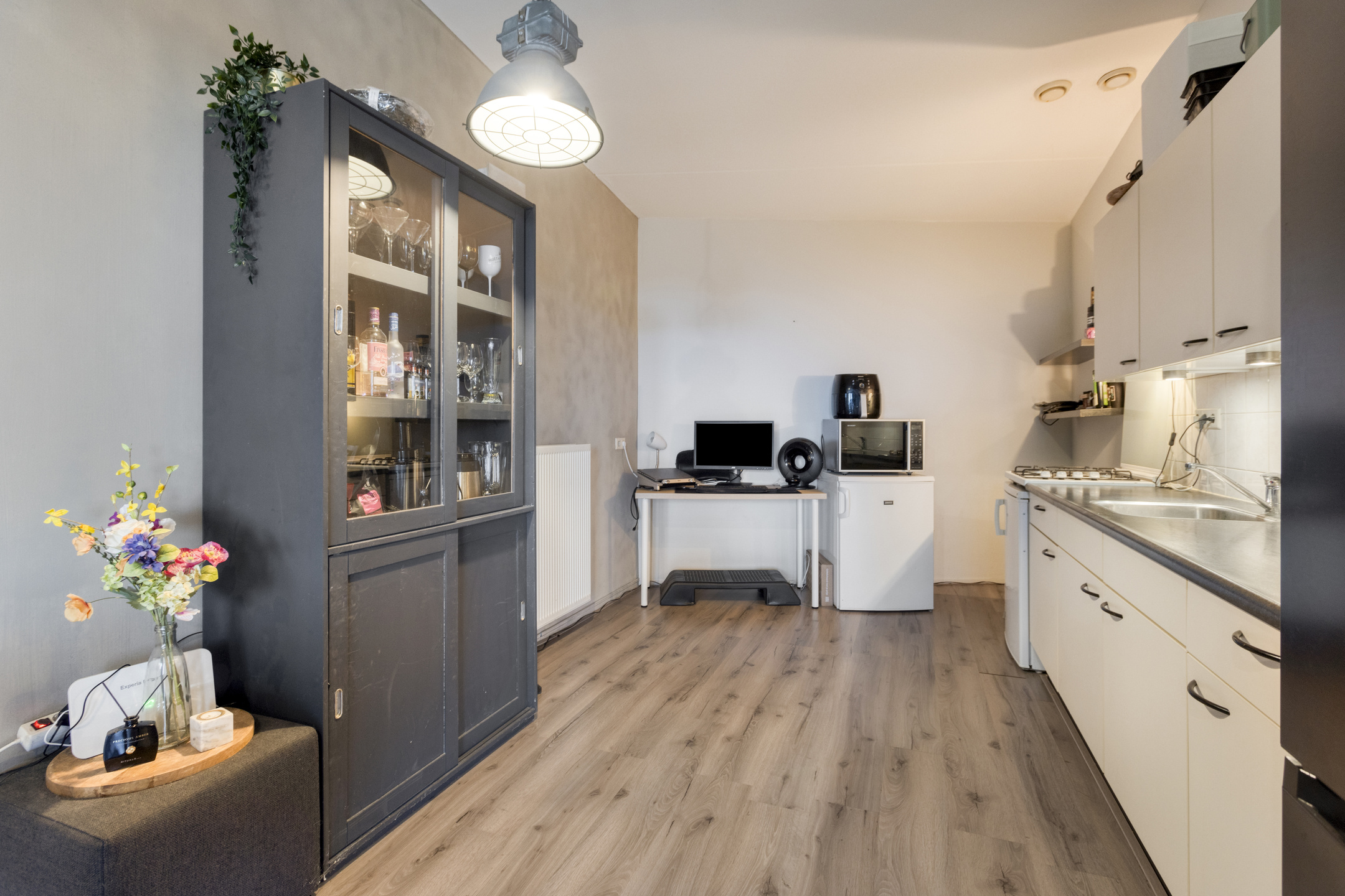De keukenopstelling is voorzien van een 4-pits gaskookplaat en koelkast.