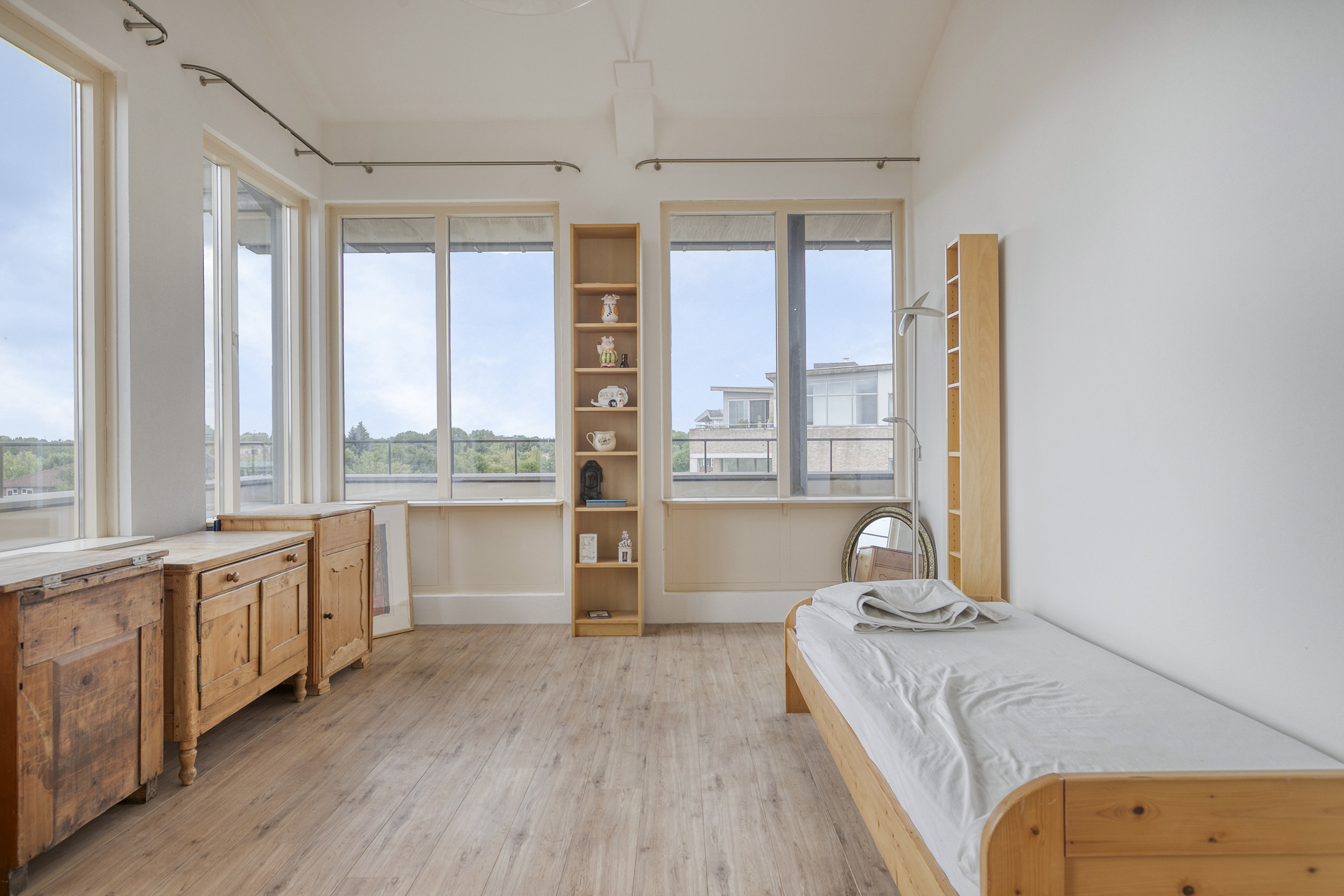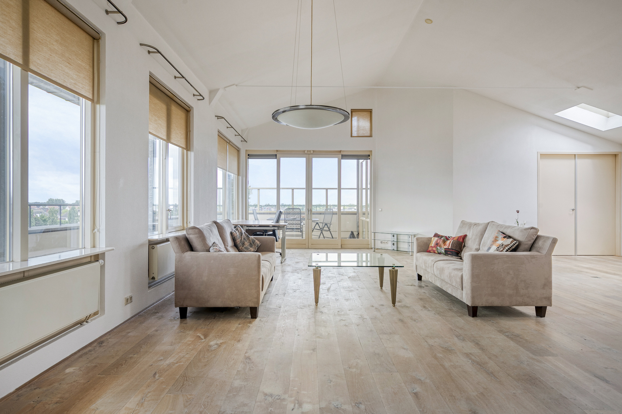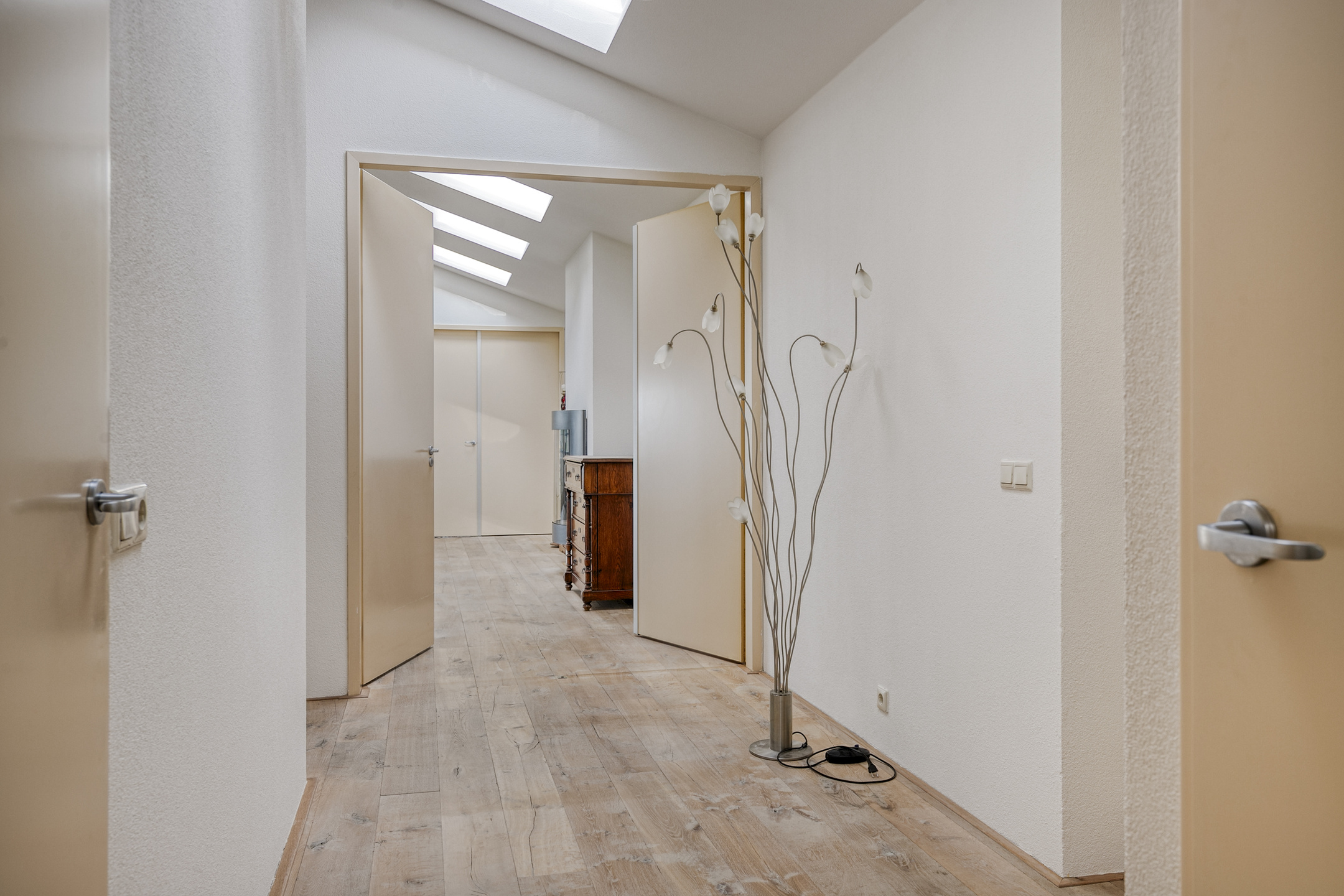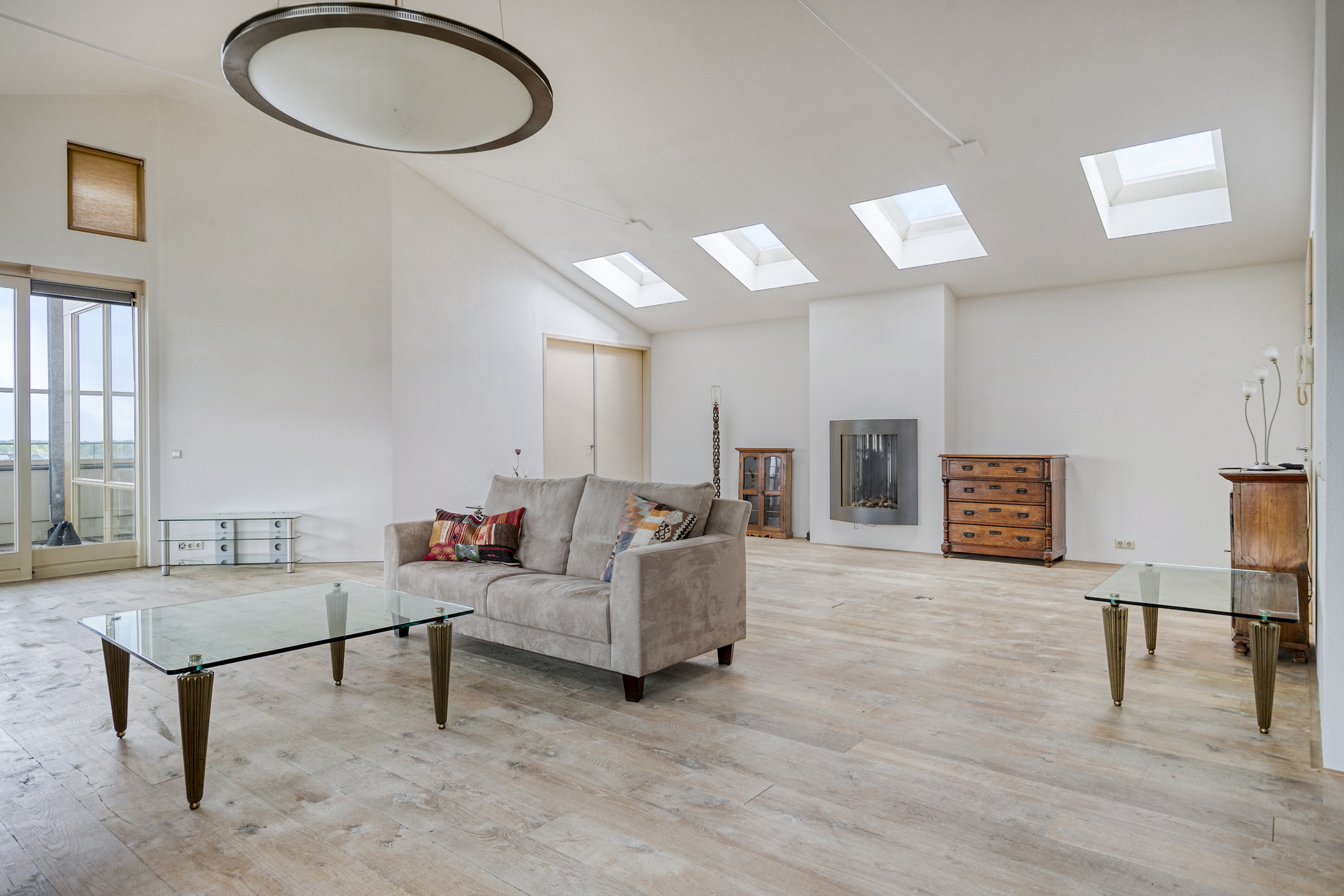 Gelegen op de 4e verdieping, hal met meterkast en garderobenis. Toiletruimte met zwevend toilet, bidet en fonteintje, een inpandige bergruimte met de cv-opstelling en de witgoedaansluitingen. Via de hal kom je in de sfeervolle woonkamer met gashaard, er is veel lichtinval door de vele raampartijen en via de openslaande tuindeuren is het zonneterras toegankelijk. Aansluitend een extra studeer-/ werkkamer met een prachtig uitzicht. Vanuit de woonkamer kom je in de halfopen keuken, voorzien van de benodigde inbouwapparatuur en via de openslaande tuindeuren is er toegang tot de 2e loggia. Vanuit de hal zijn de 3 slaapkamers te bereiken en de geheel betegelde badkamer is voorzien van een ligbad, douche, zwevend toilet en dubbele wastafel.