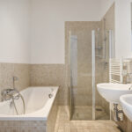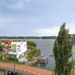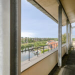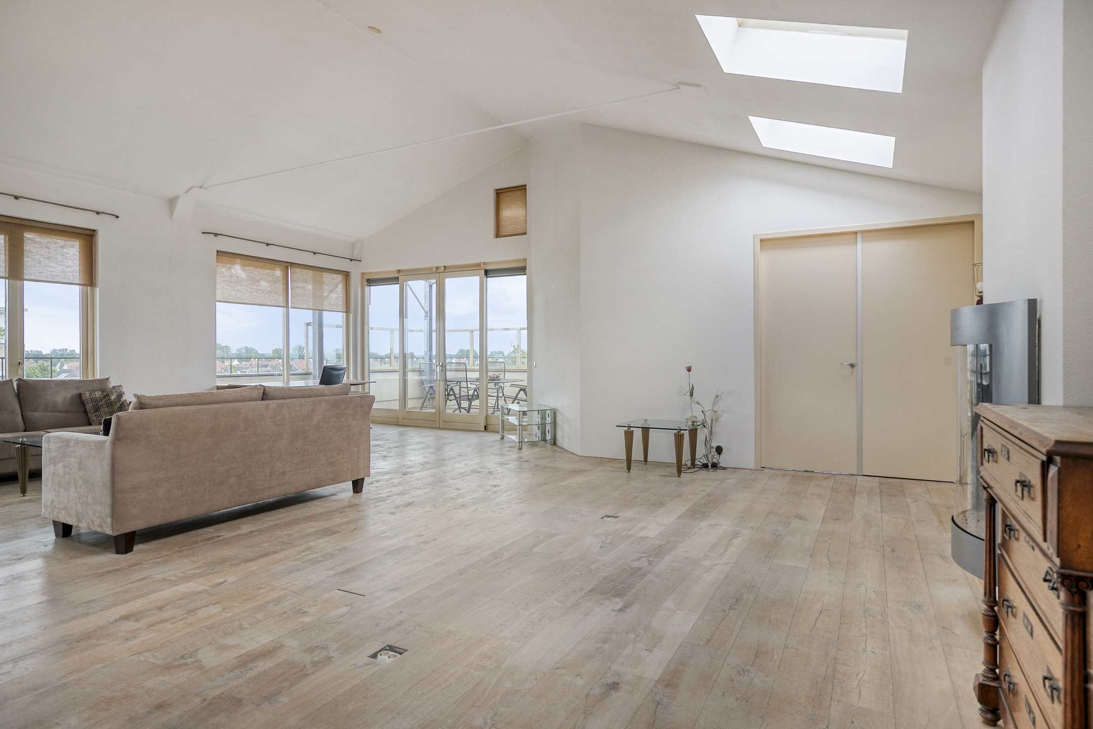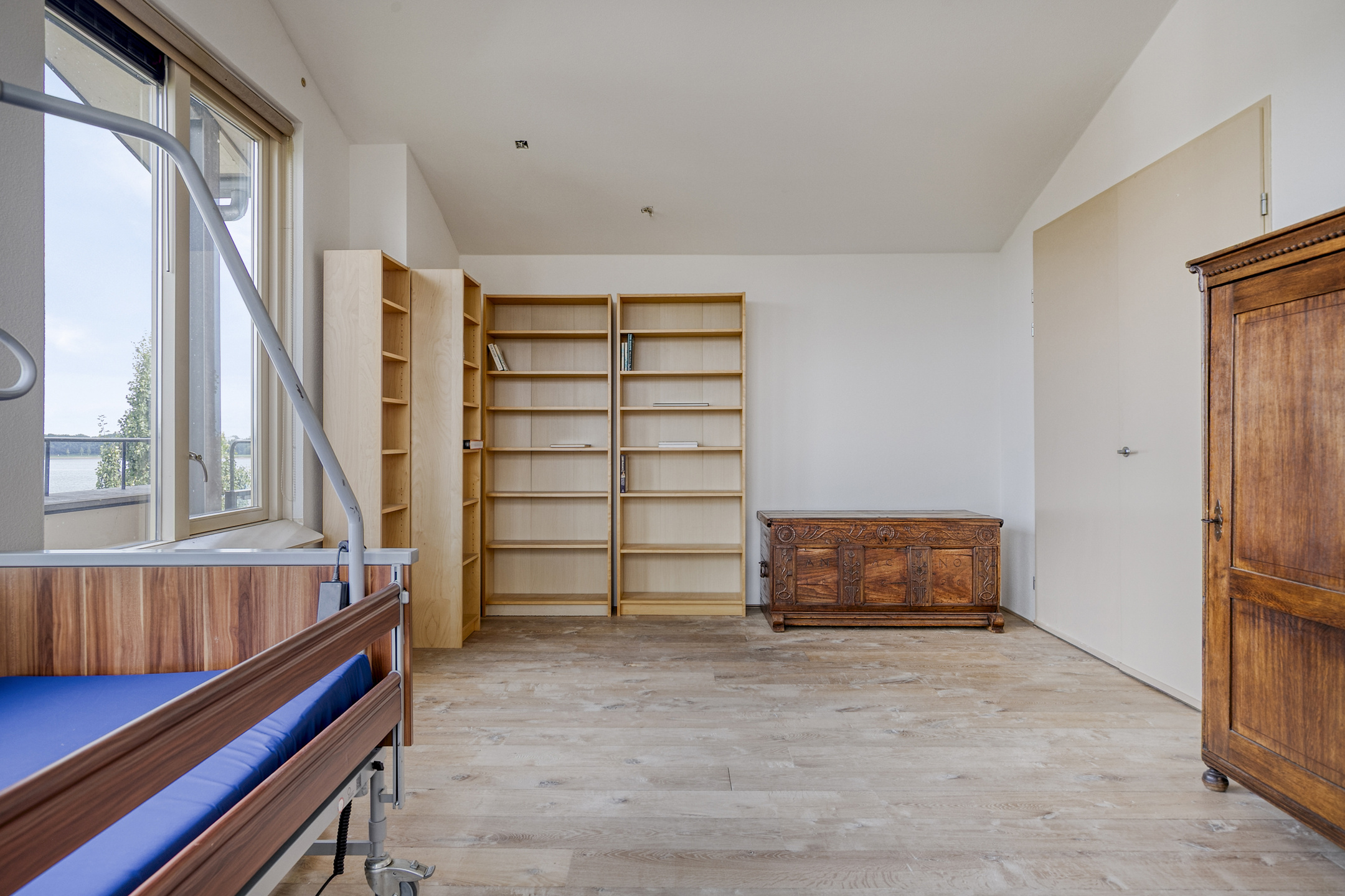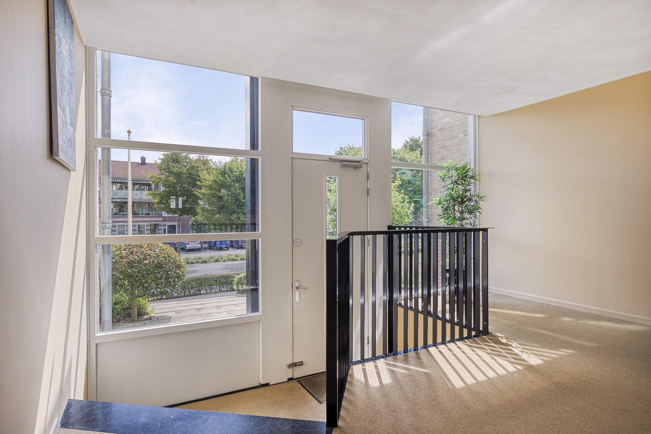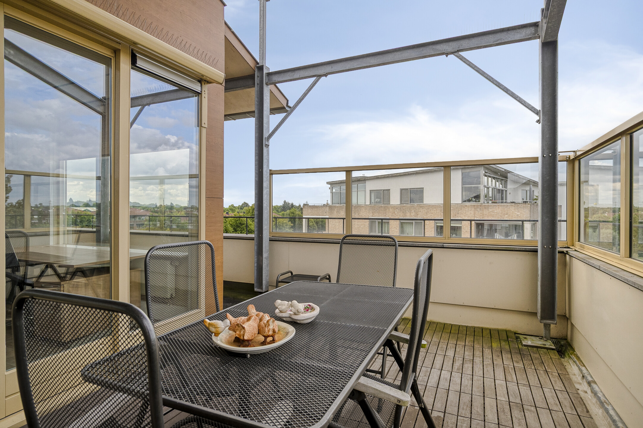 Gelegen op de 4e verdieping, hal met meterkast en garderobenis. Toiletruimte met zwevend toilet, bidet en fonteintje, een inpandige bergruimte met de cv-opstelling en de witgoedaansluitingen. Via de hal kom je in de sfeervolle woonkamer met gashaard, er is veel lichtinval door de vele raampartijen en via de openslaande tuindeuren is het zonneterras toegankelijk. Aansluitend een extra studeer-/ werkkamer met een prachtig uitzicht. Vanuit de woonkamer kom je in de halfopen keuken, voorzien van de benodigde inbouwapparatuur en via de openslaande tuindeuren is er toegang tot de 2e loggia. Vanuit de hal zijn de 3 slaapkamers te bereiken en de geheel betegelde badkamer is voorzien van een ligbad, douche, zwevend toilet en dubbele wastafel.