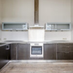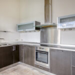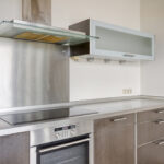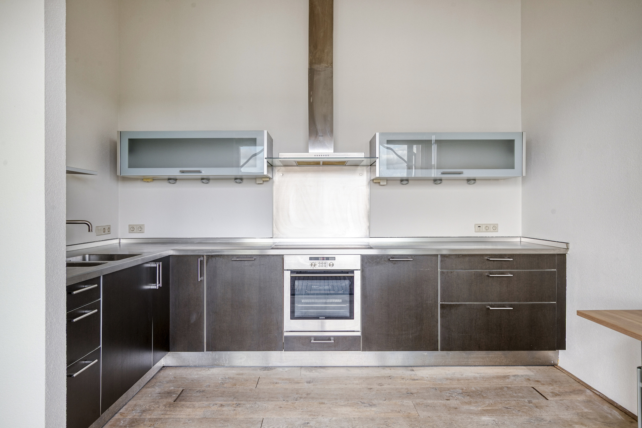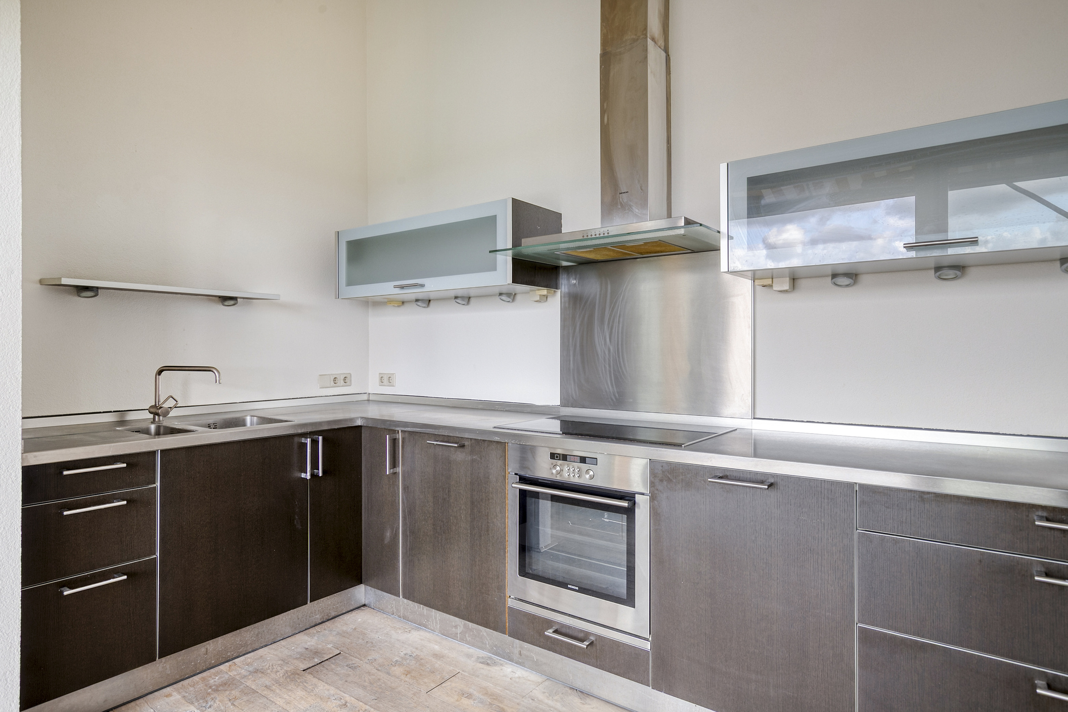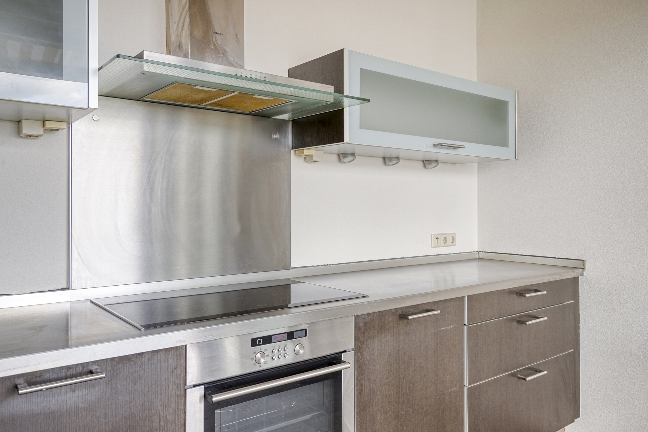 De keukeninrichting bestaat uit een vaatwasser, koelkast, oven en inductiekookplaat met afzuigkap,