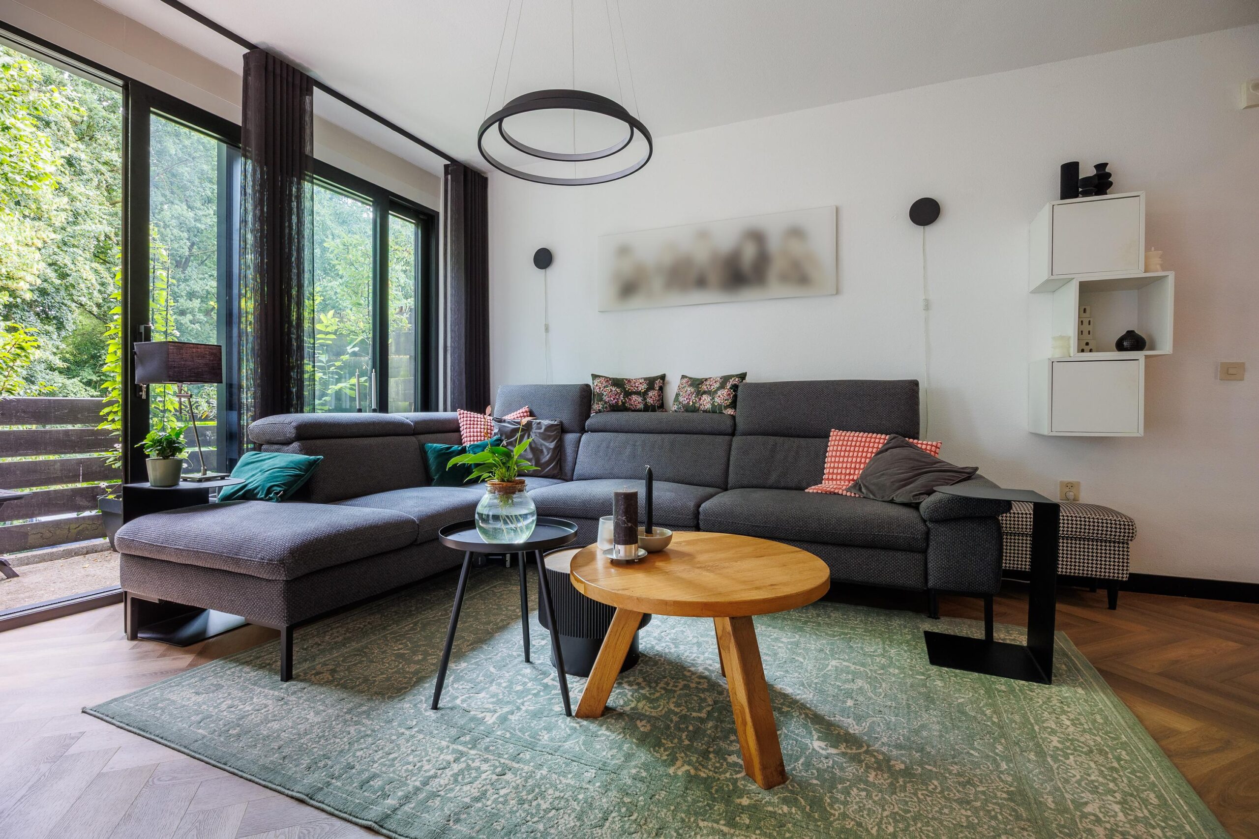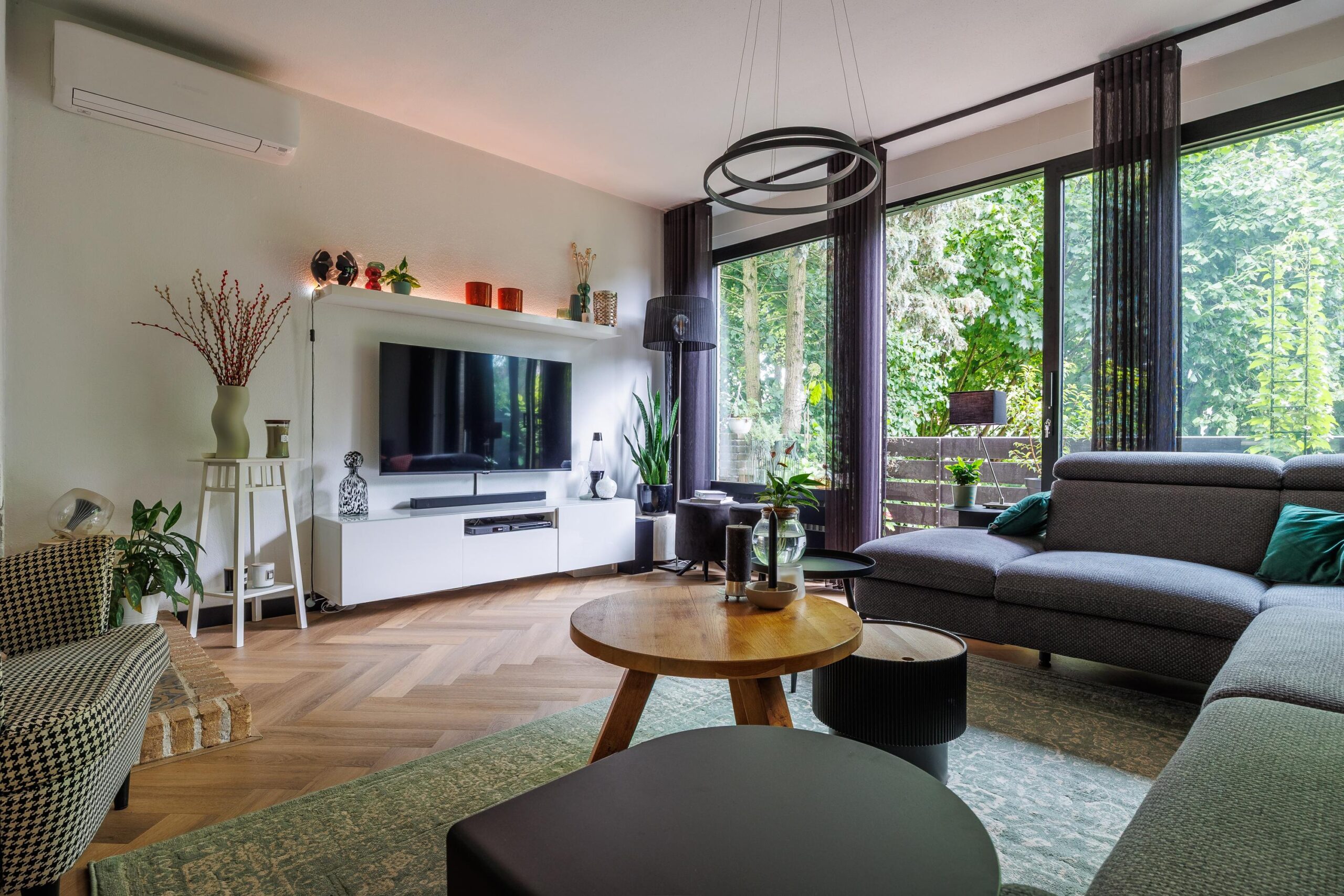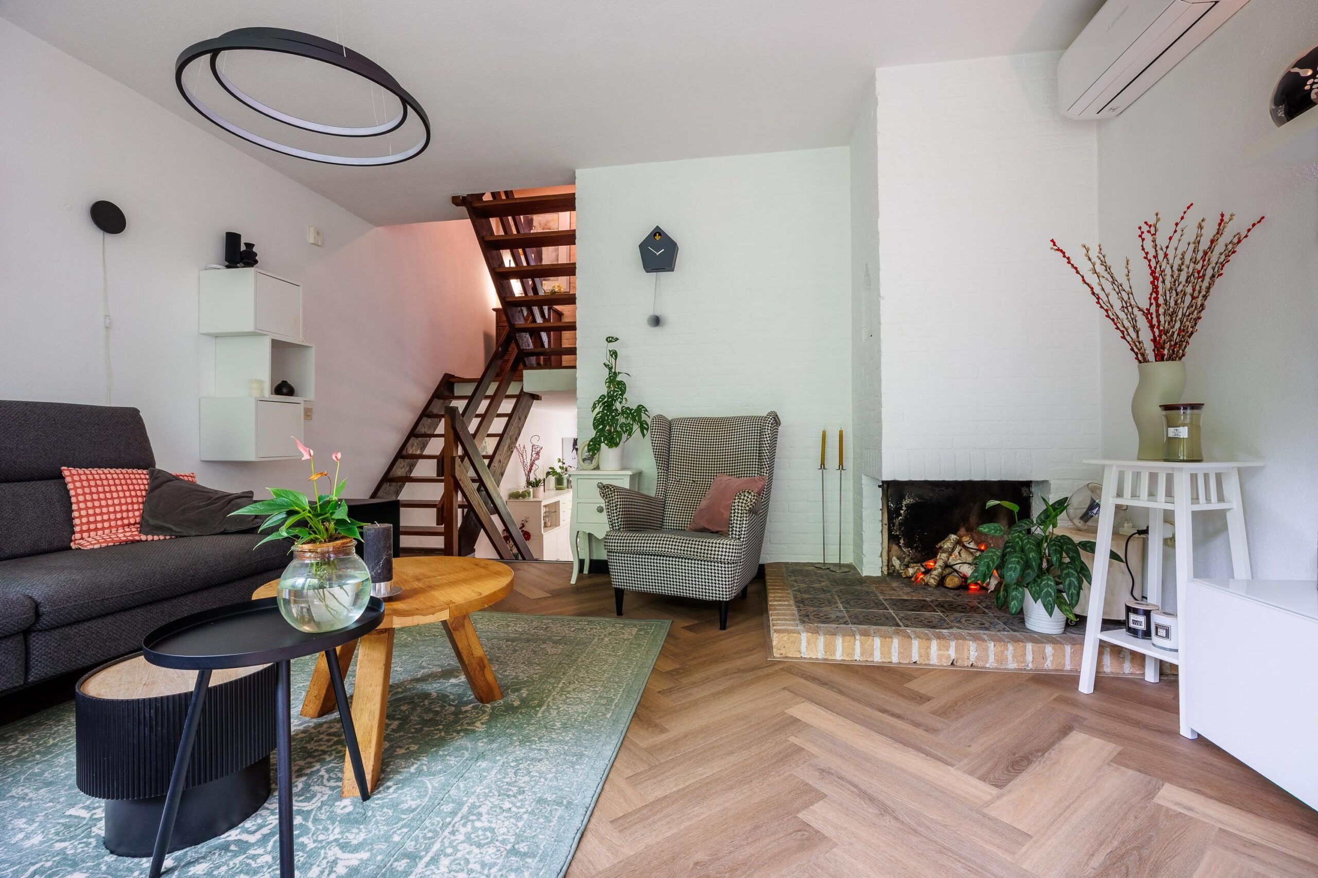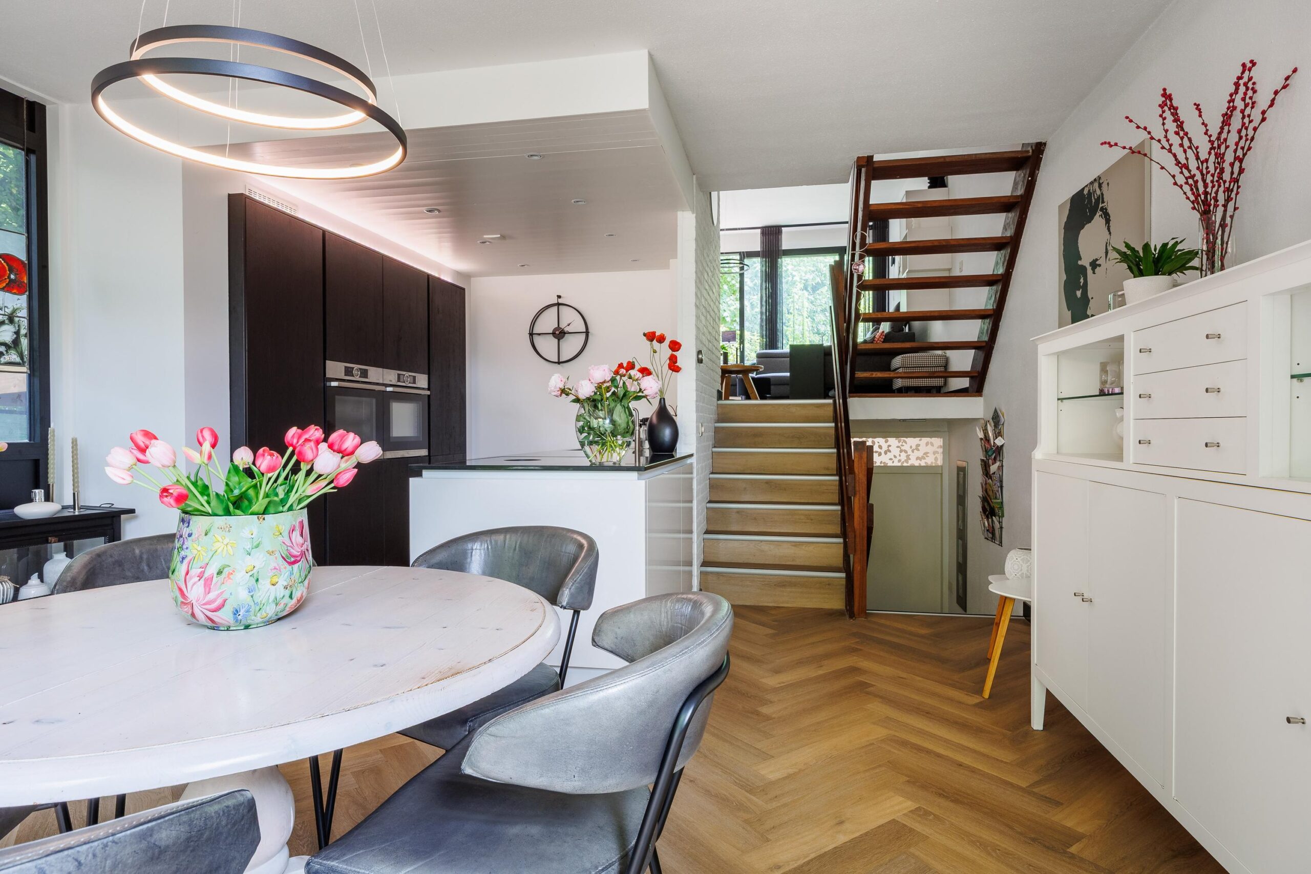 1e verdieping: moderne woonkeuken, schuifpui naar tuin, opgang naar de woonkamer (met airco) en aansluitend via schuifpui naar het balkon.