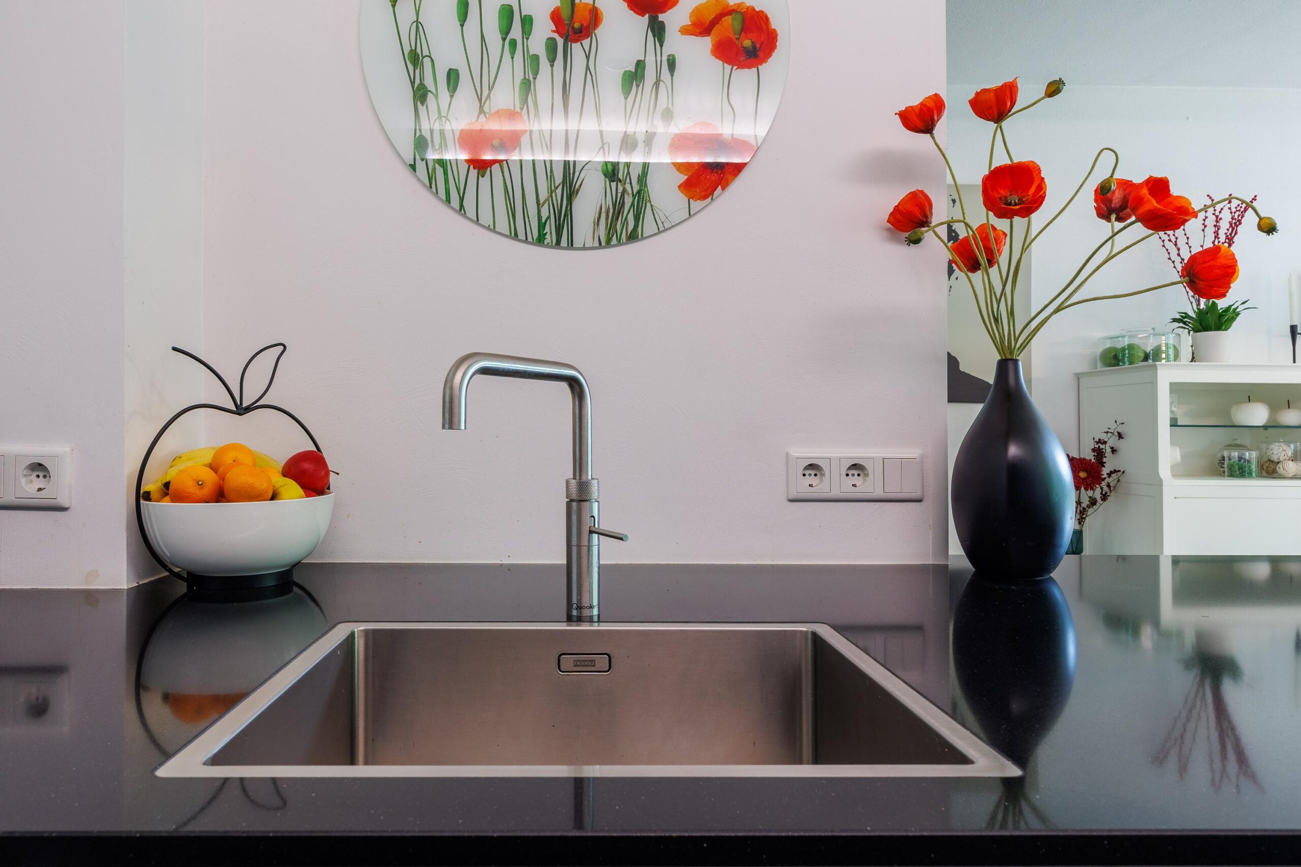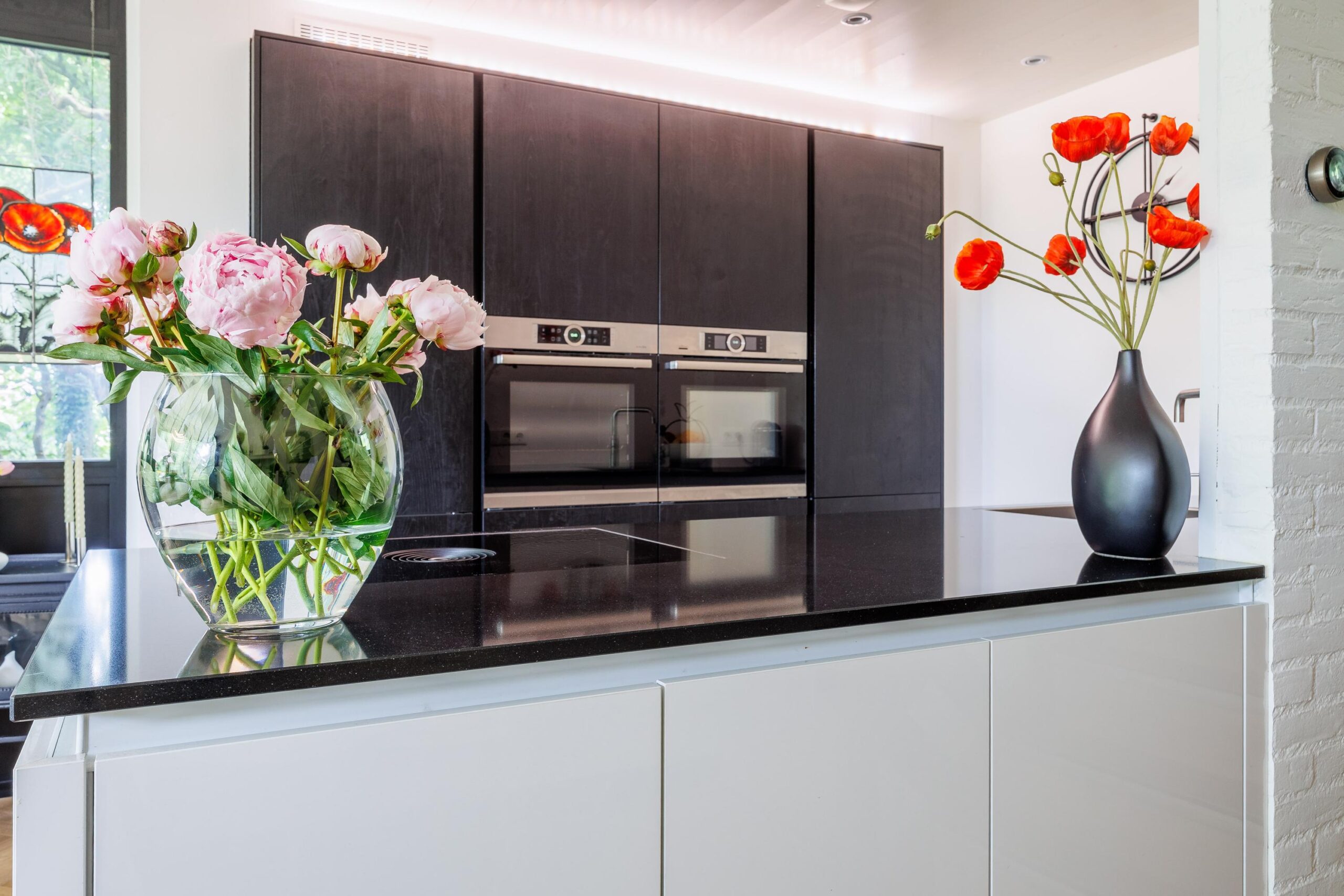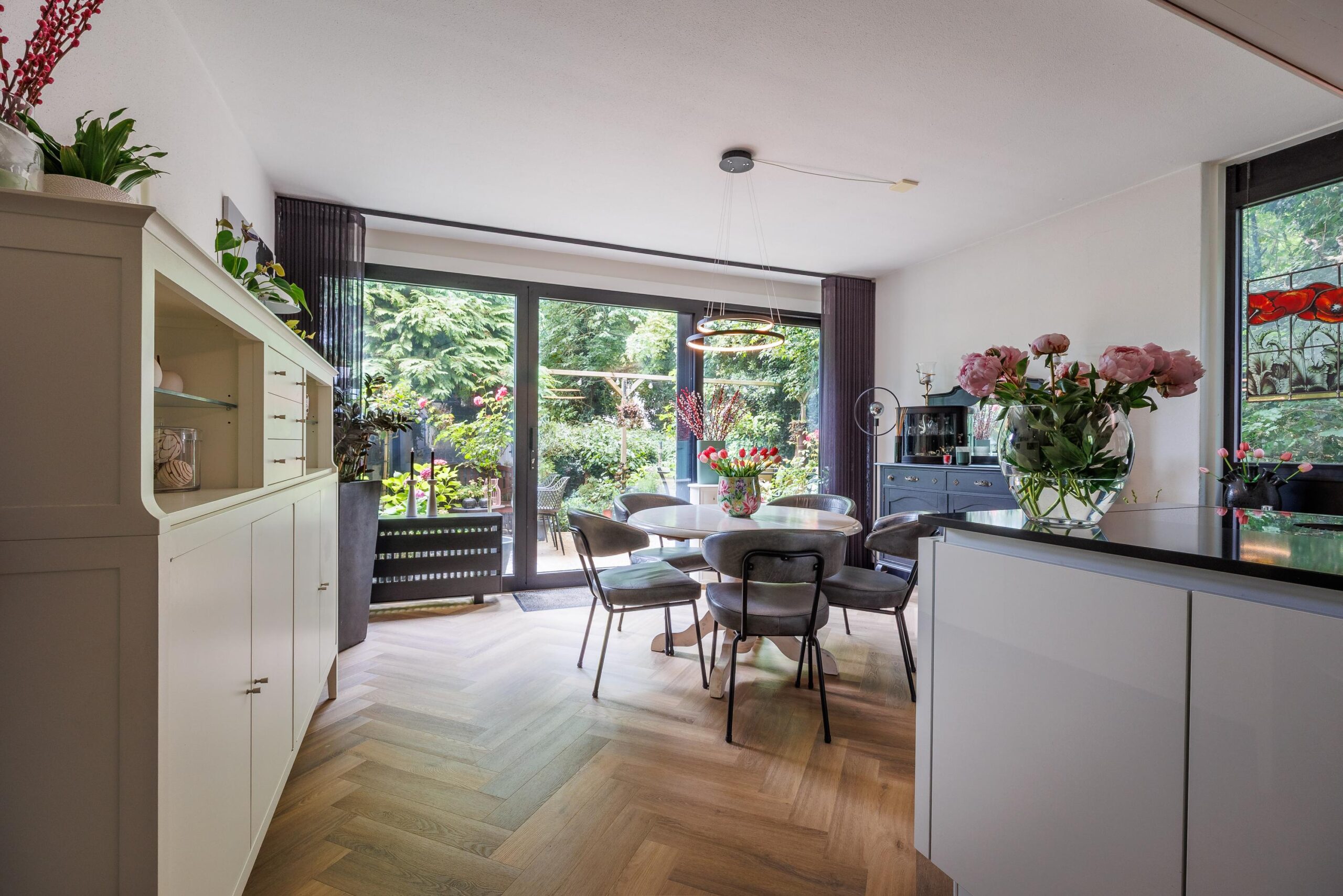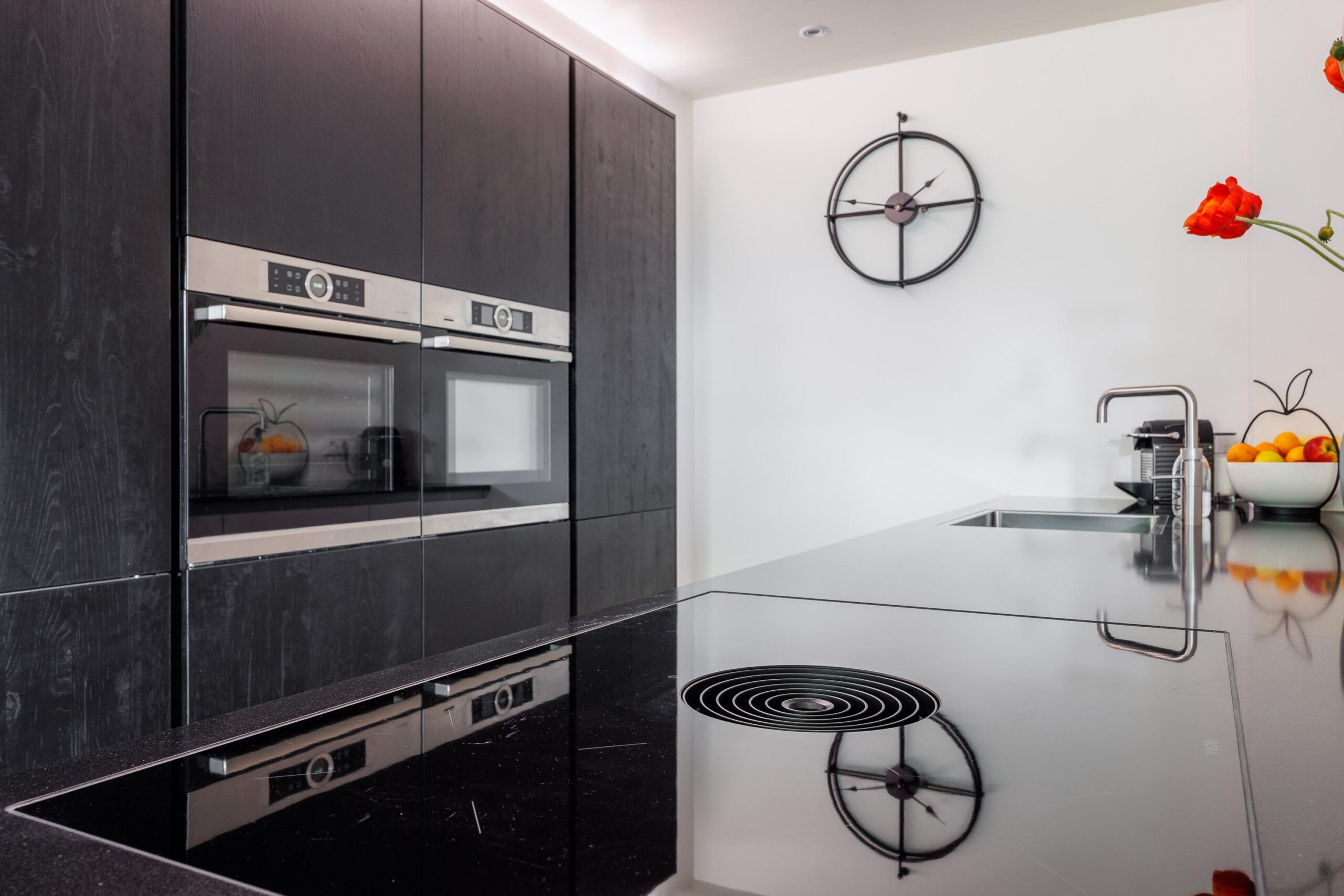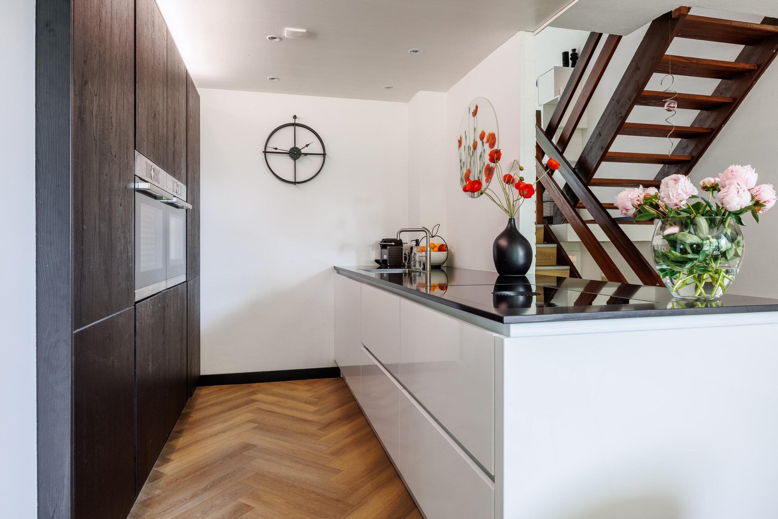 De moderne keukenopstelling (2021) is voorzien van de volgende inbouwapparatuur: BORA inductiekookplaat met downdraft systeem, Quooker, extra grote koelkast, vaatwasser, combioven en een oven.