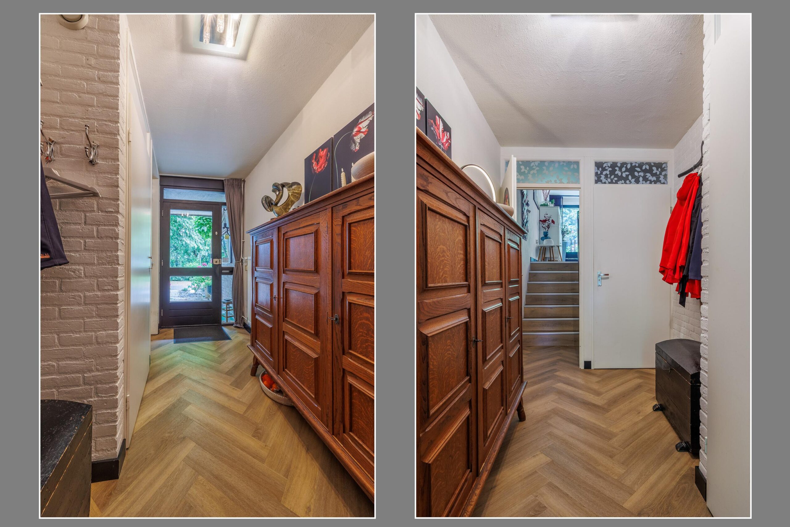 Begane grond: hal, garage (met lage toegang tot het souterrain) toilet en opgang naar de keuken.